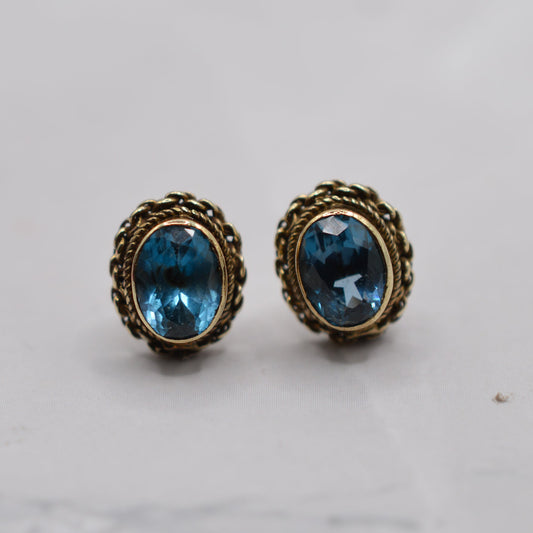 1990s 9ct Gold Blue Topaz Stud Earrings with Rope-Twist Border