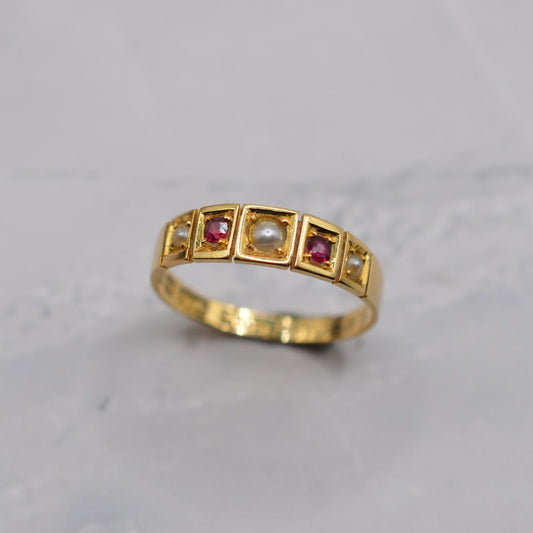 Antique 1897 18ct Gold Ruby & Pearl Five-Stone Ring