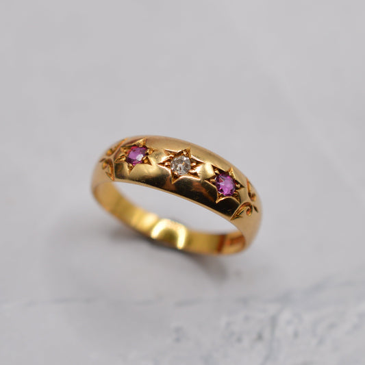 Antique Victorian 1898 18ct Gold Ruby & Diamond Starburst Gypsy Ring