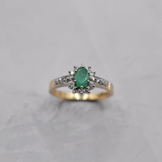1990s 9ct Gold Emerald & Diamond Cluster Ring