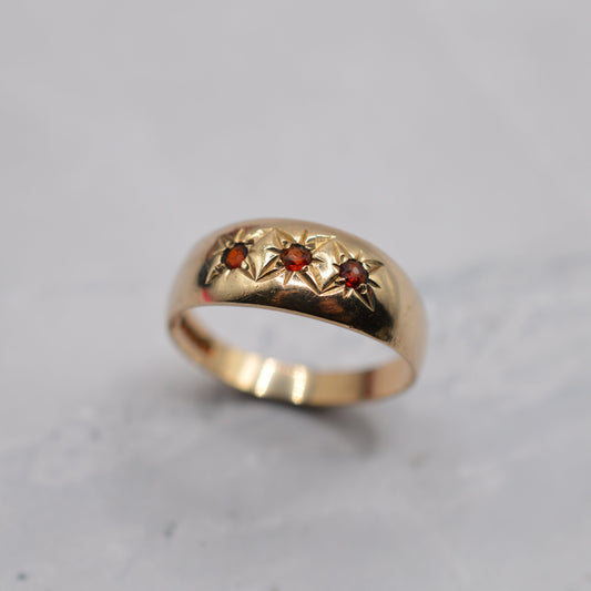 1970s Chunky Vintage 9ct Gold Garnet Gypsy Trilogy Ring