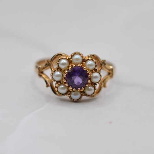 1980s Vintage 9ct Gold Amethyst & Pearl Floral Cluster Ring