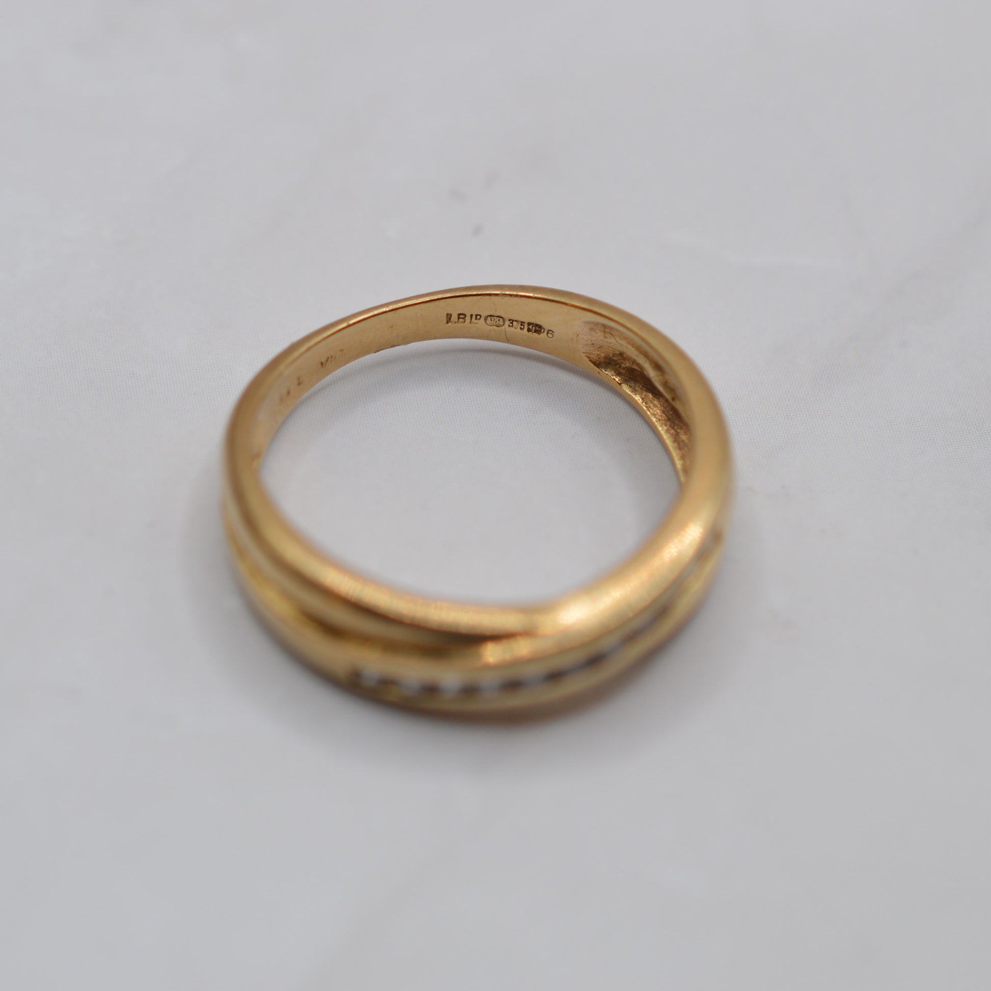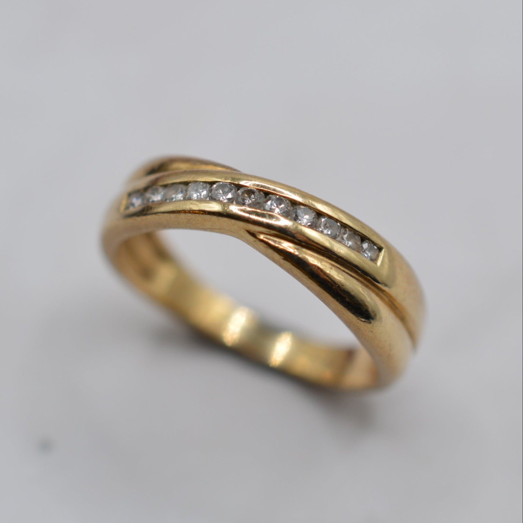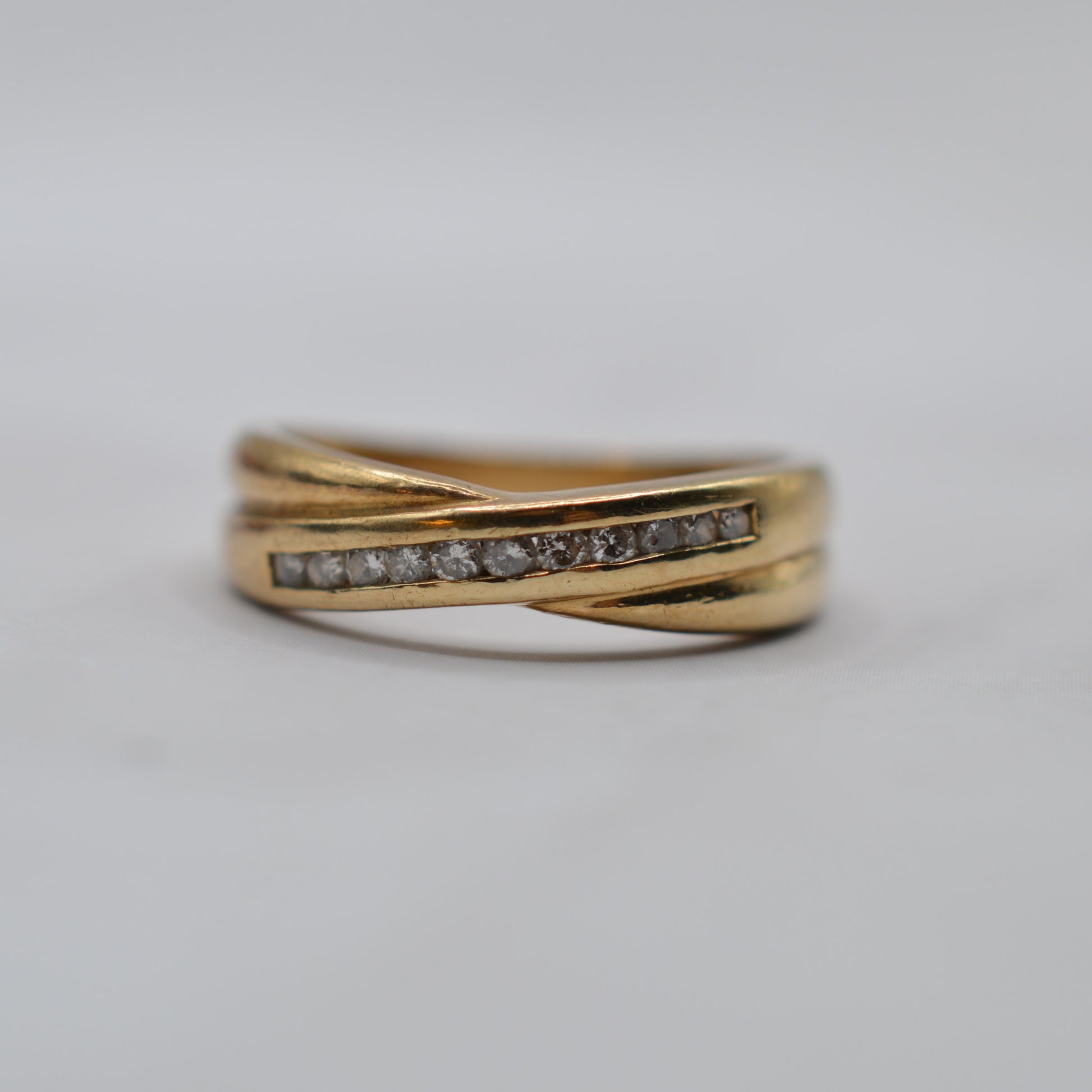 A rather gorgeous vintage 9ct gold diamond crossover ring. Featuring a thick gold band with an exquisite crossover design, this fabulous piece is adorned with 11 channel-set diamonds that add a pop of sparkle -- a perfect blend of luxury and versatility!