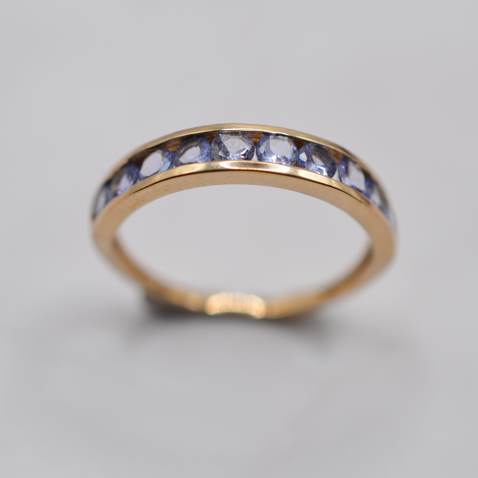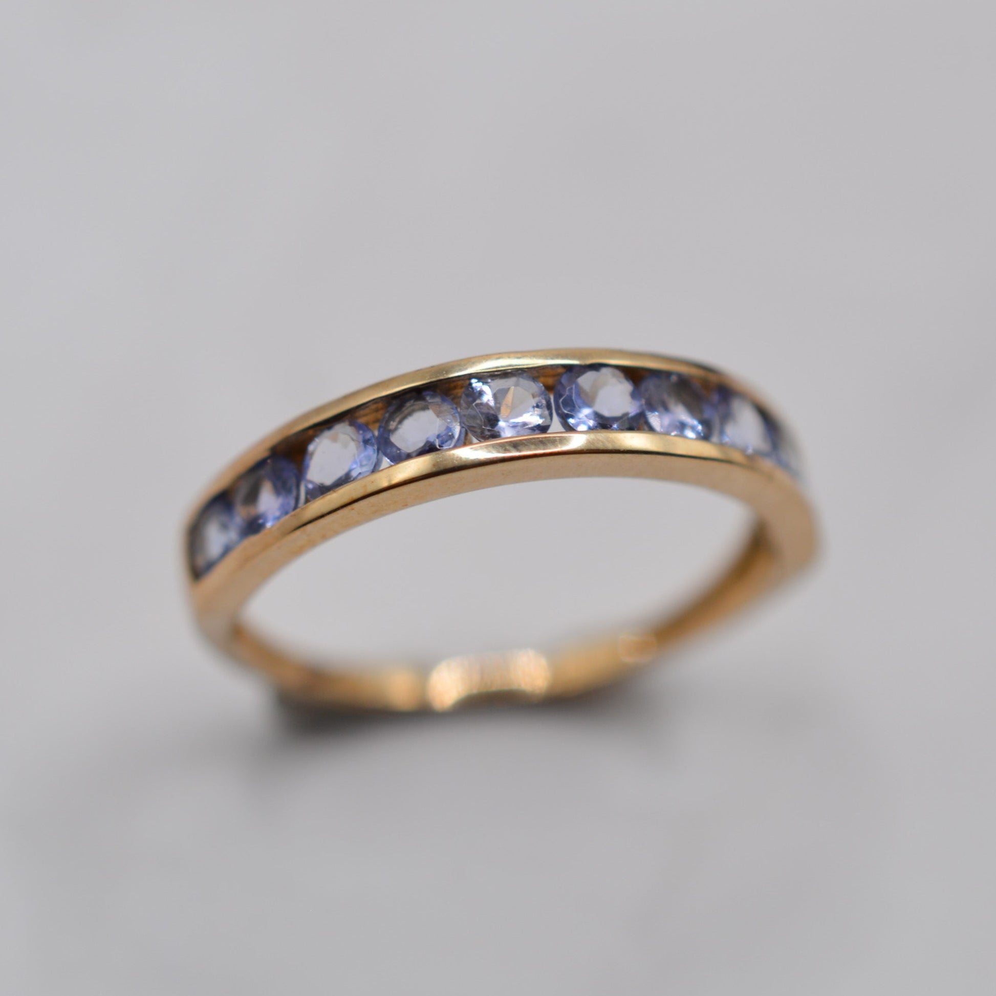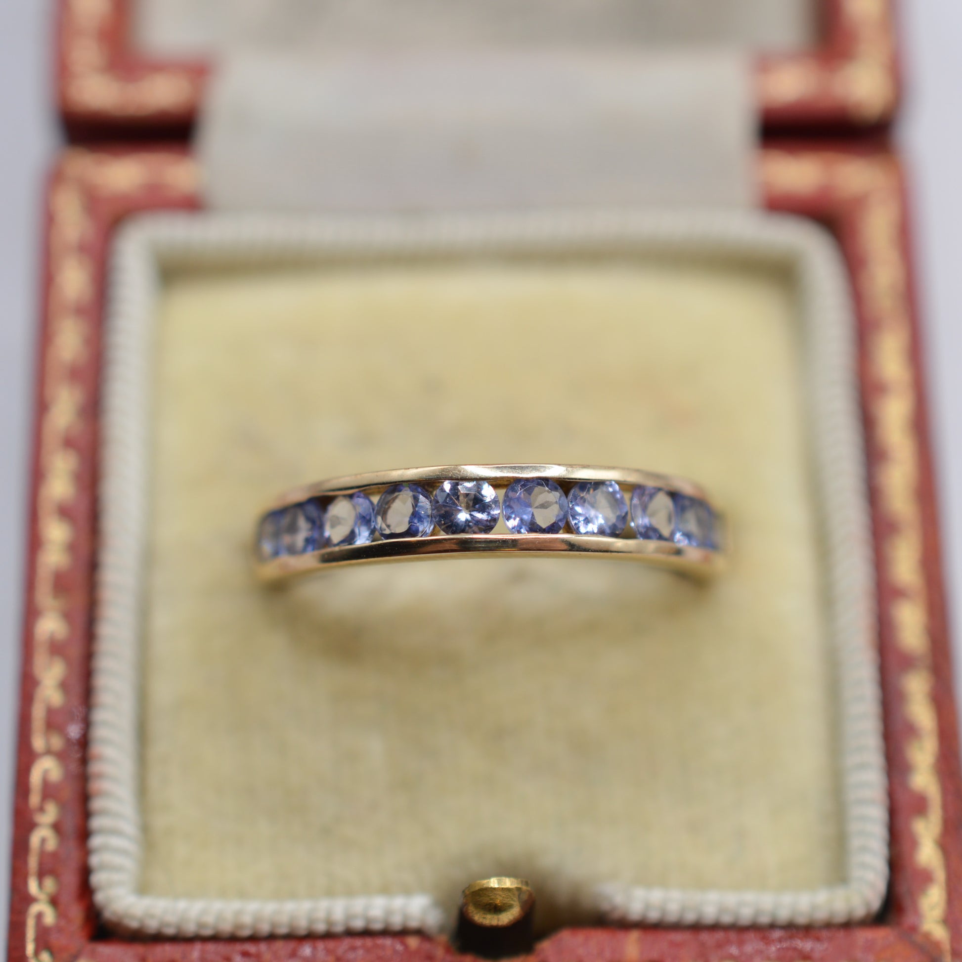 An utterly beeeautiful 9ct gold tanzanite half-eternity ring. This stunning preloved treasure features ten round-cut tanzanites in that classic lilac-blue shade the stone is known for, all channel-set into a polished, shiny gold band. The gemstones are bright and well-matched, creating a lovely shimmer across the finger. A perfect stacker or stunning on its own, this ring adds a touch of luxury to any look.