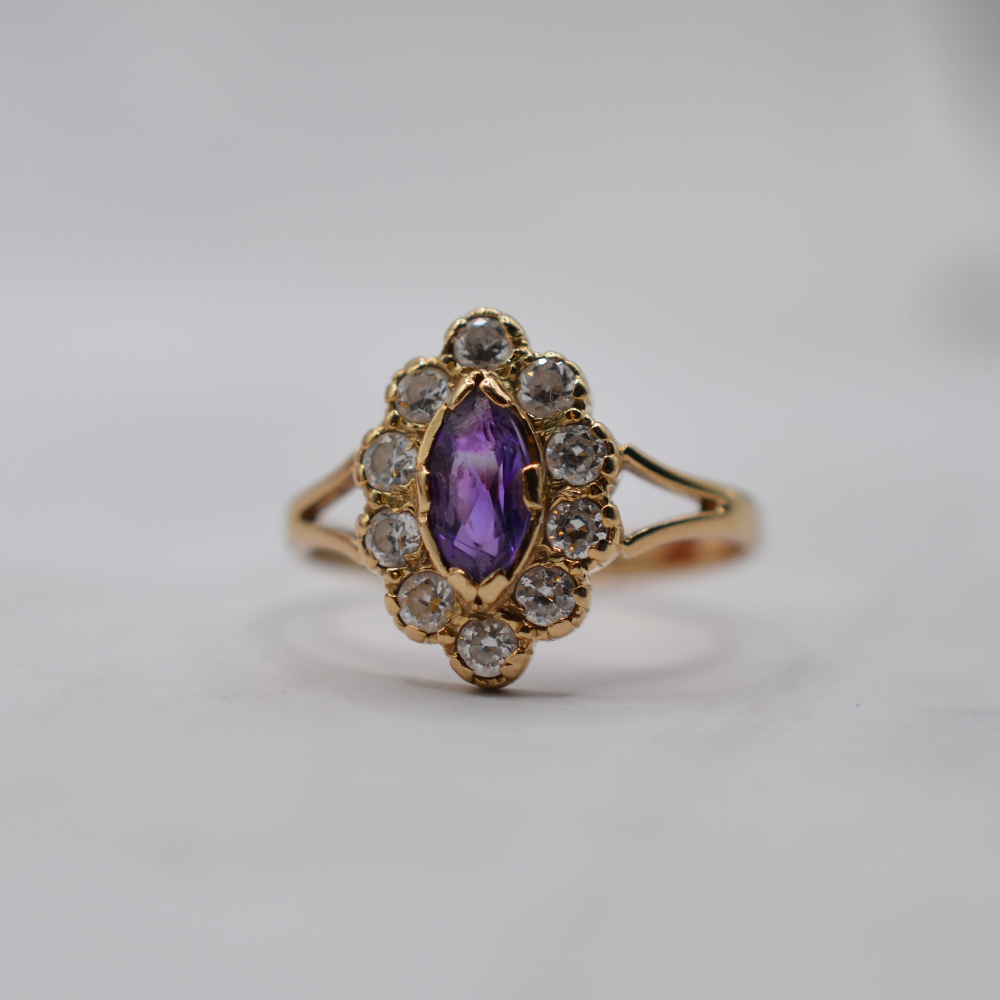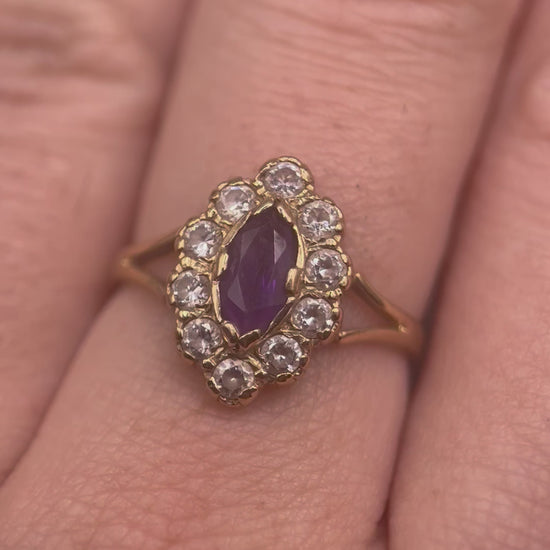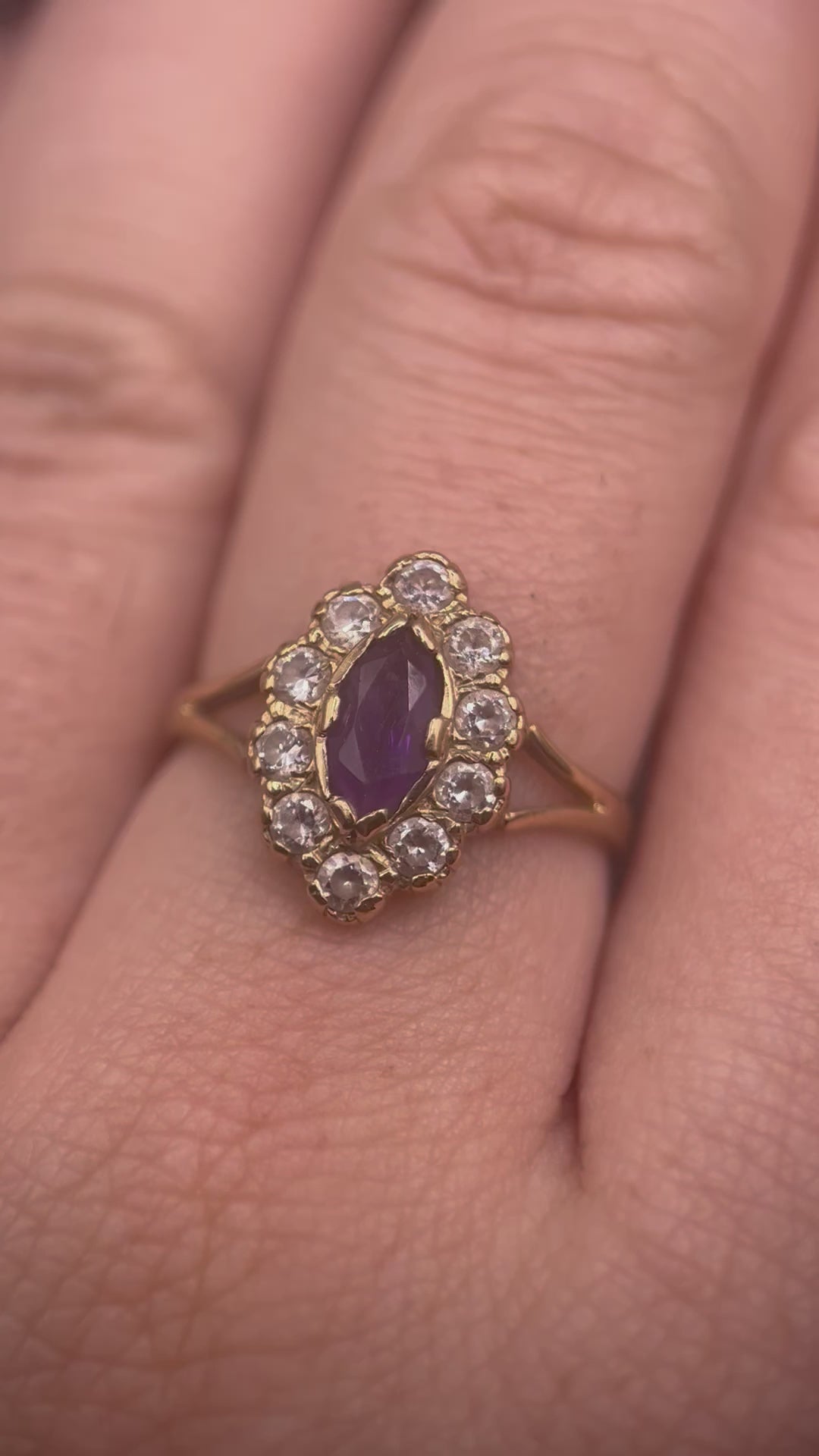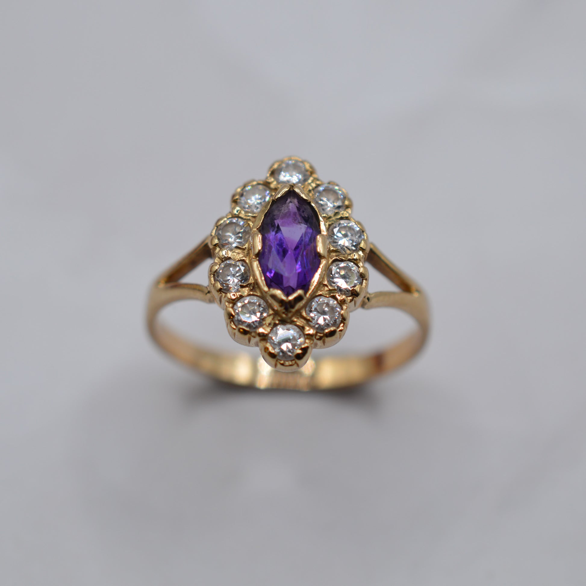 An absolutely gorgeous and unique vintage 9ct gold amethyst and cubic zirconia cocktail ring. This eye-catching 1990s piece features a large, marquise-shaped amethyst at its centre in a beautiful shade of purple, surrounded by a halo of ten sparkling cubic zirconia stones. Such wonderfully regal and luxurious charm!