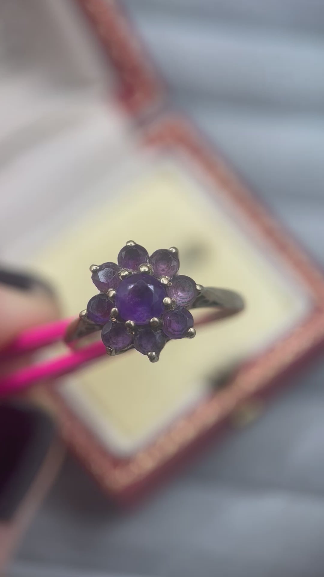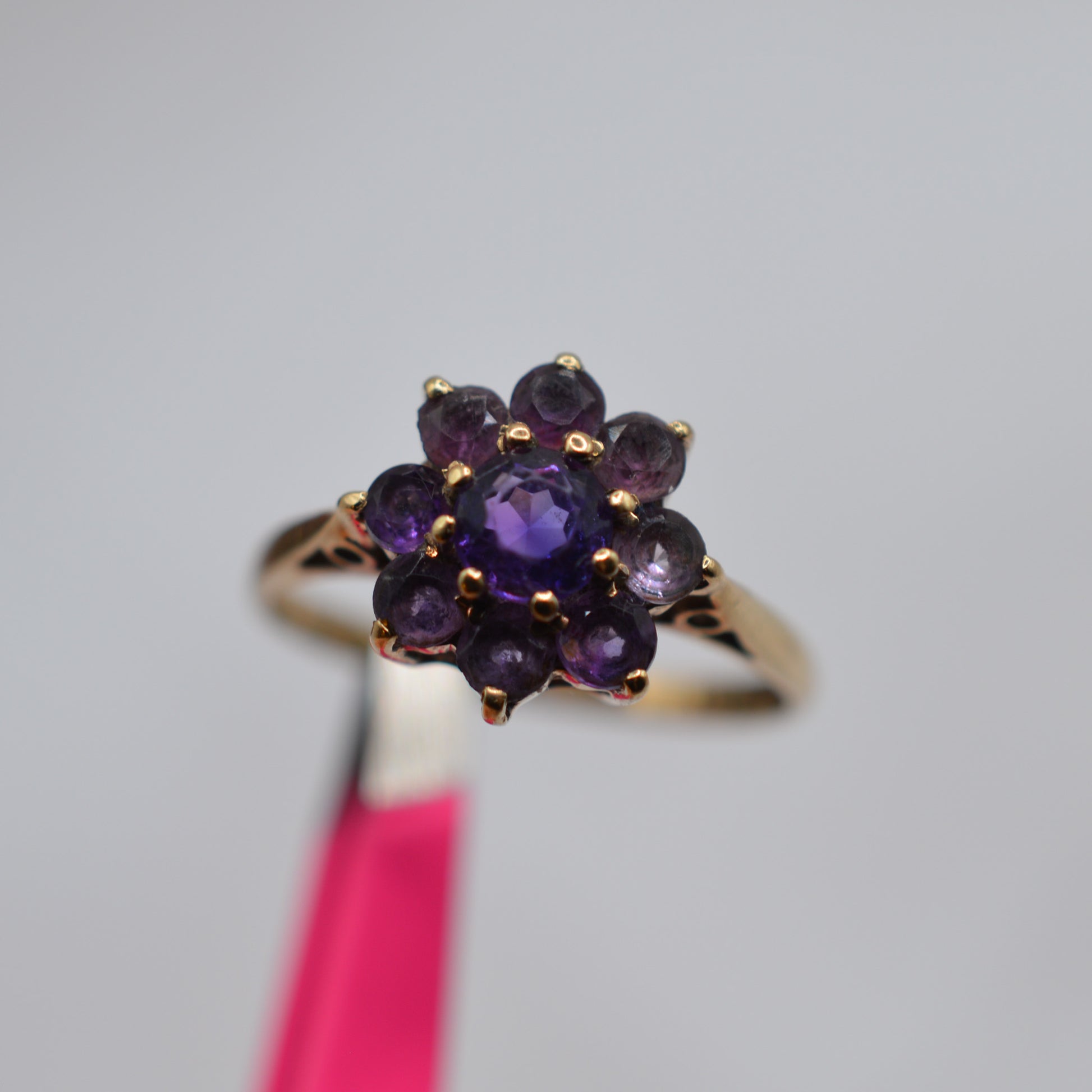 Such an adooorable 1970s 9ct gold amethyst floral cluster ring! This cute vintage piece features a central larger round amethyst, beautifully surrounded by smaller round amethysts arranged as petals. Each gemstone displays a unique shade of lilac or deep purple, creating a multi-hue floral motif.