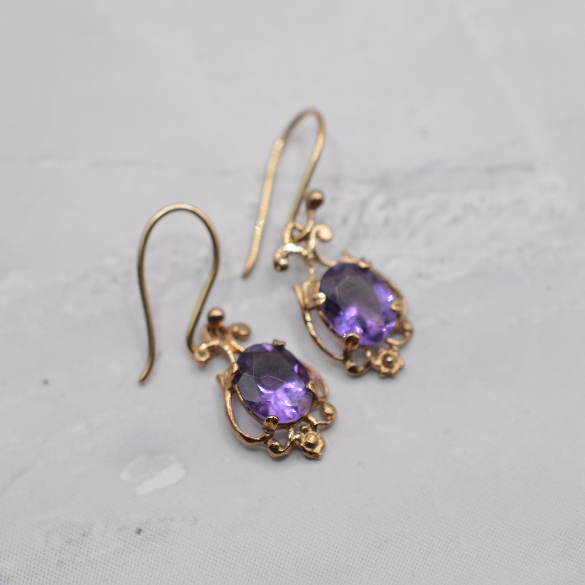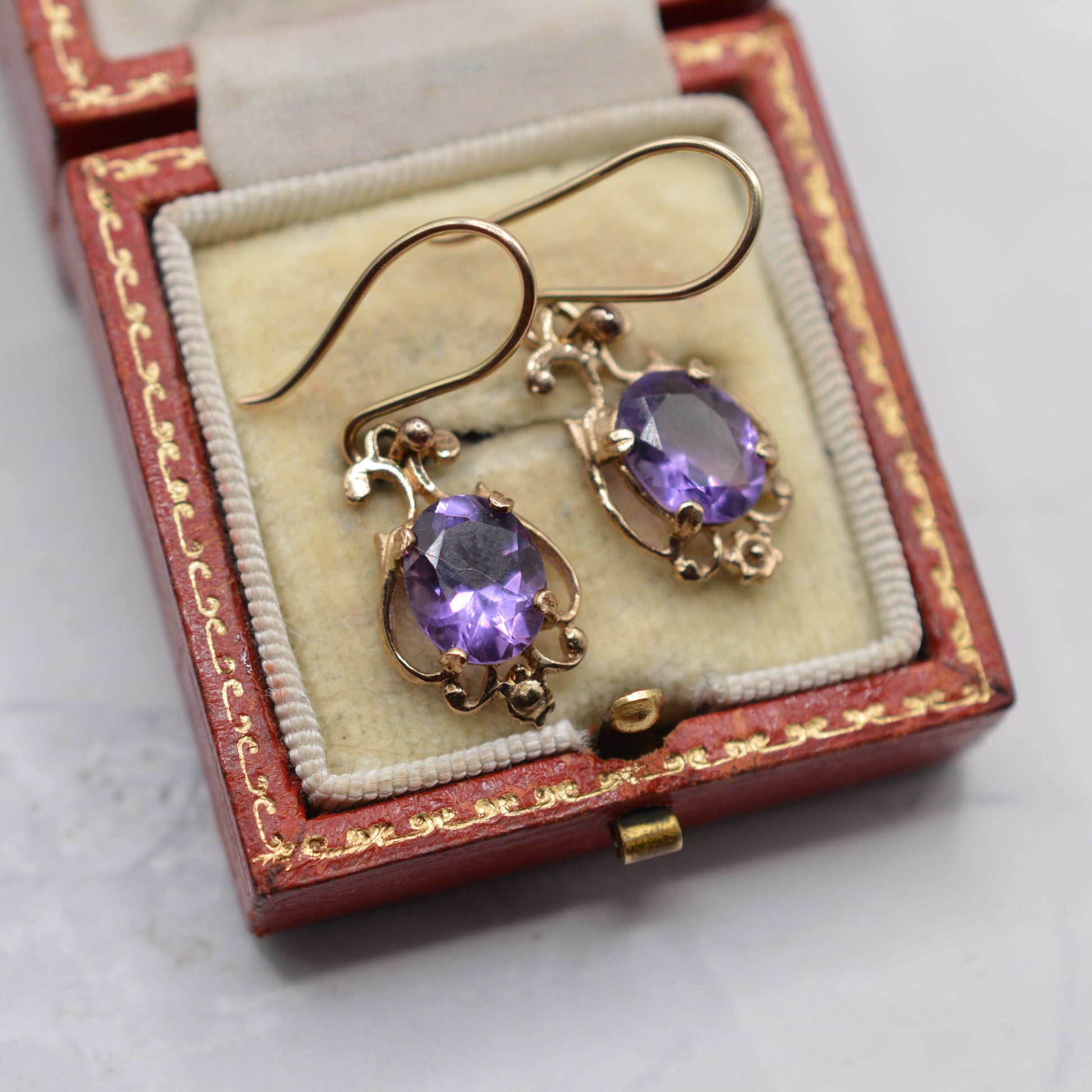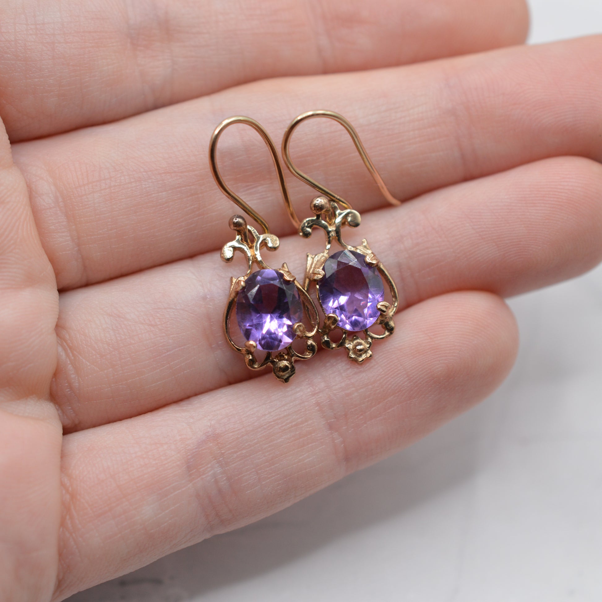 A beautiful pair of 9ct gold amethyst drop earrings from the 1990s. Each earring features a hook fitting with an openwork pendant suspended below, set with a large oval-cut amethyst in a lovely rich purple. The amethysts are beautifully matched in colour and display lovely clarity, framed by openwork scalloped detailing in a Victorian-inspired design.