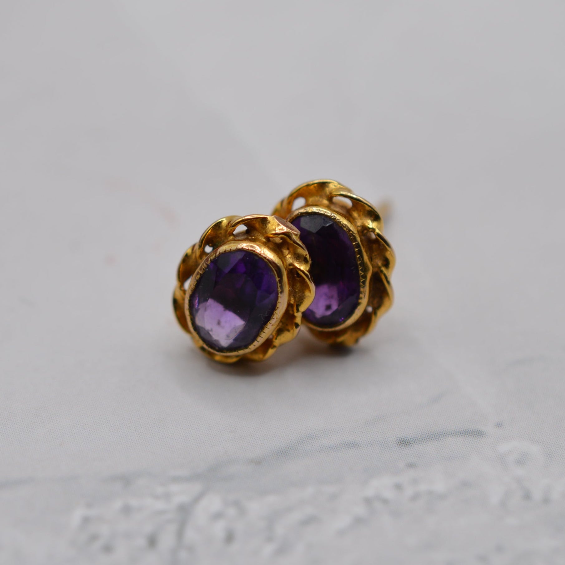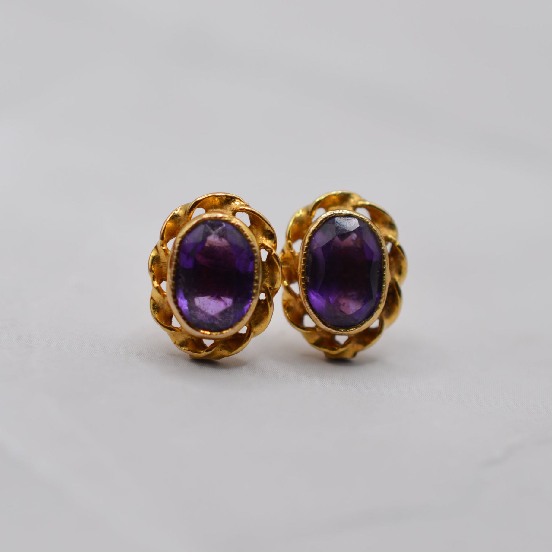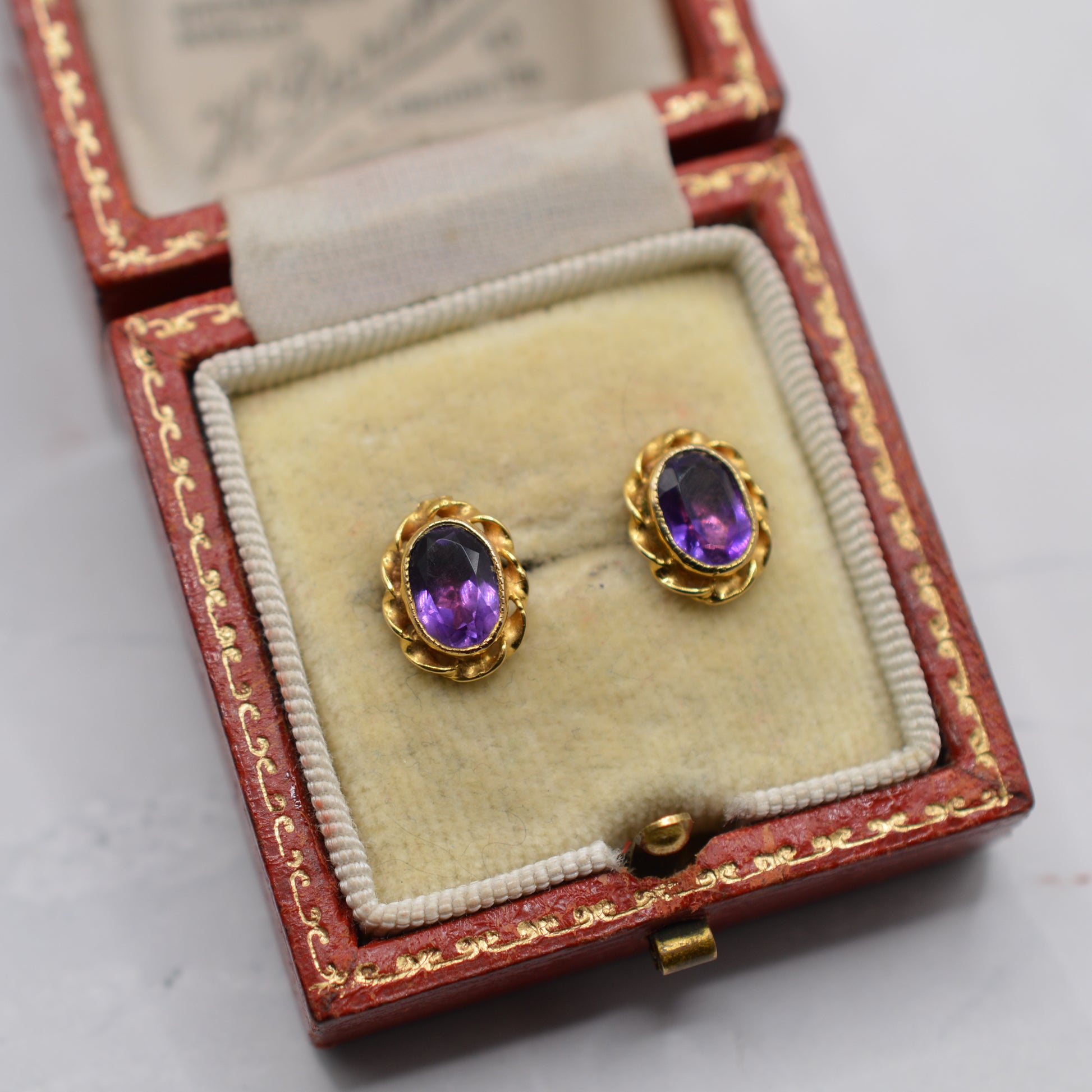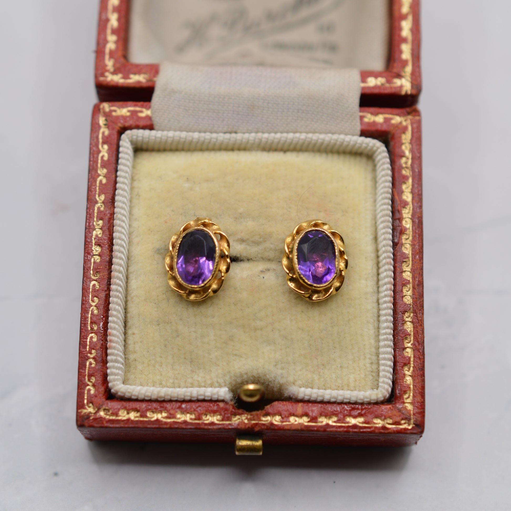 A pretty pair of 1970s 9ct gold amethyst stud earrings. Each stud features an oval-cut amethyst in a rich shade of purple, bezel-set and framed by a decorative rope-twist border. A charming vintage pair that can be worn all day, everyday!