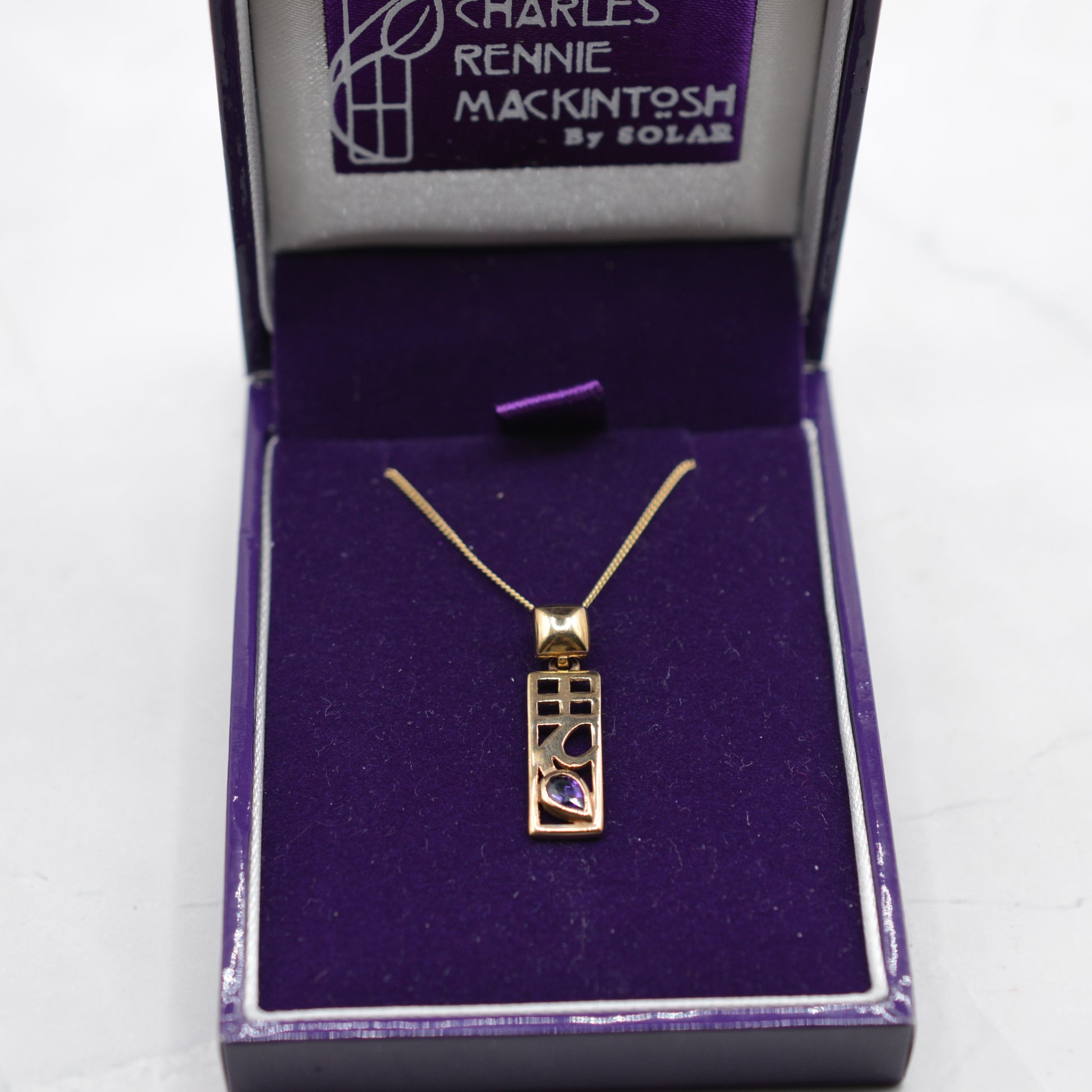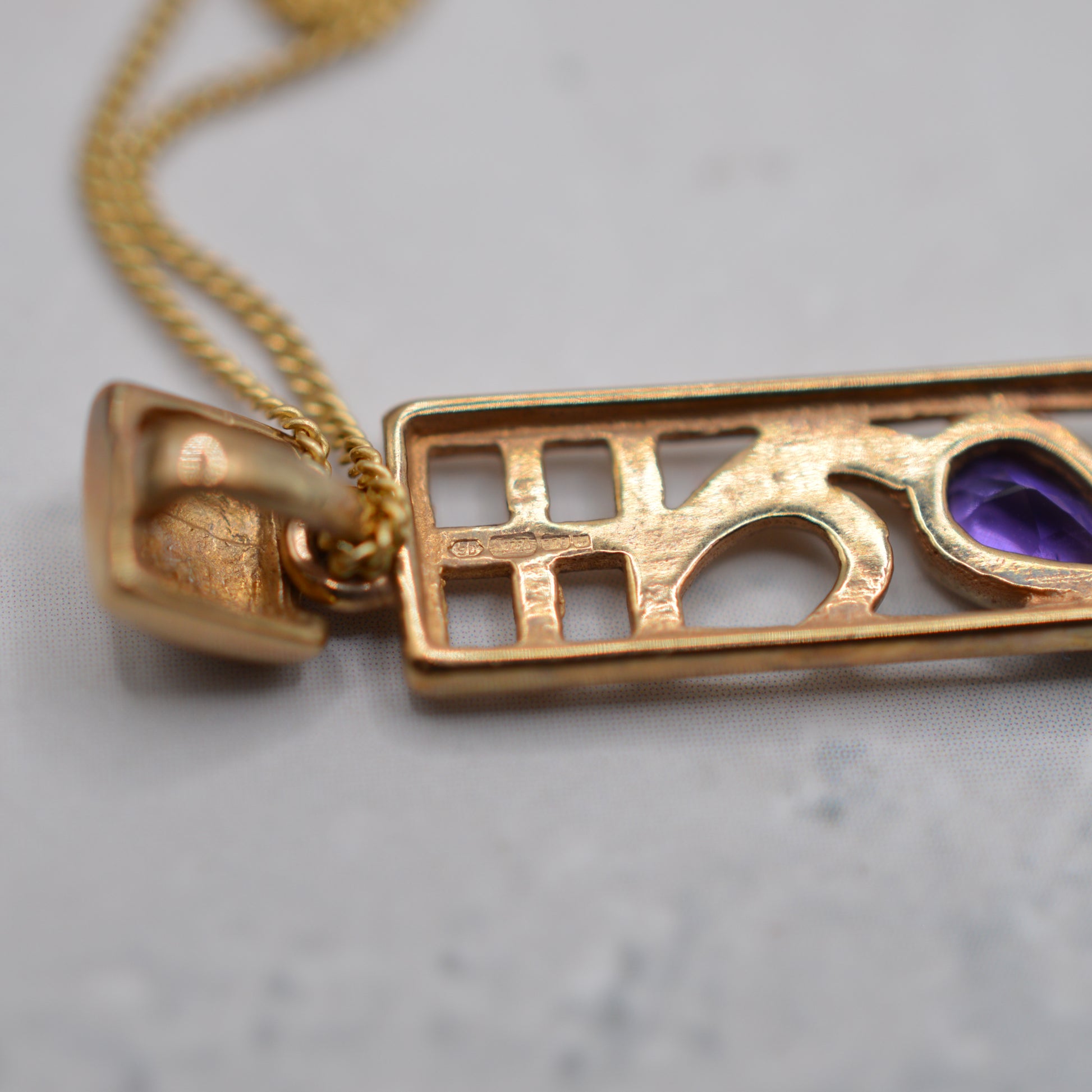 A super pretty 9ct gold amethyst pendant necklace. This elegant piece offers a slim, rectangular pendant with a geometric openwork design, accented by a teardrop-shaped amethyst in a Tyrian shade of purple in the centre. It is made in inspiration of Charles Rennie Mackintosh, a prominent Scottish designer of the Art Nouveau fashion/era. The pendant is suspended from a fine 9ct gold chain and together the pair will be accompanied by the original presentation box from Solar.