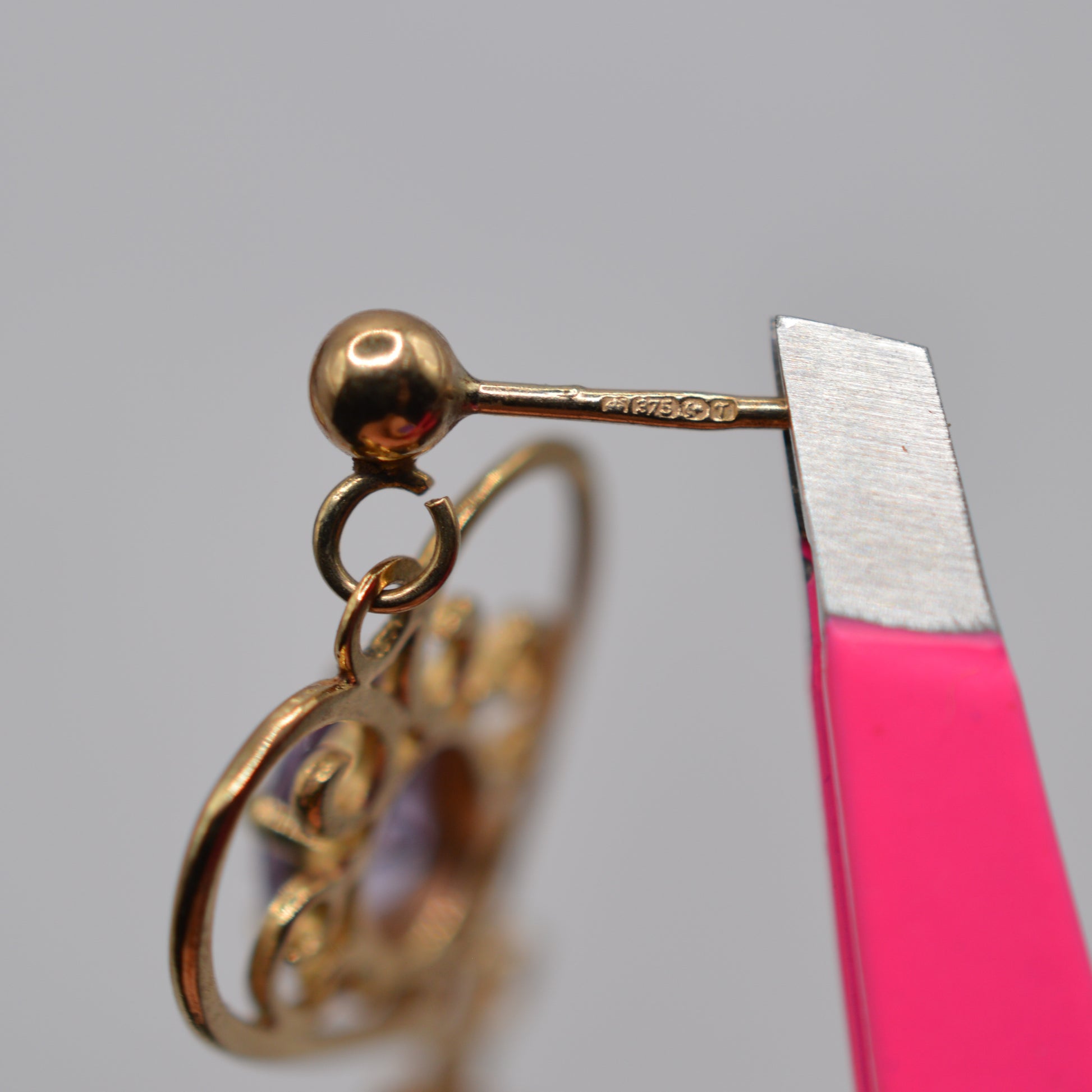 An adorable pair of 1990s 9ct gold drop earrings! Each earring features a delicate open heart-shaped frame with lovely swirling openwork detail, suspended from a polished gold bead; at the centre sits an oval-cut amethyst in soft lilac, while a round cultured pearl drop hangs below. A really charming and romantic pair, perfect for either everyday wear or special occasions.