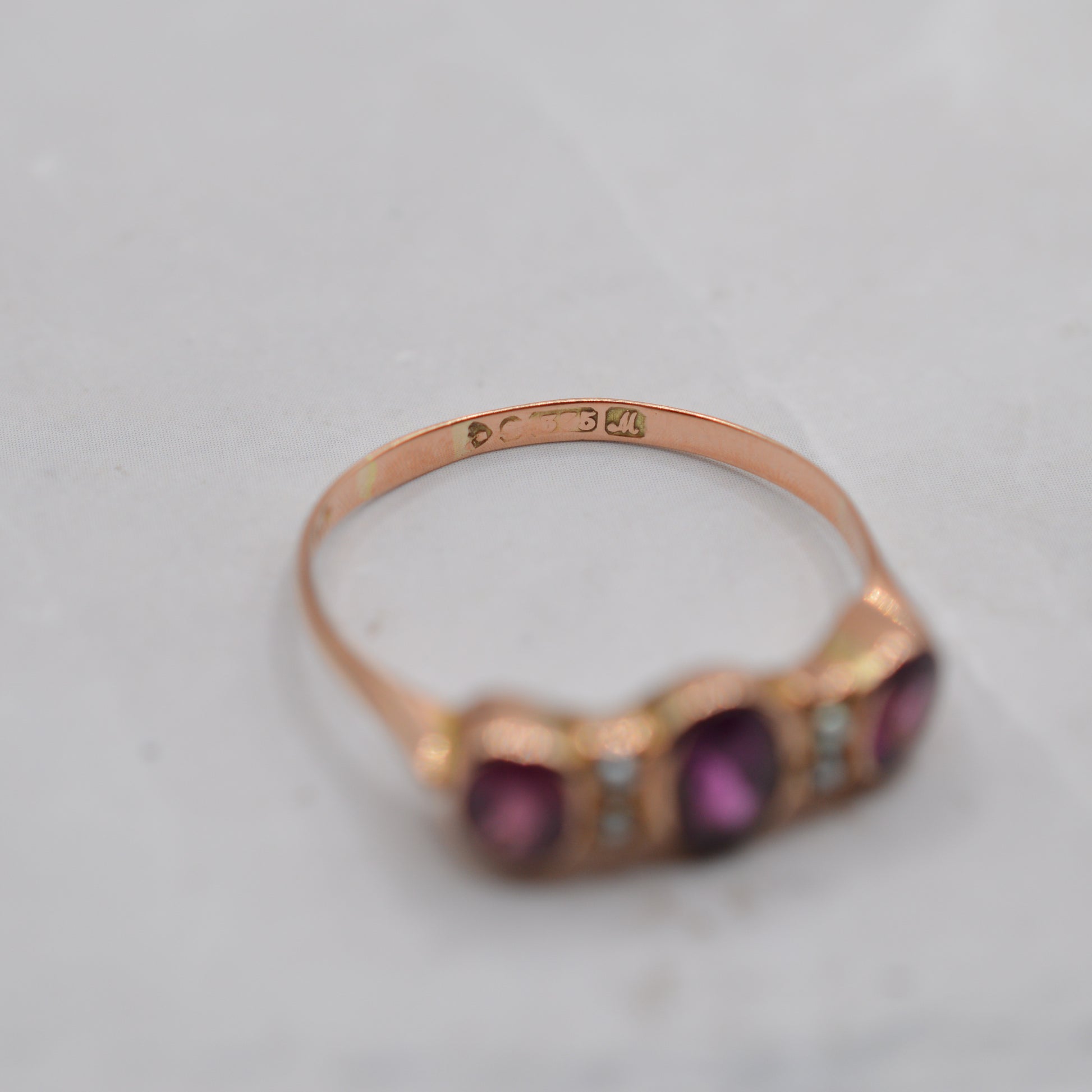 A charming antique 9ct gold amethyst & pearl ring. Dated to 1912, this beautiful George V era piece features three oval bezel-set amethysts in rich pink-purple tones, separated by two vertical rows of seed pearls acting as spacers.