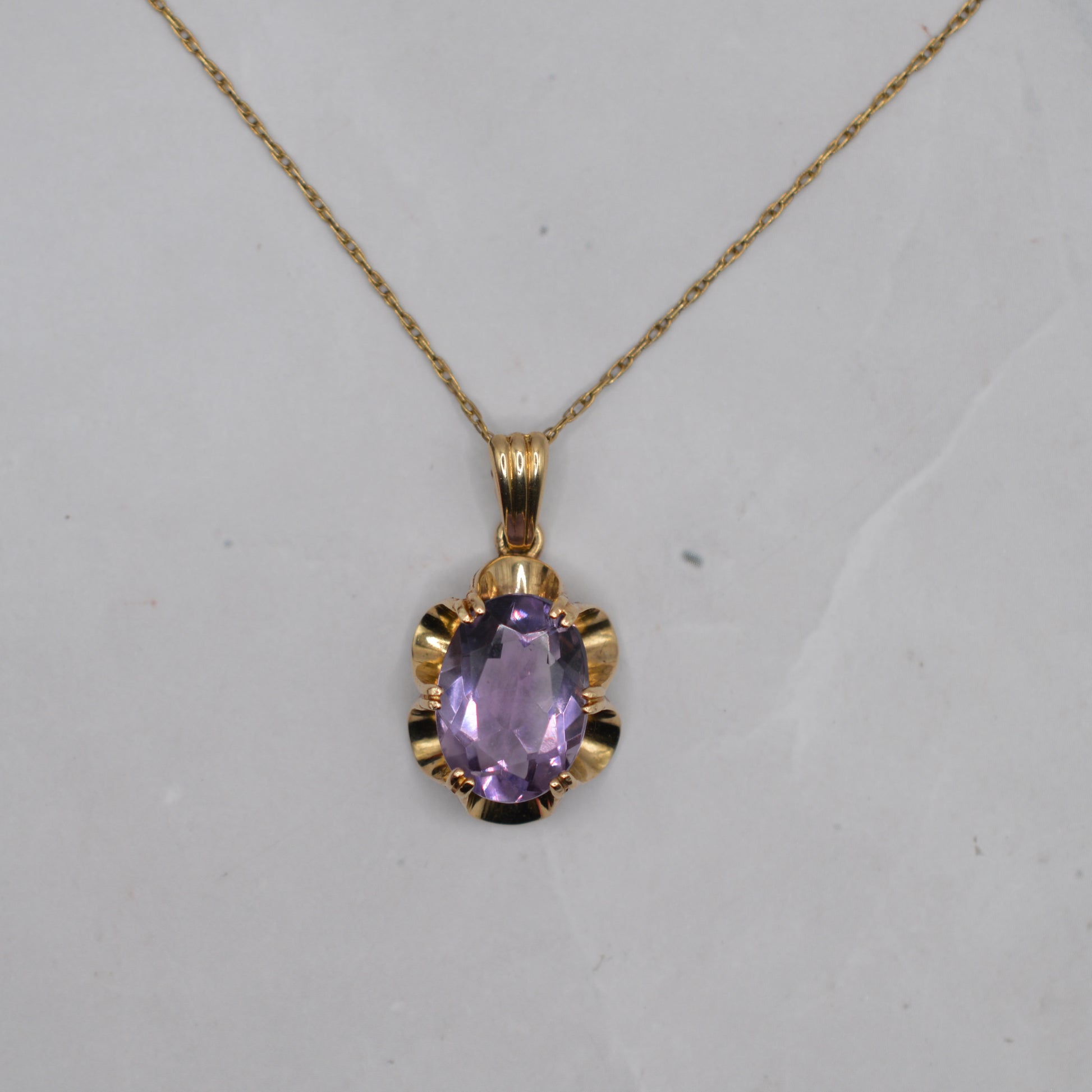 A beautiful 1970s 9ct gold amethyst pendant. This lovely vintage piece features a single oval-cut amethyst in a soft shade of lilac, framed by a classic scalloped buttercup-style mount that gives the pendant a Victorian-inspired look. The amethyst has lovely clarity and sparkle, sitting beautifully within the warm yellow gold setting.