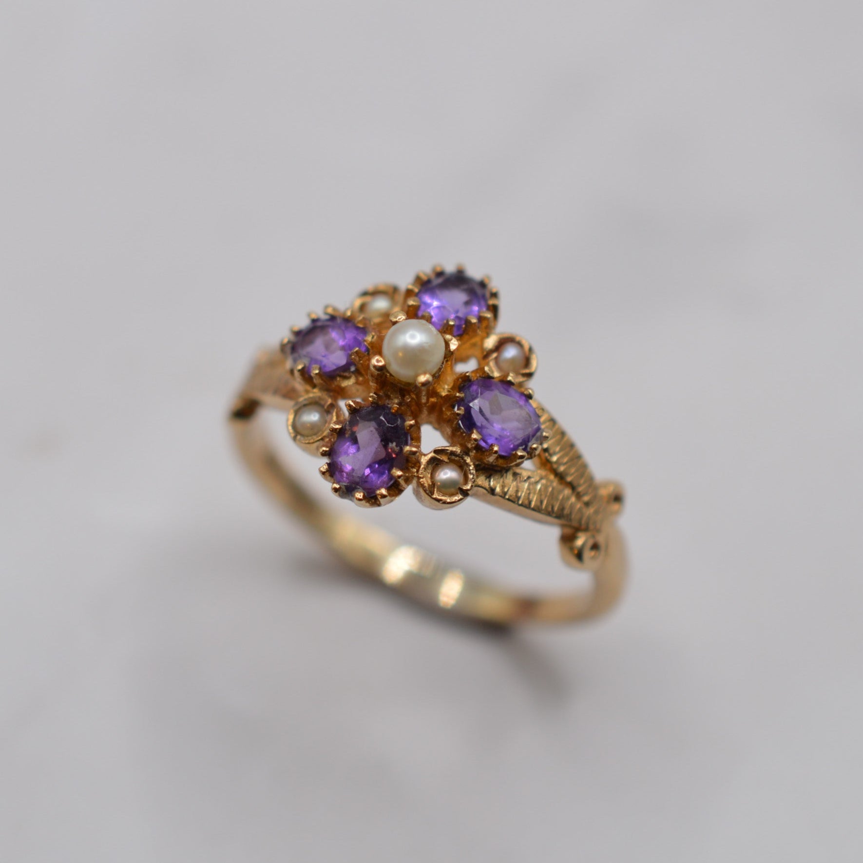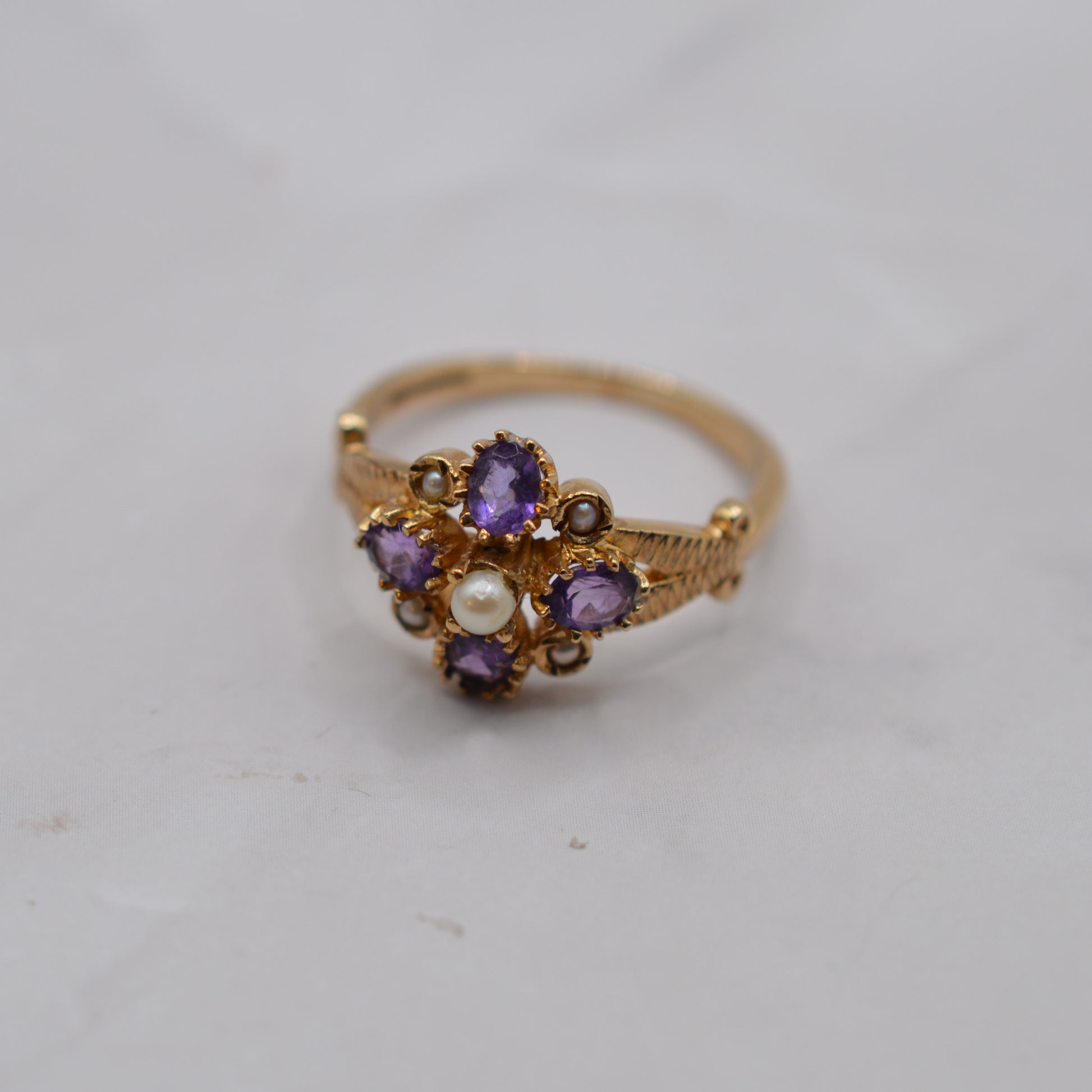 An utterly gooorgeous 9ct gold amethyst & pearl cluster ring. This beautifully unusual preloved piece features a central white pearl surrounded by four vibrant oval-cut amethysts in a cross formation. Delicate seed pearls nestle between each amethyst, creating a striking and symmetrical floral design that feels both regal and romantic. The amethysts are a rich, warm shade of purple with fabulous clarity and sparkle, making this a luxurious and colourful statement piece reminiscent of Victorian style.