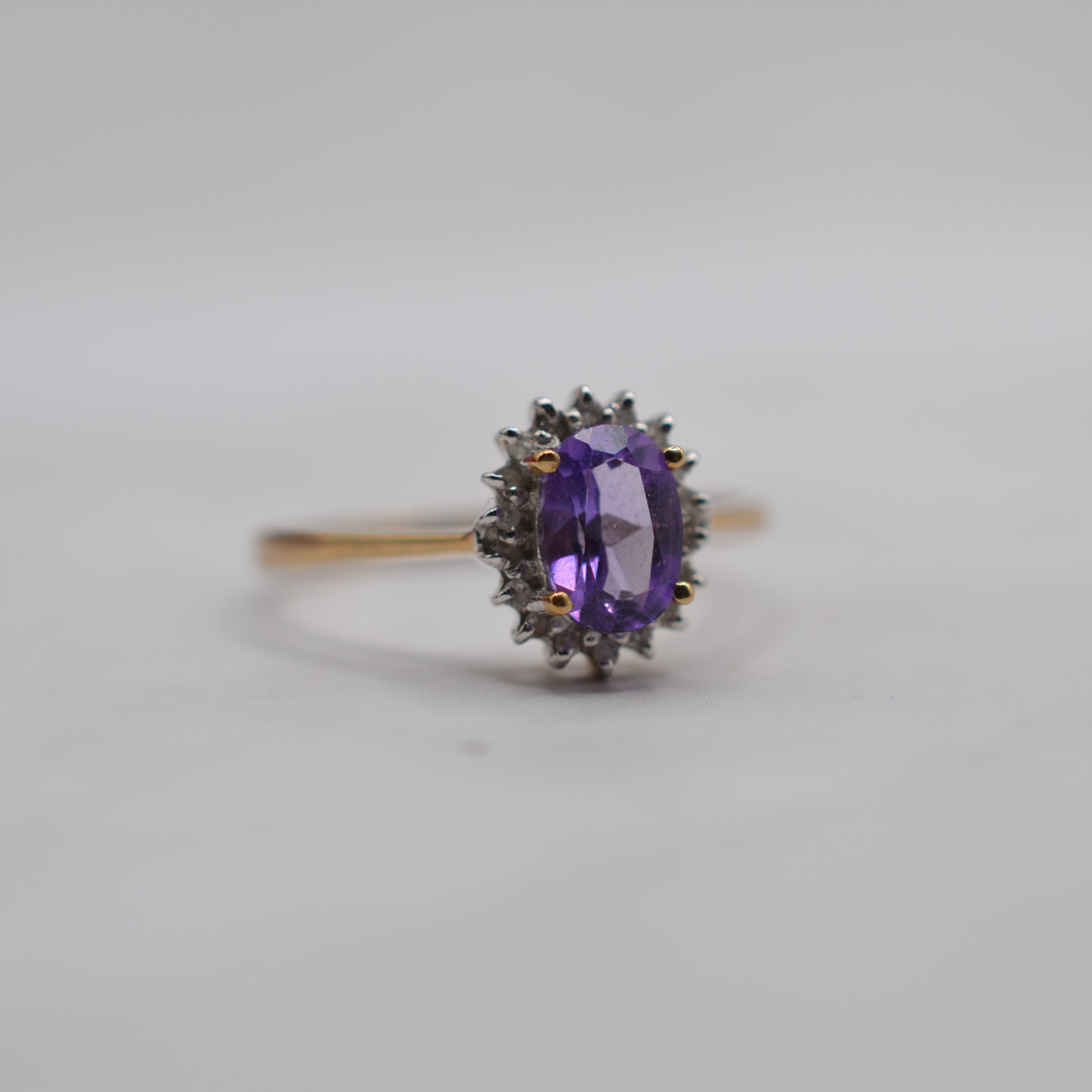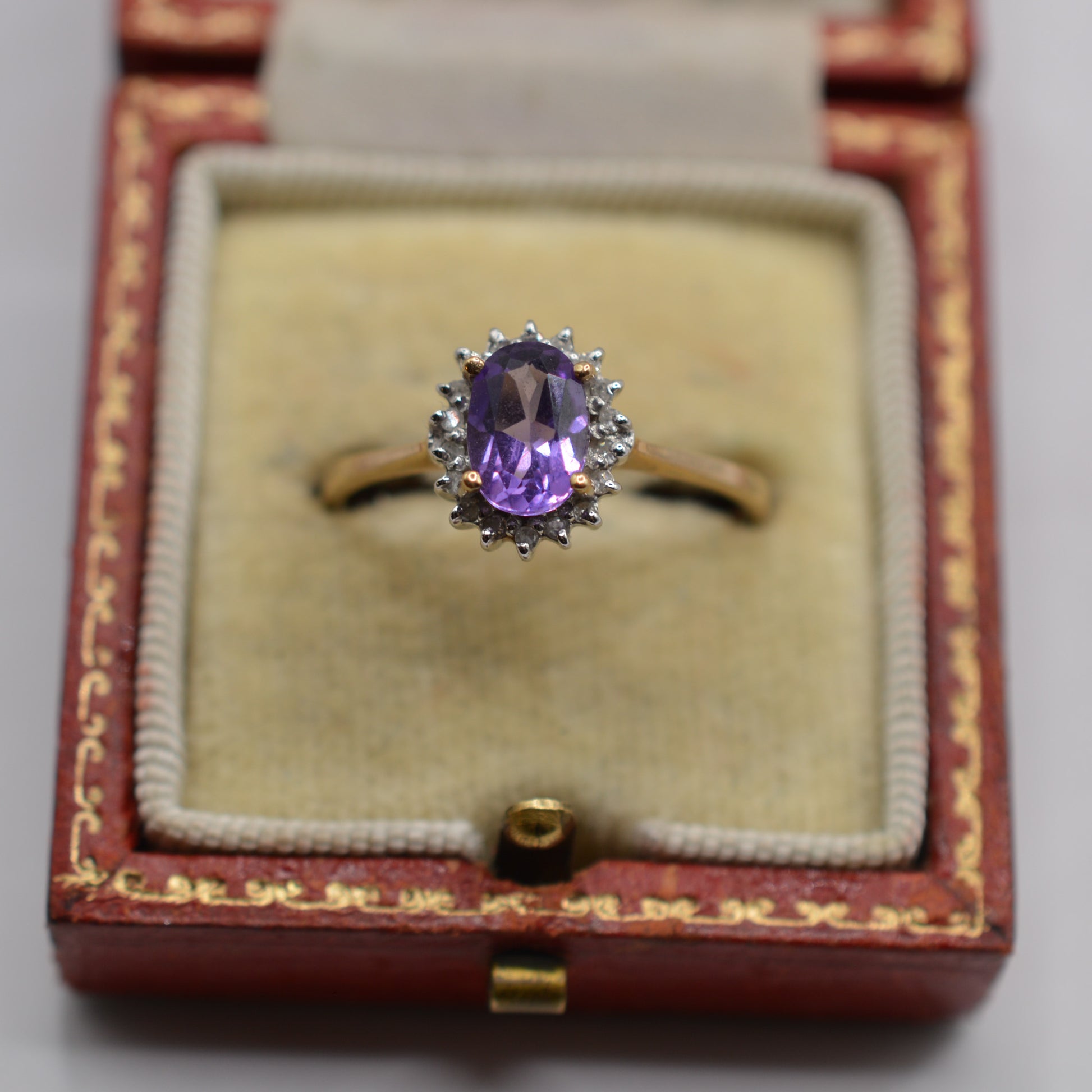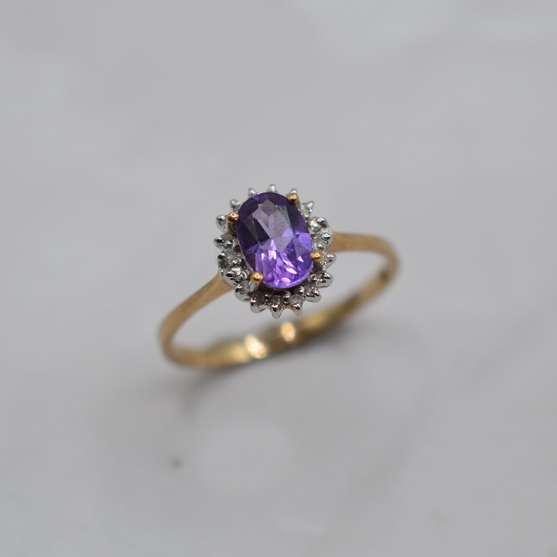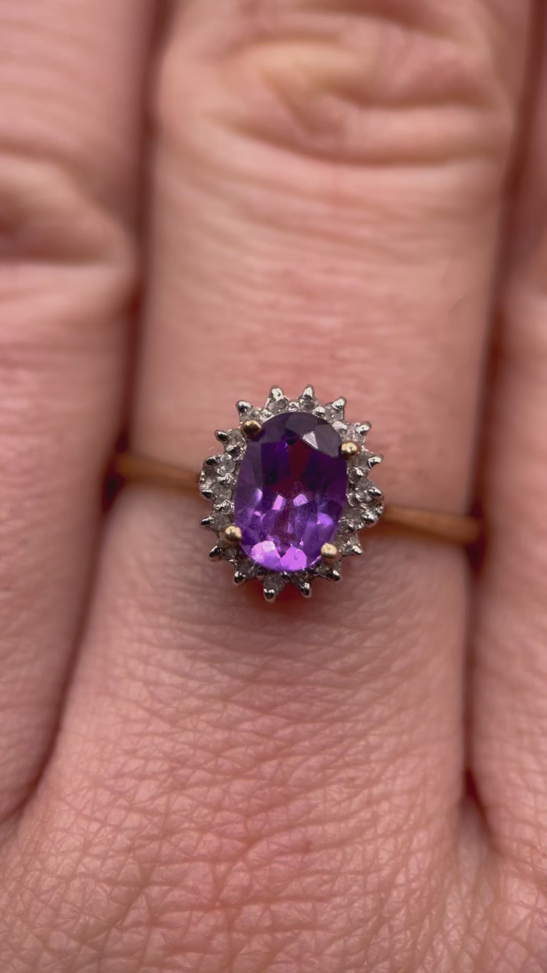 An enchanting and rather regal vintage 9ct gold amethyst and diamond cluster ring! At the heart of this wonderful piece sits a central oval-shaped amethyst, radiating a stunning warm, royal shade of purple with lots of sparkle. A halo of 18 little diamond chips surrounds the amethyst, adding an extra touch of sparkle.
