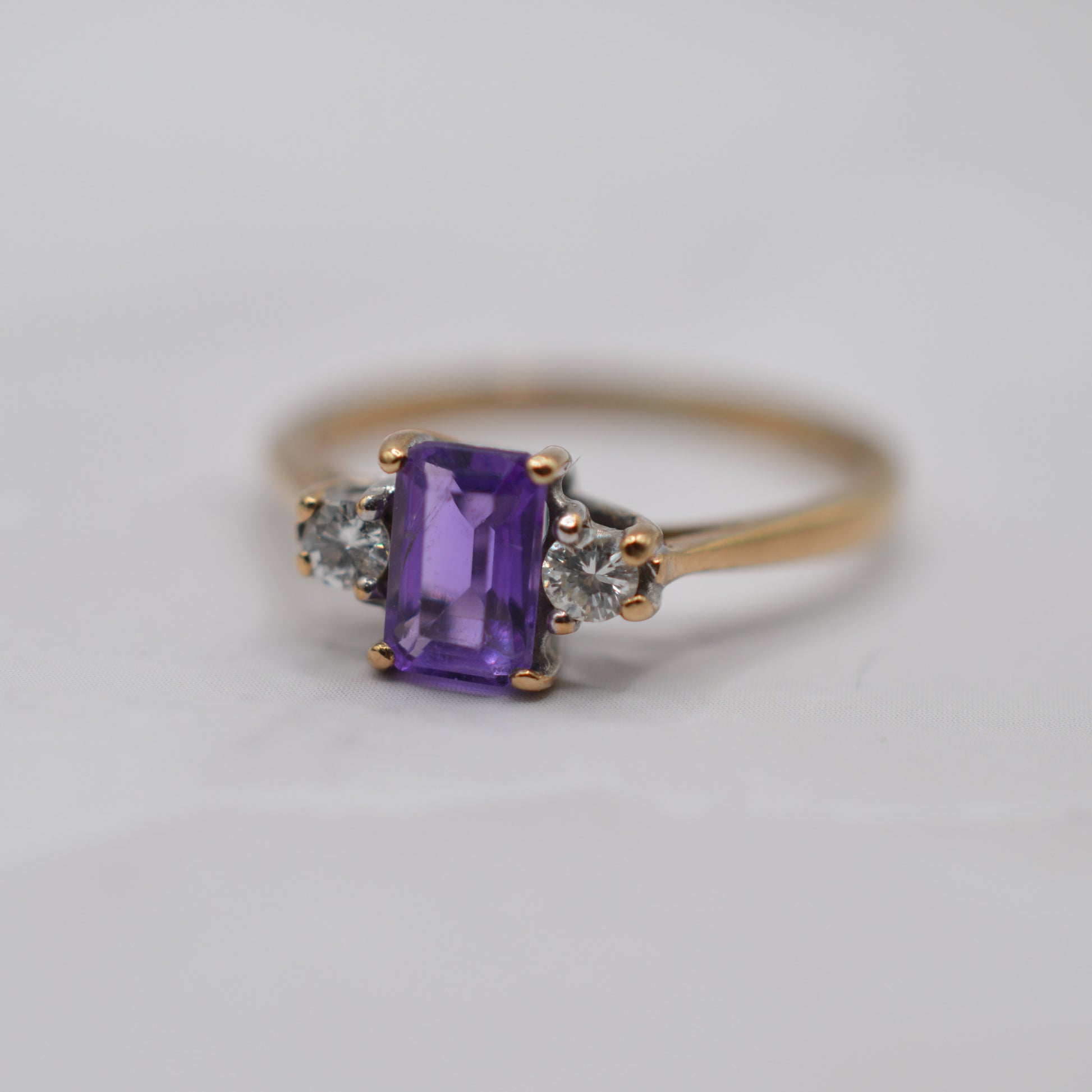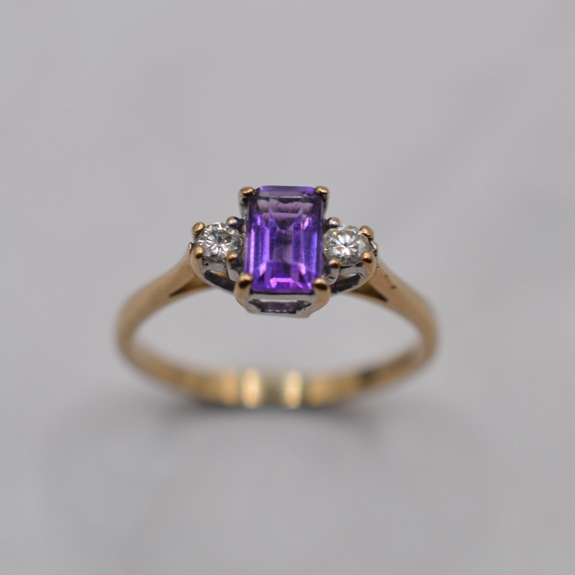 A very elegant little 9ct gold amethyst and diamond trilogy ring. This lovely 1990s piece features an emerald-cut amethyst in a rich shade of purple, flanked by two round sparkling diamonds. The stones are beautifully set in a classic trilogy design, creating a wonderfully symmetrical and dainty piece that's perfect for special occasions or everyday sparkle.