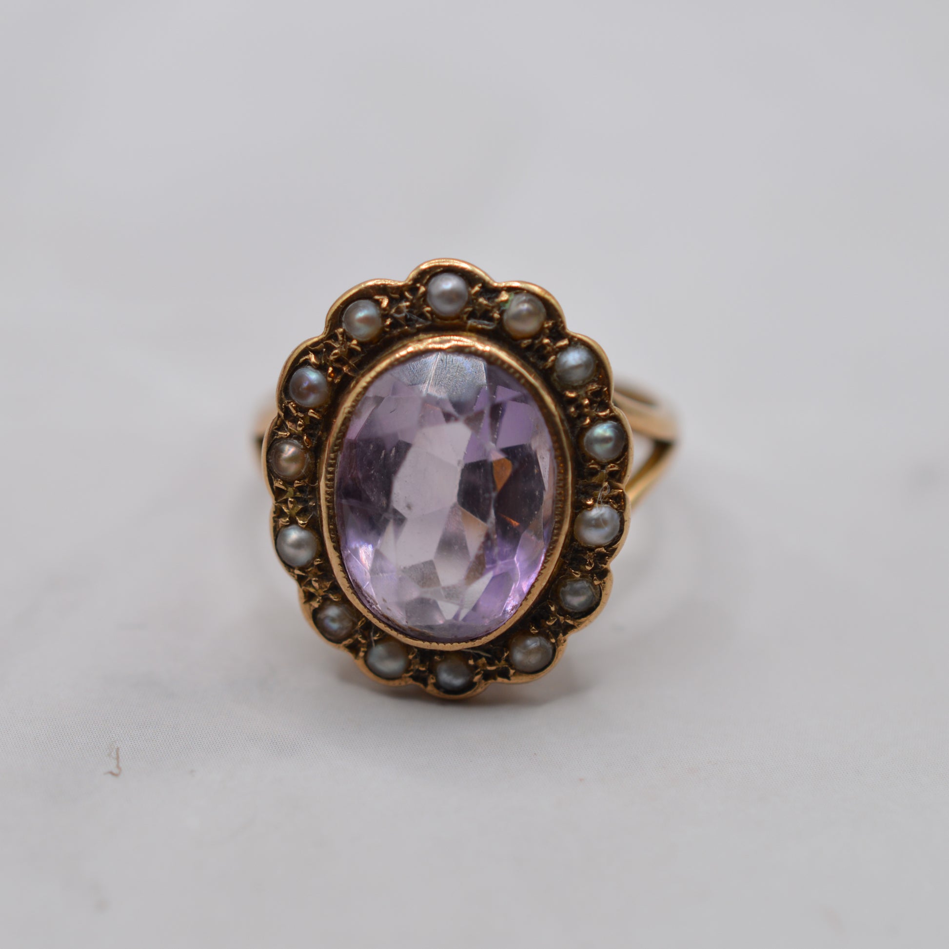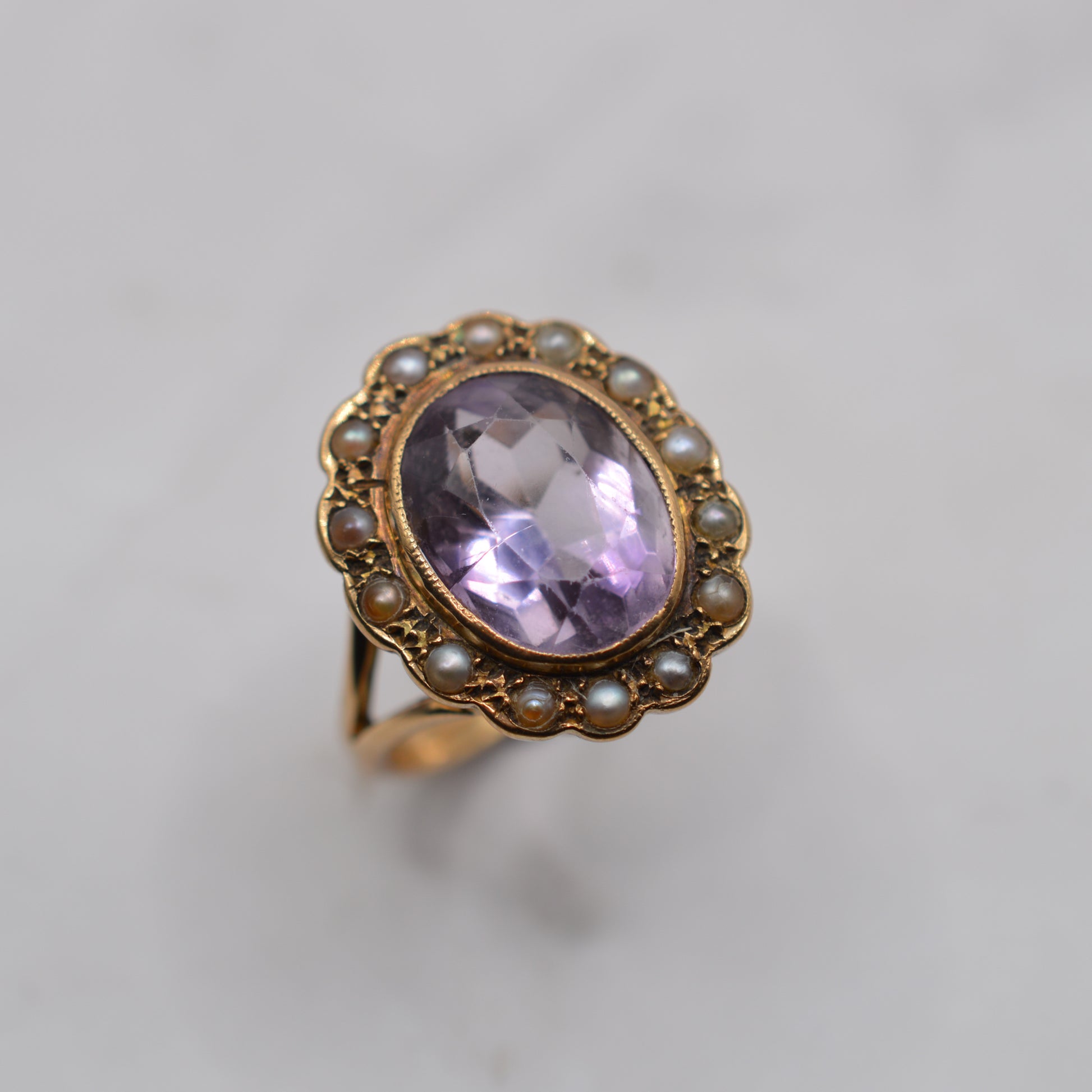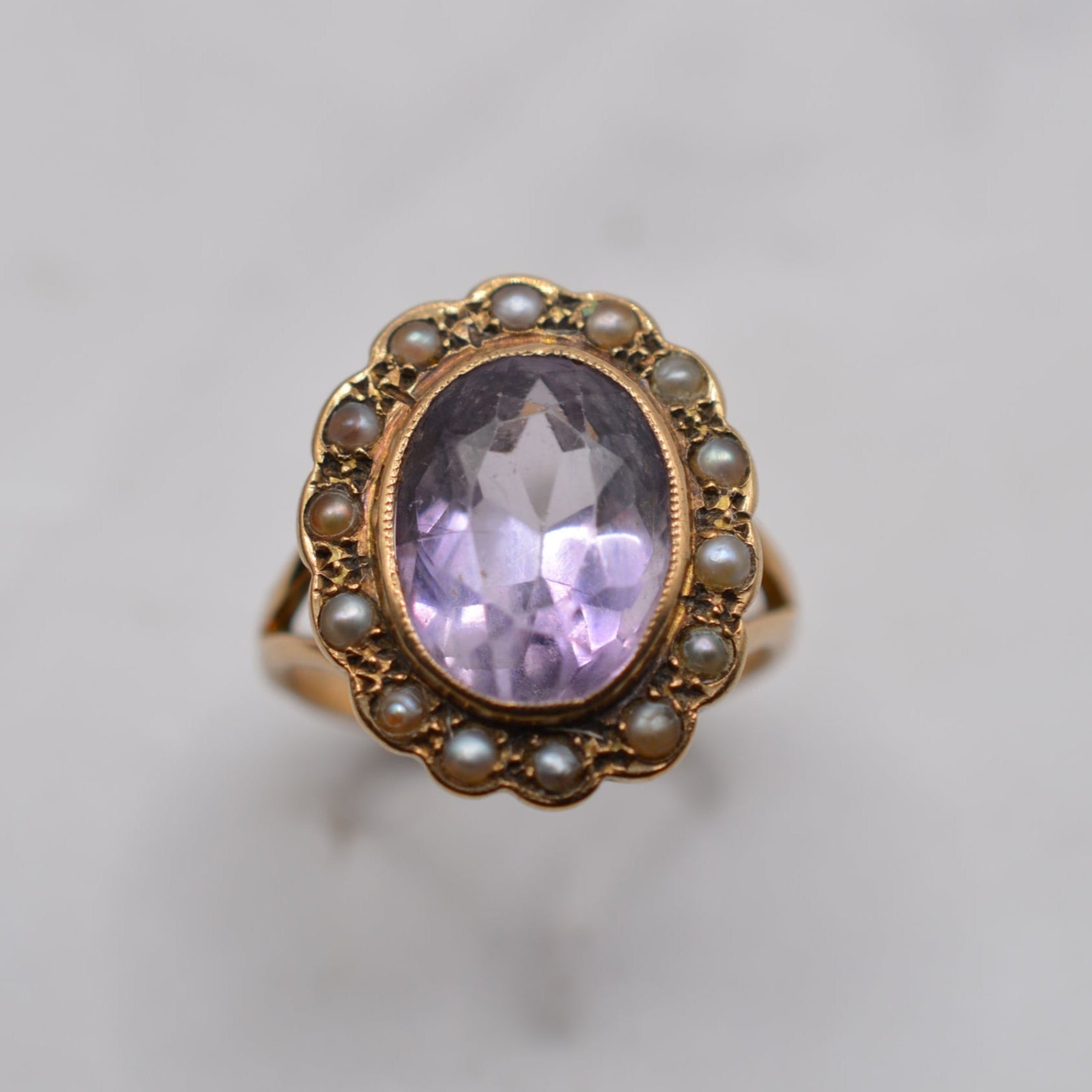 • Gemstones: Oval-cut amethyst (approx. 13mm) with seed pearl surround