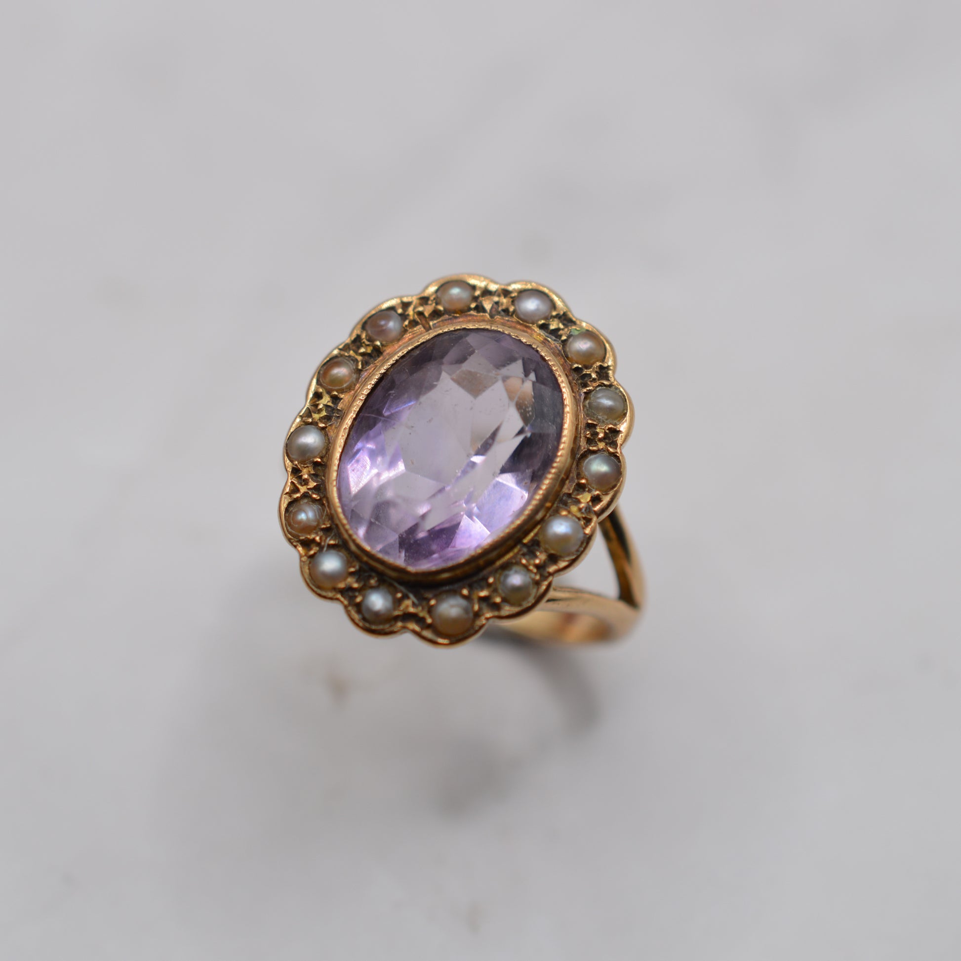 An absolutely wonderful antique Victorian 9ct gold cluster ring set with amethyst and pearls. This chunky, eye-catching piece features a large oval-cut amethyst in a beautiful lilac shade of purple, framed by a halo of pretty white seed pearls for a truly elegant look. The cluster itself measures an impressive 20mm x 16mm, making this a standout, large statement piece. Dating to the late Victorian era (likely 1890s), it remains in good condition for its age and is a stunning and collectible ring, perfect for lovers of statement antique jewellery.