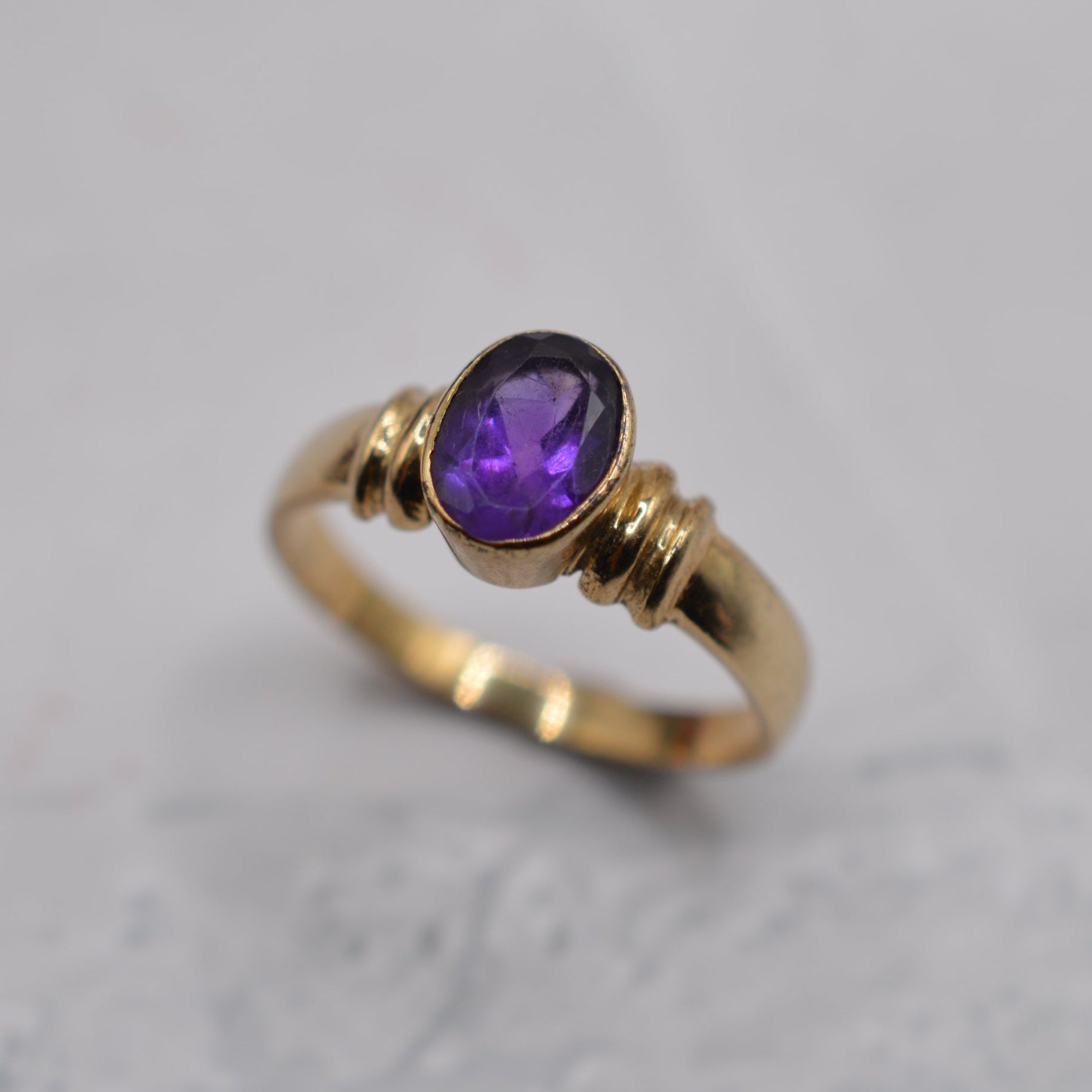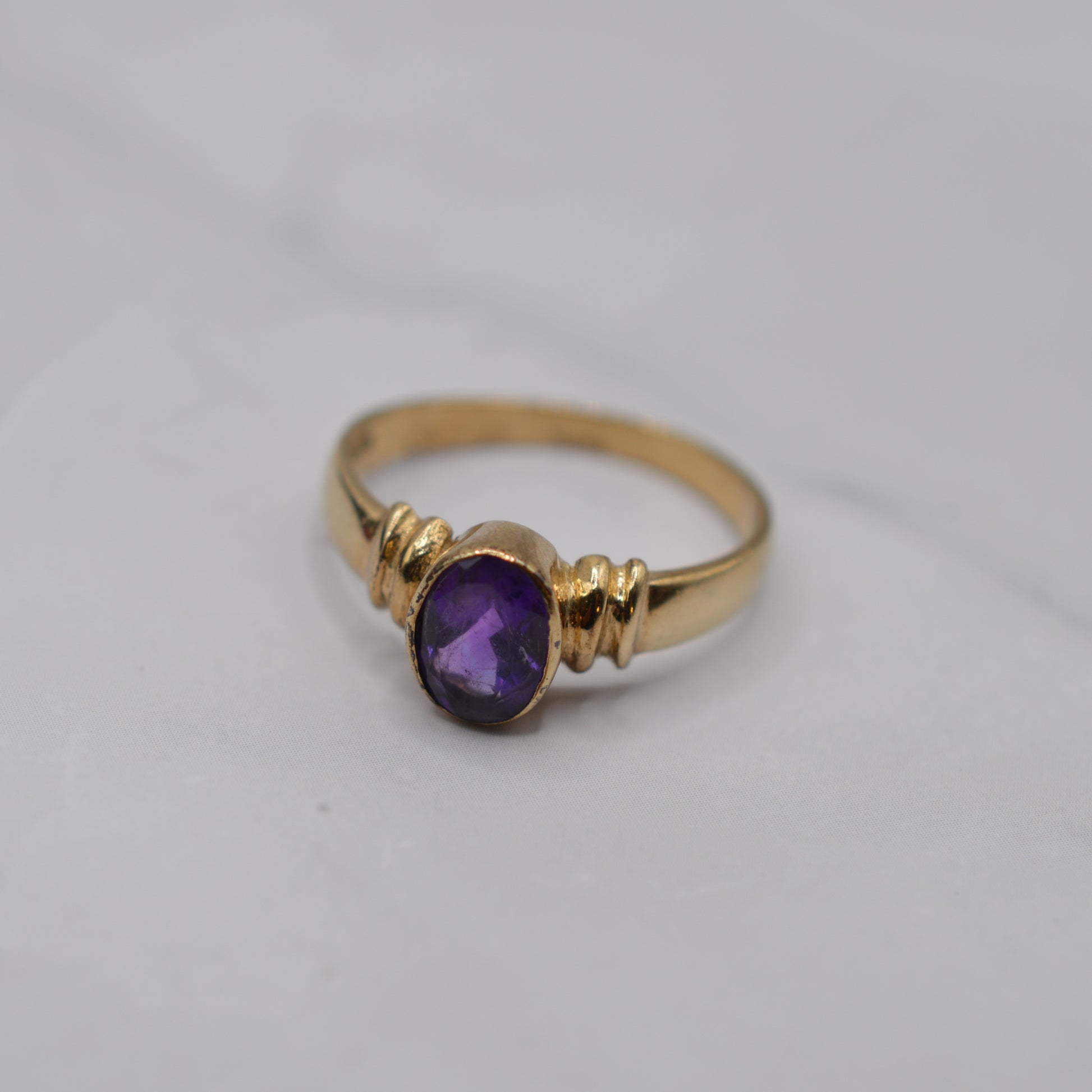 A very sweet 9ct gold amethyst solitaire ring! This lovely piece features an oval-cut amethyst in a rich purple shade, bezel-set and flanked by subtle ribbed detailing on each shoulder (two raised ridges either side of the stone). A charming everyday piece that looks great alone or in a stack.