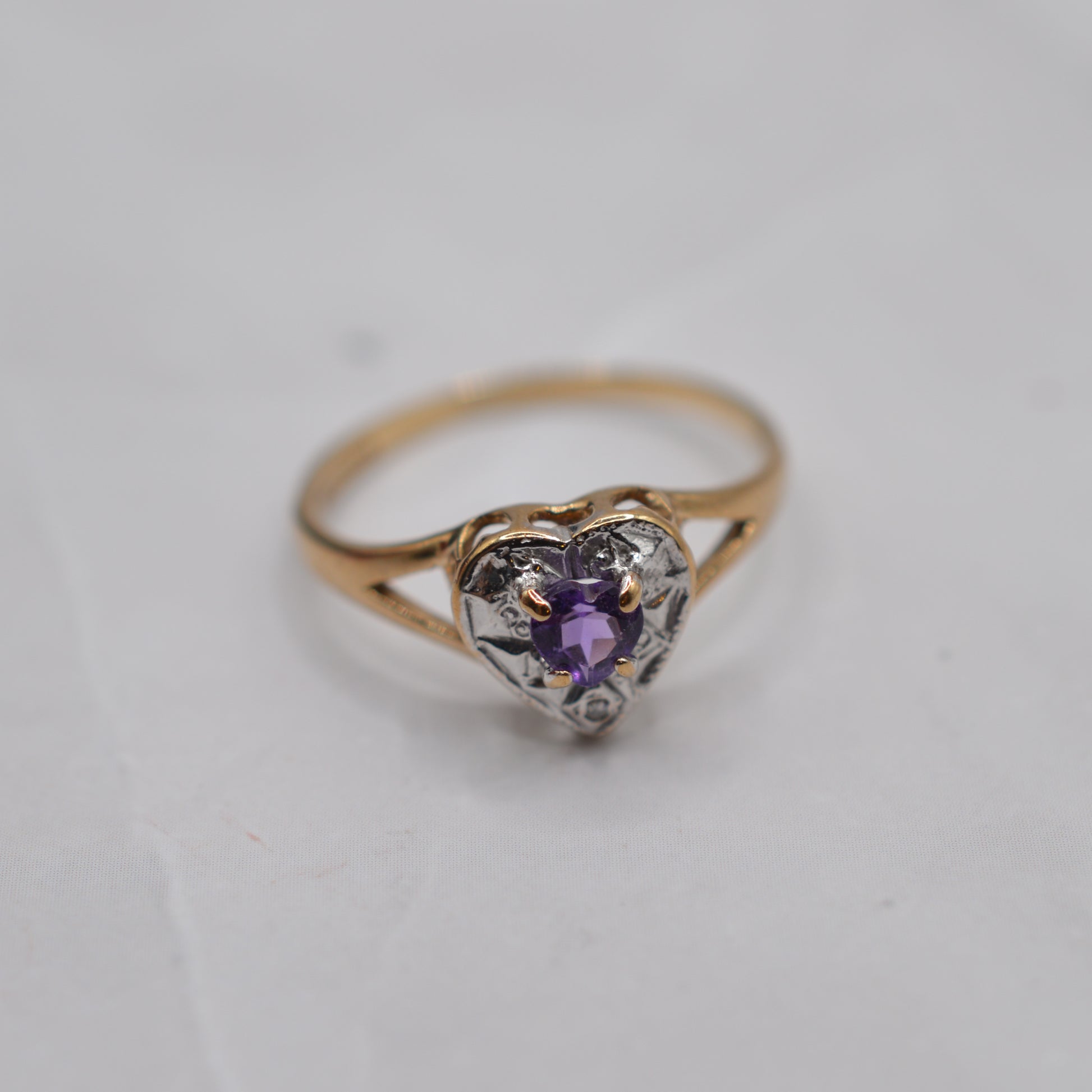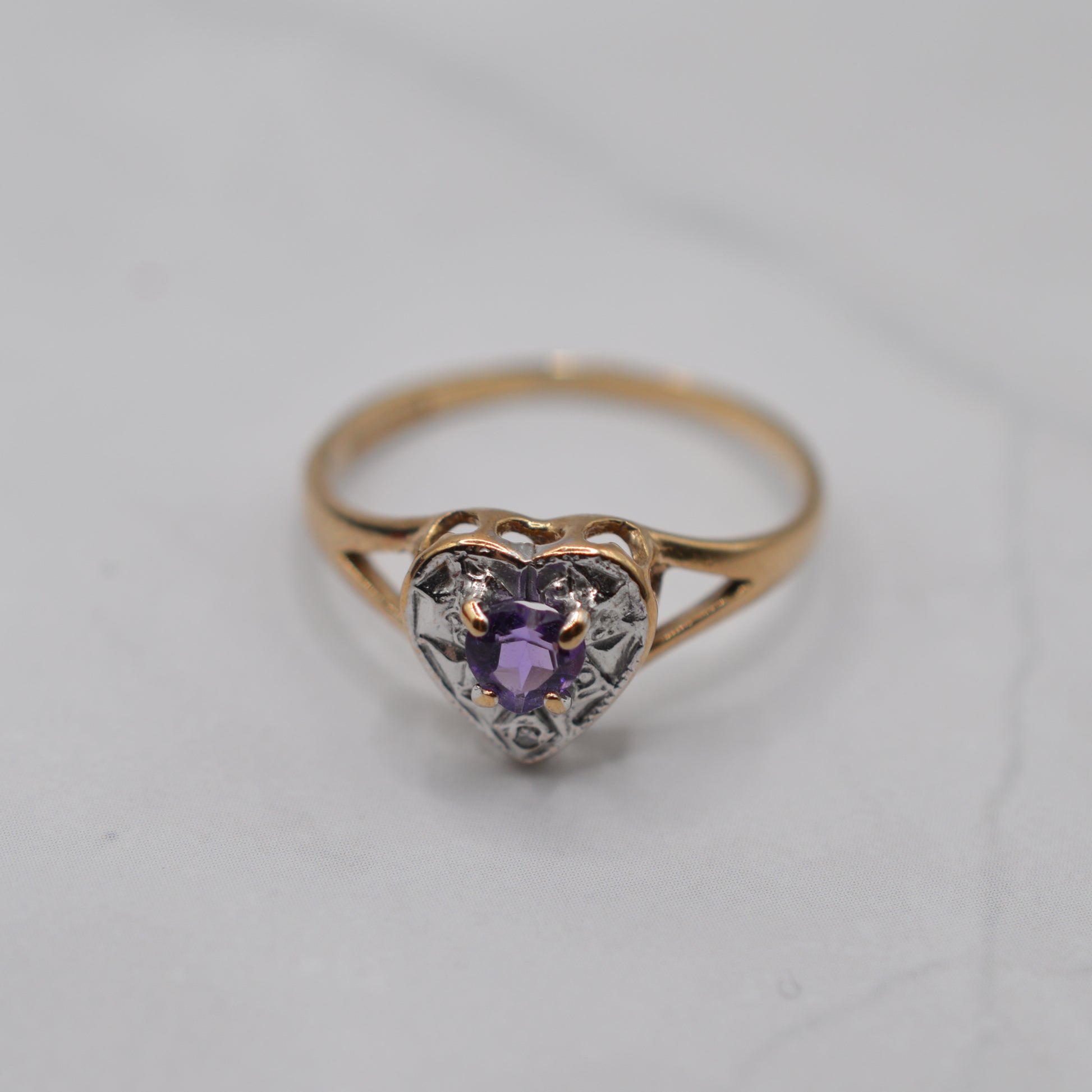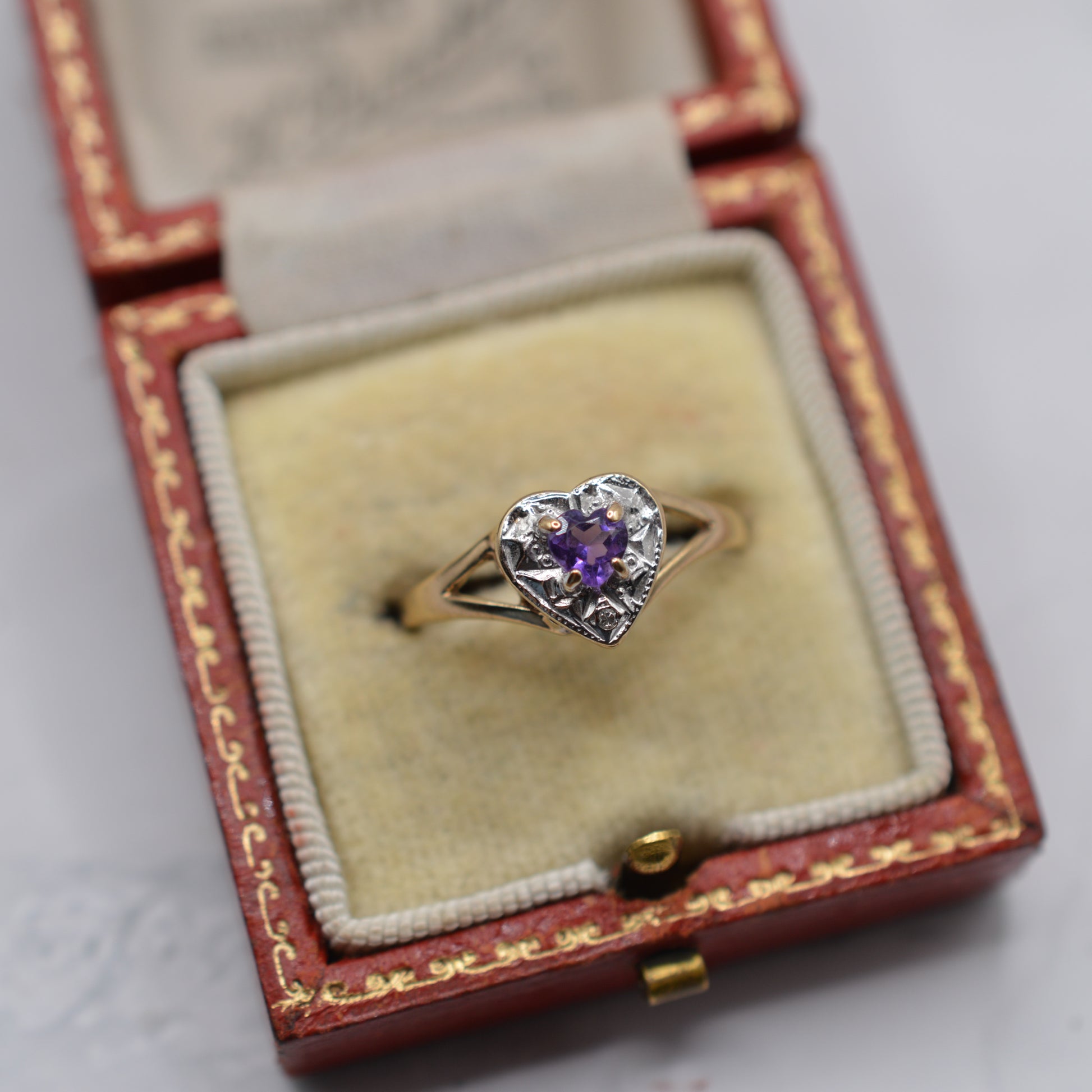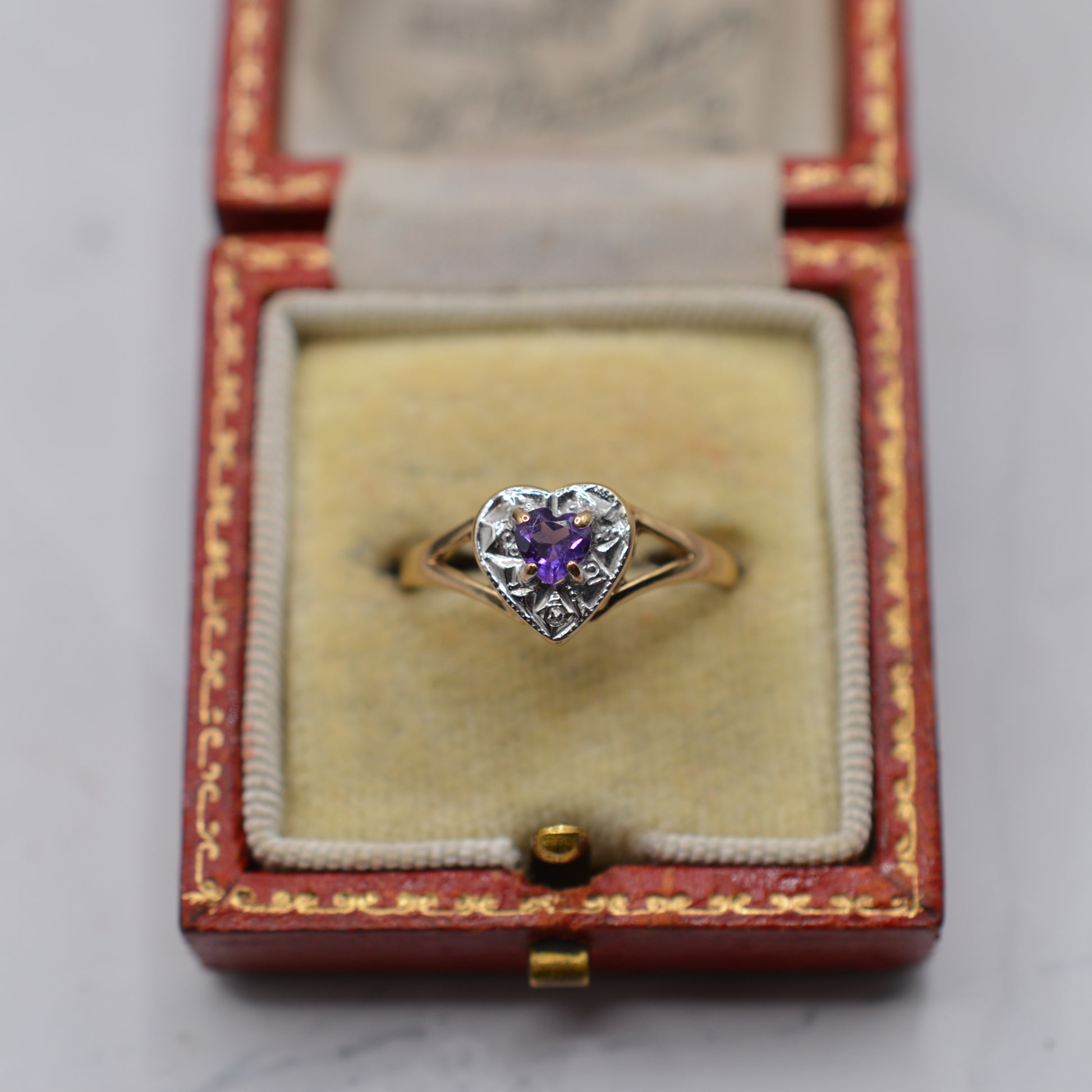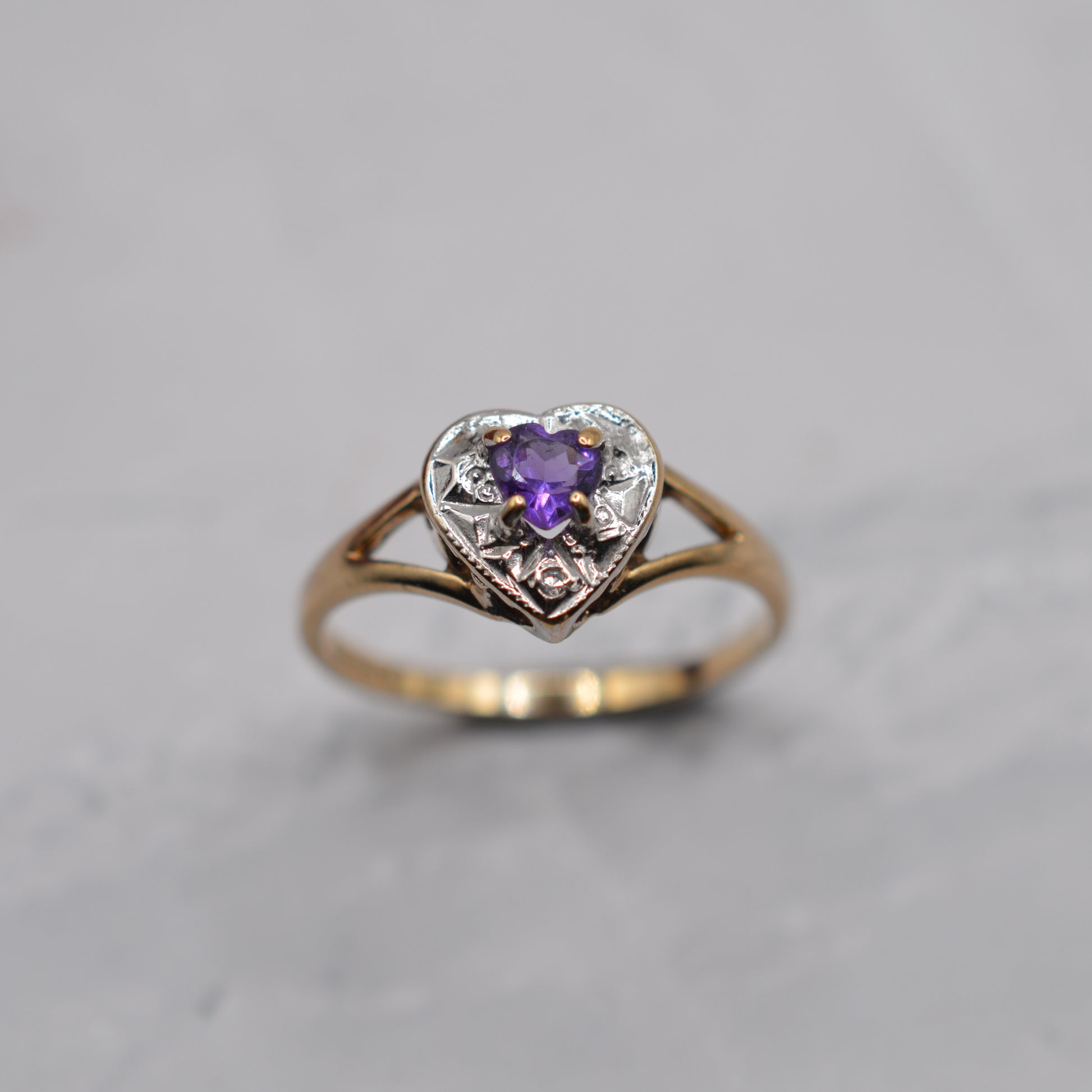 A rather sweet 9ct gold heart ring! This pretty piece features a claw-set heart-shaped amethyst in a gorgeous shade of purple, placed in a white gold setting with a tiny diamond accent at the base for added sparkle. The design is completed with elegant split shoulders, a polished yellow gold band, and a charming heart-pierced gallery beneath the stone. So feminine and romantic!