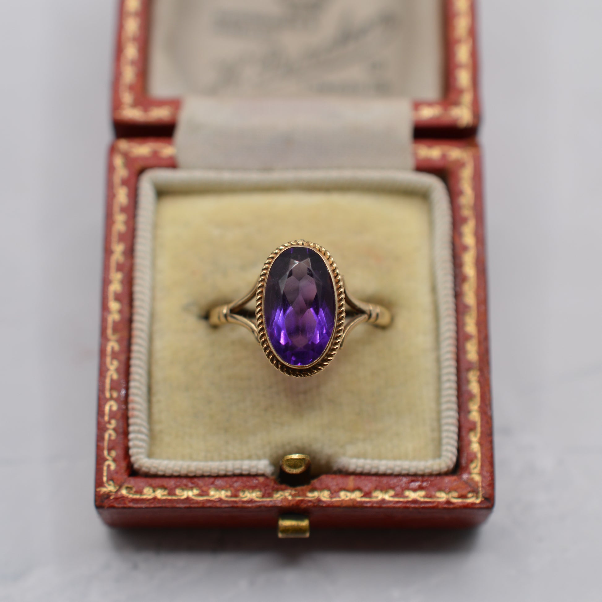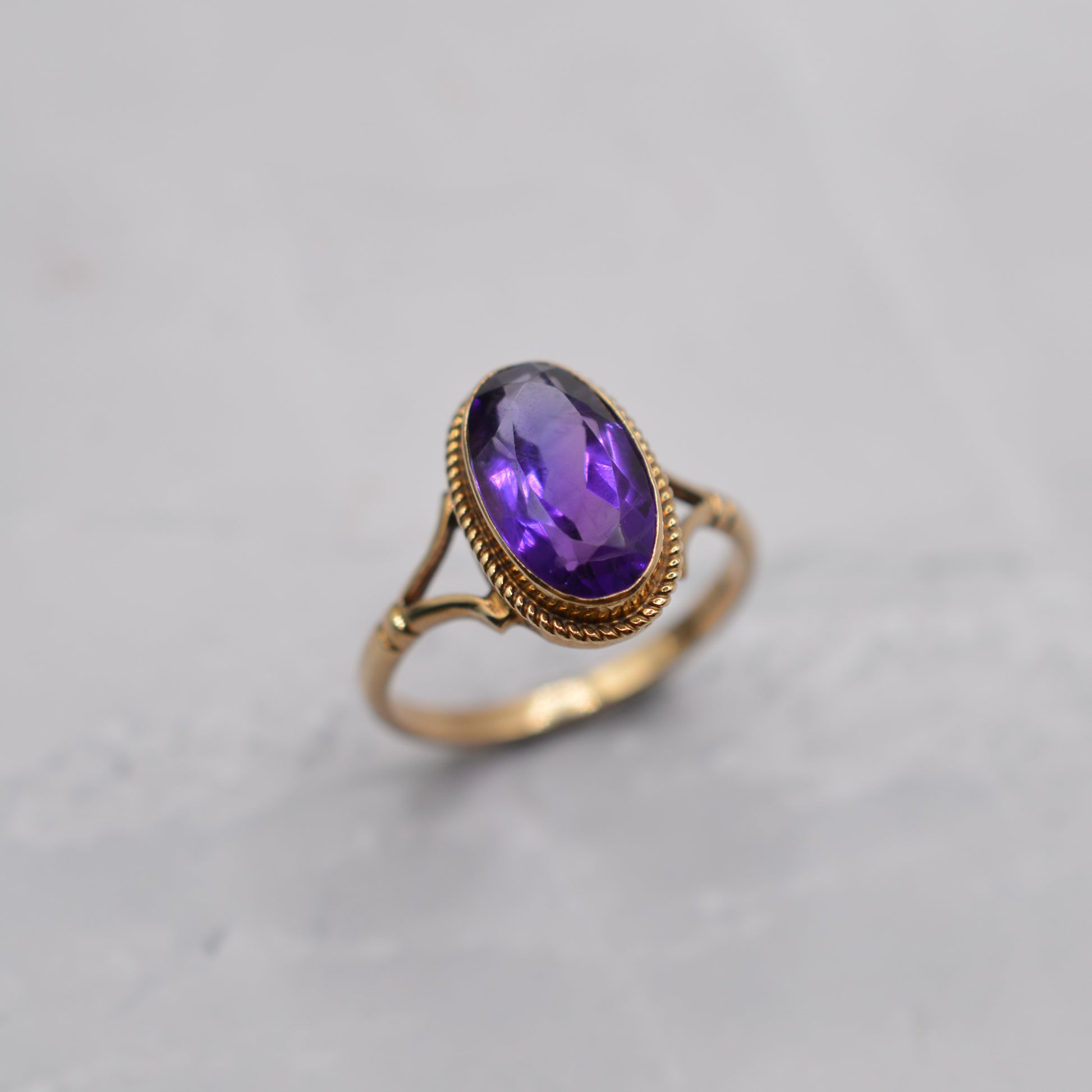 A beauuuutiful 9ct gold amethyst solitaire ring. This elegant 1990 piece features a long, oval-cut amethyst in a rich tyrian purple, bezel-set and framed by a decorative rope-twist border and symmetrical split shoulders. A sparkling and eye-catching design that adds a little vintage sparkle to any outfit!