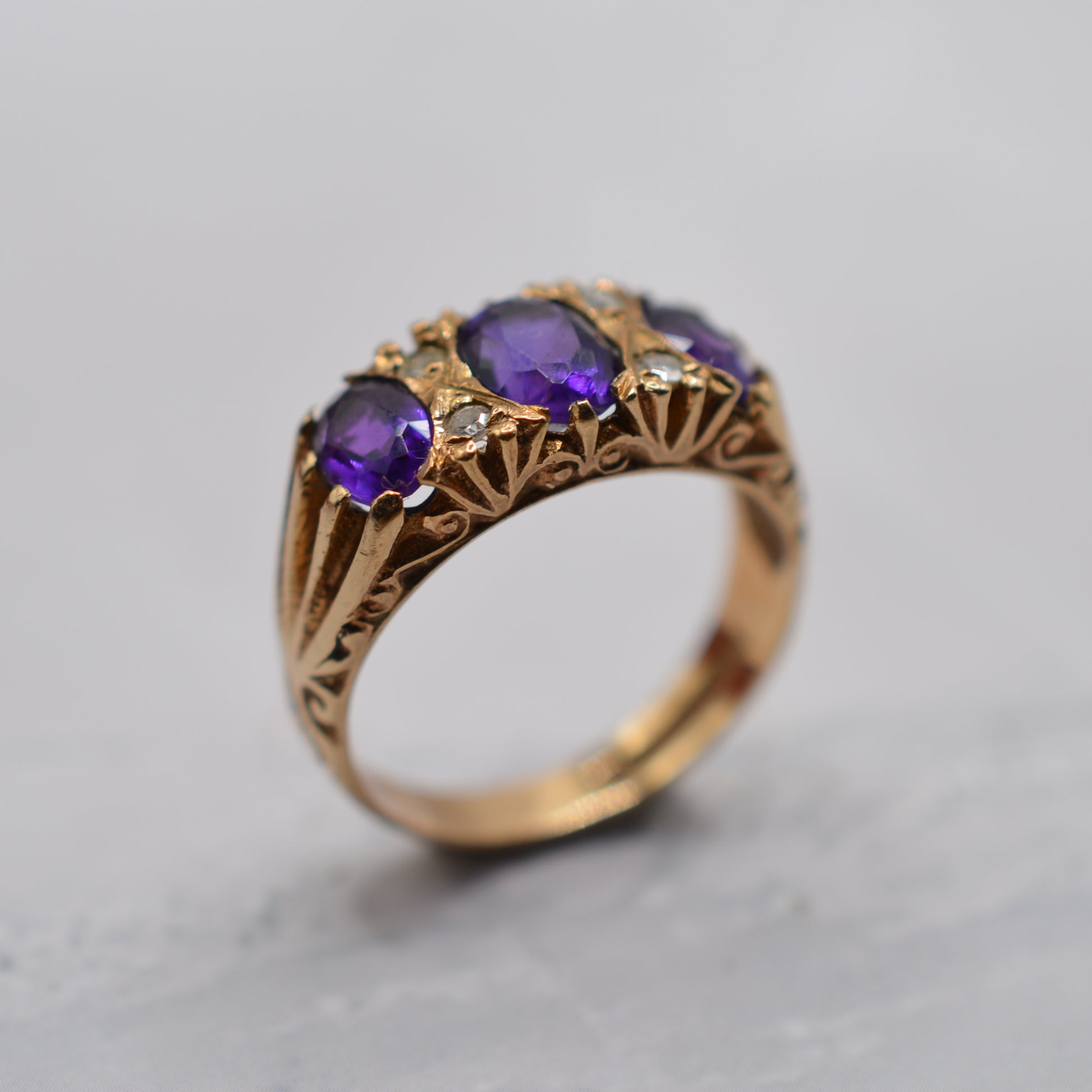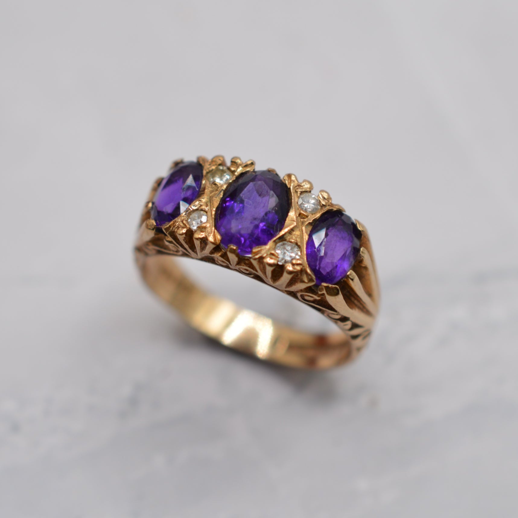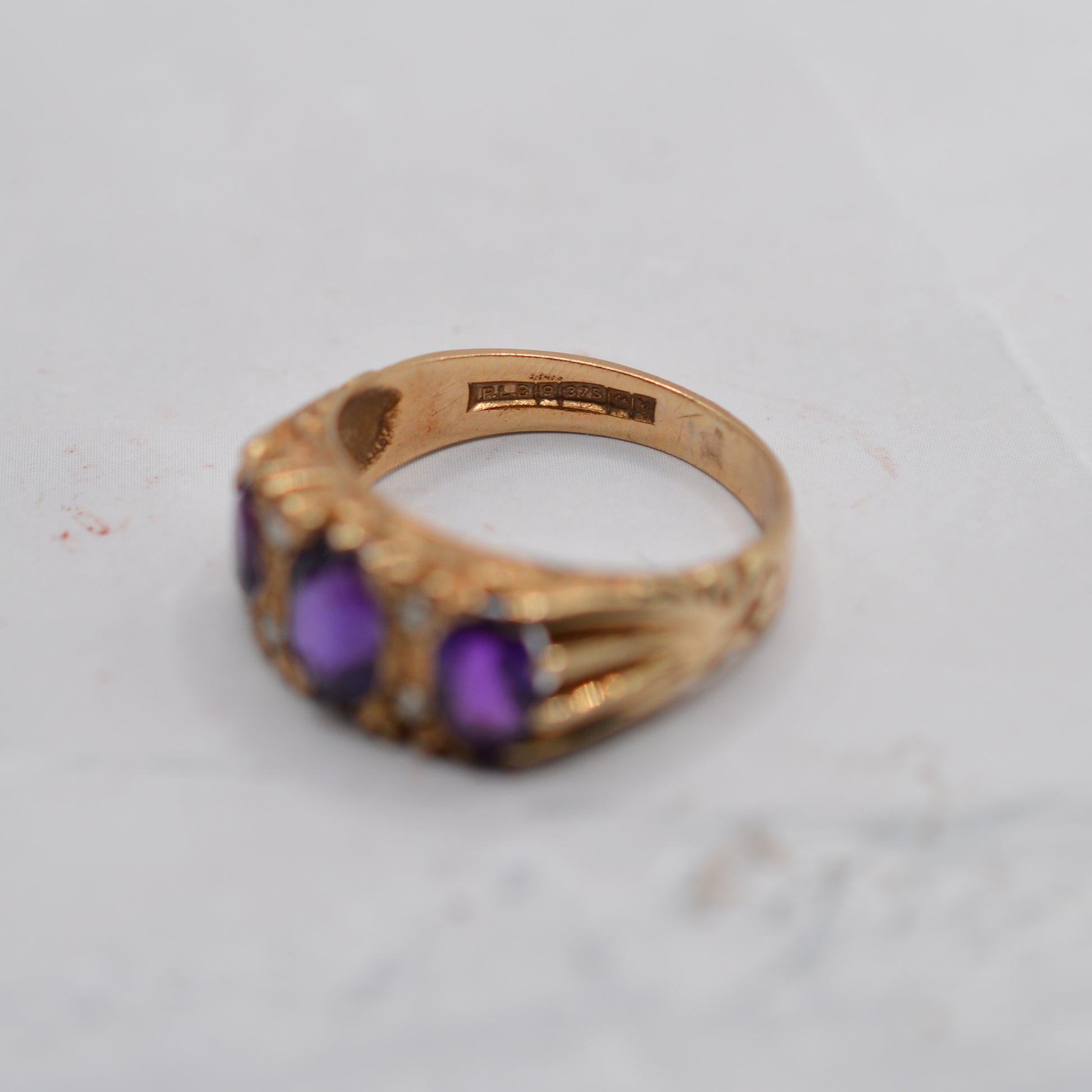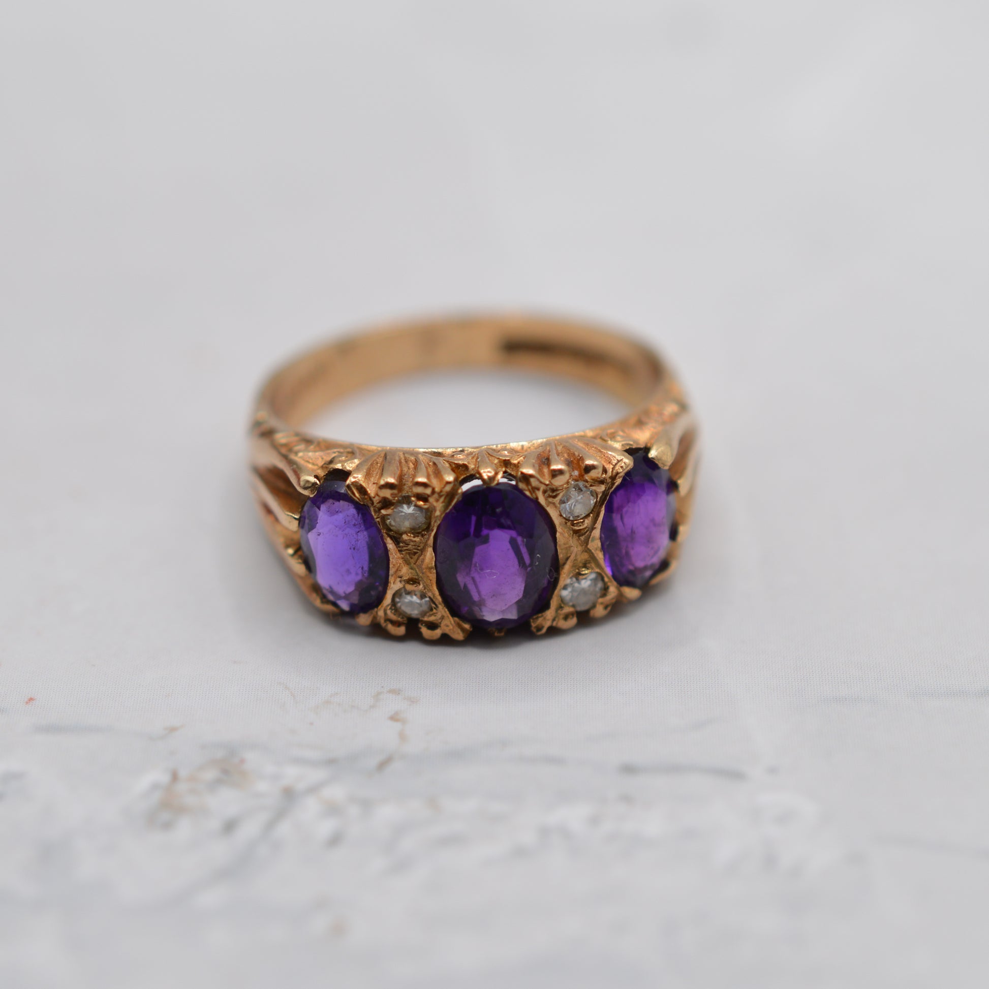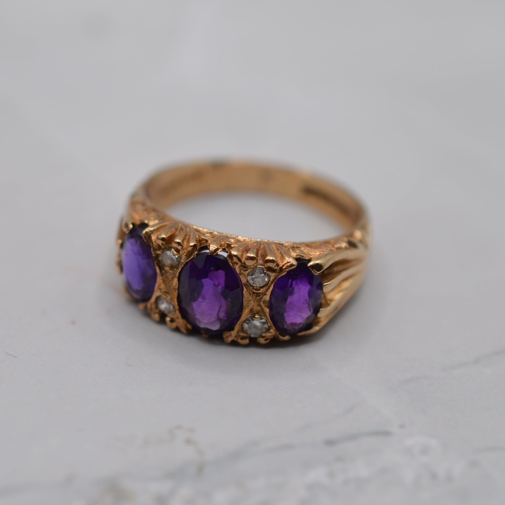 A beeeautiful vintage 9ct gold gypsy ring from the 1970s! This chunky design features a trilogy of oval-cut amethysts in a rich, regal shade of purple, with the largest (central) gemstone measuring approx. 8mm x 5mm. Four diamonds are set between the amethysts, adding a delightful sparkle against the buttery gold band. At approx. 9mm wide at its broadest point and weighing 3.6 grams, this is a substantial, luxurious and eye-catching piece of vintage 1970s jewellery.