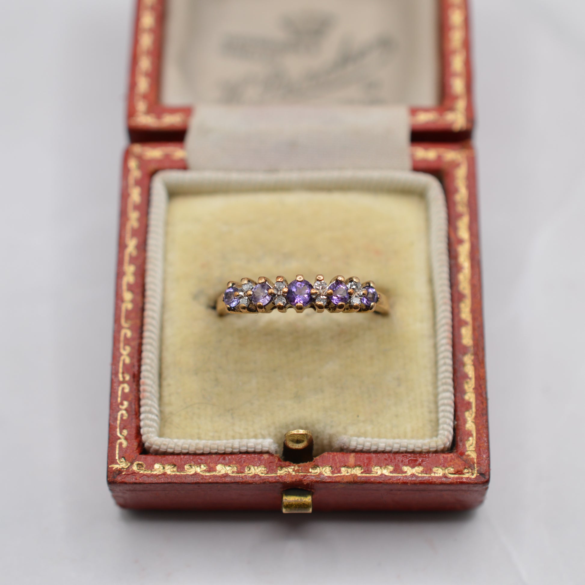 A rather sweet 9ct gold amethyst & diamond half-eternity ring! This minimalist piece features round lilac-toned amethysts interspaced with little twinkly diamonds, forming a versatile piece that is perfect worn alone or stacked with other bands.