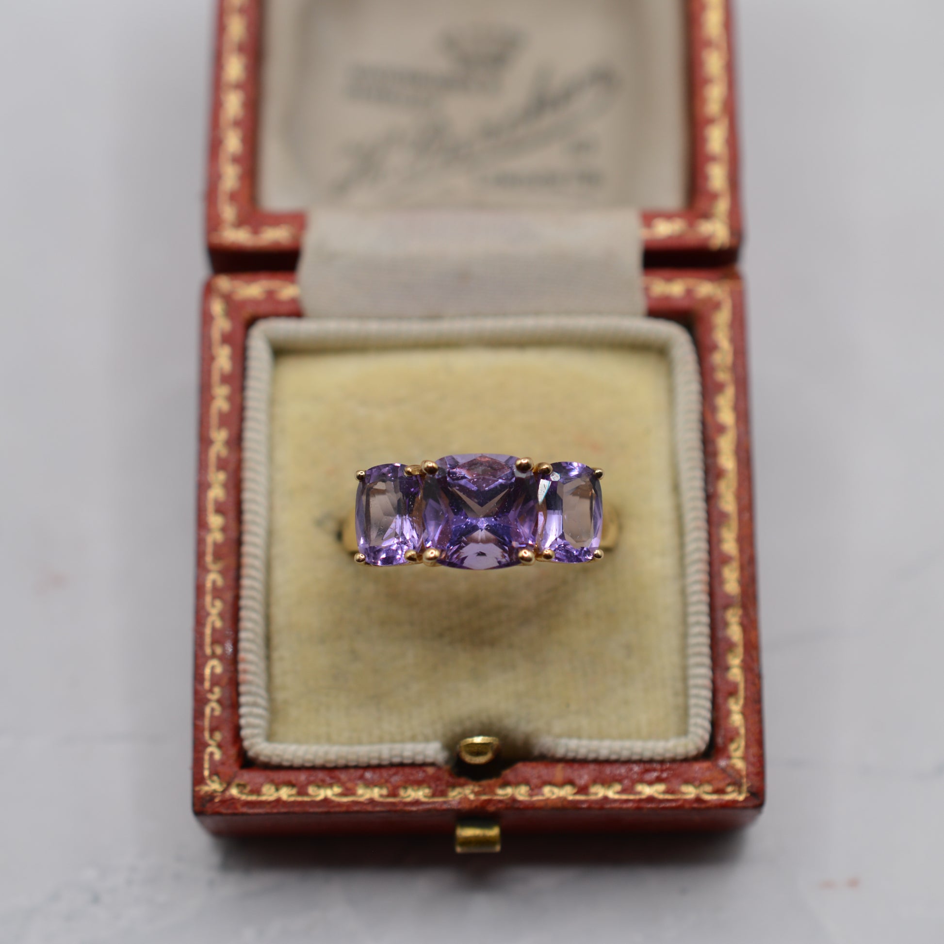 An utterly stunning chunky 9ct gold trilogy ring! This delightfully eye-catching piece features three large oval amethysts in a beautiful shade of rich purple, each with lovely clarity and sparkle. The central stone is the largest (approx. 8mm x 7mm), flanked by two slightly smaller, well-matched stones. Perfect if you love chunky, colourful vintage jewellery!