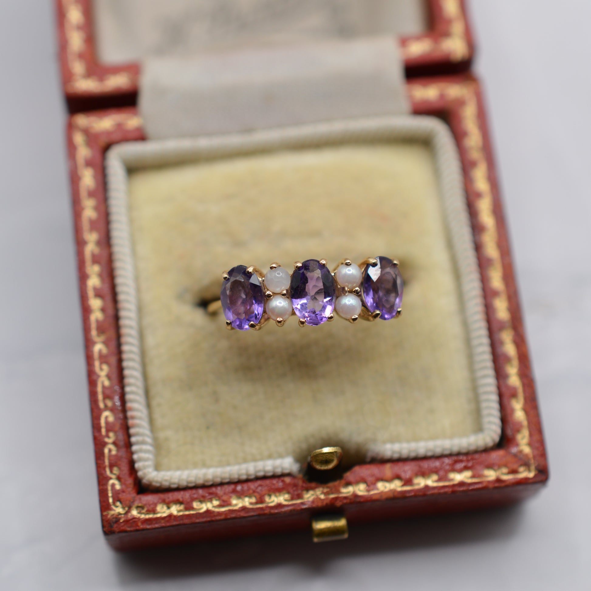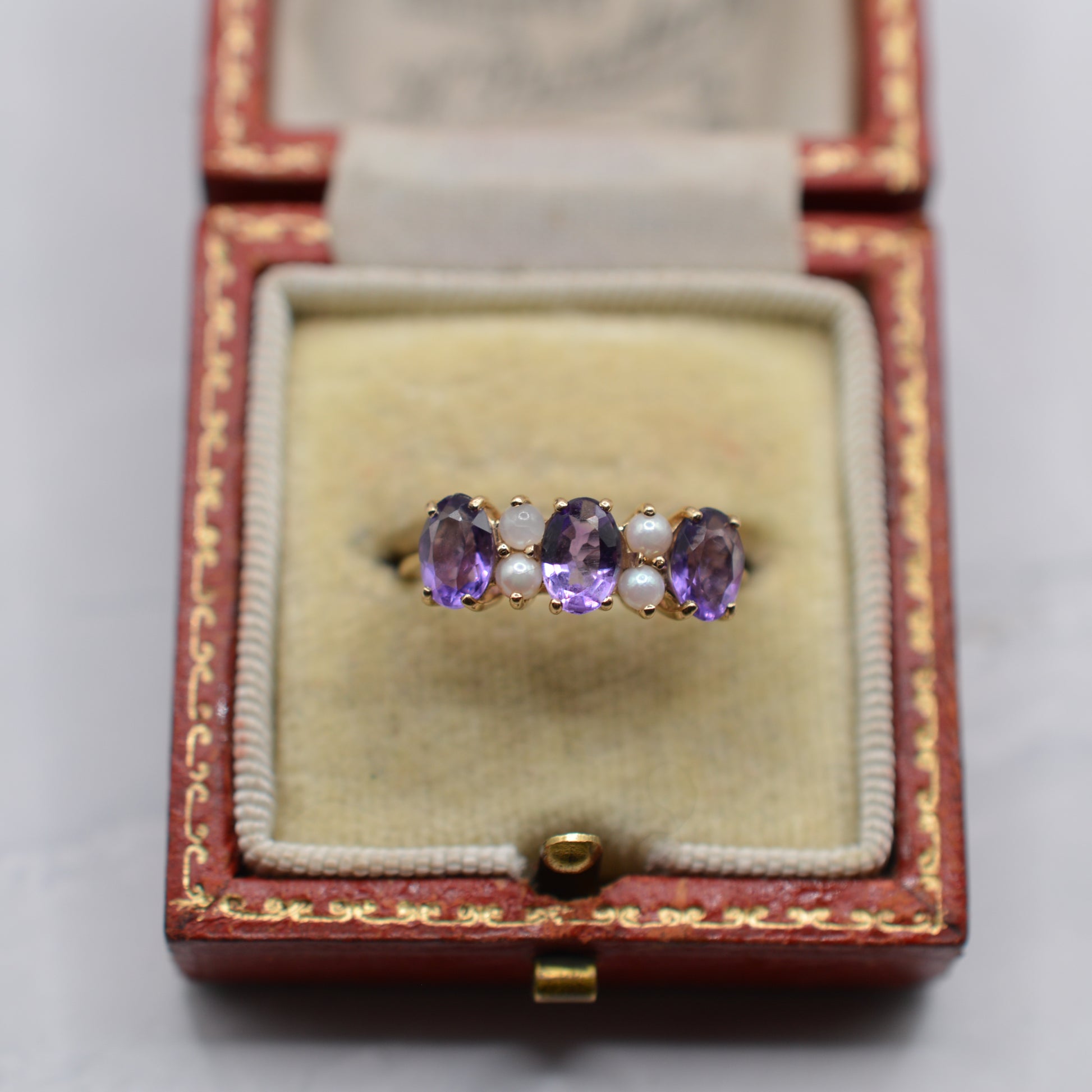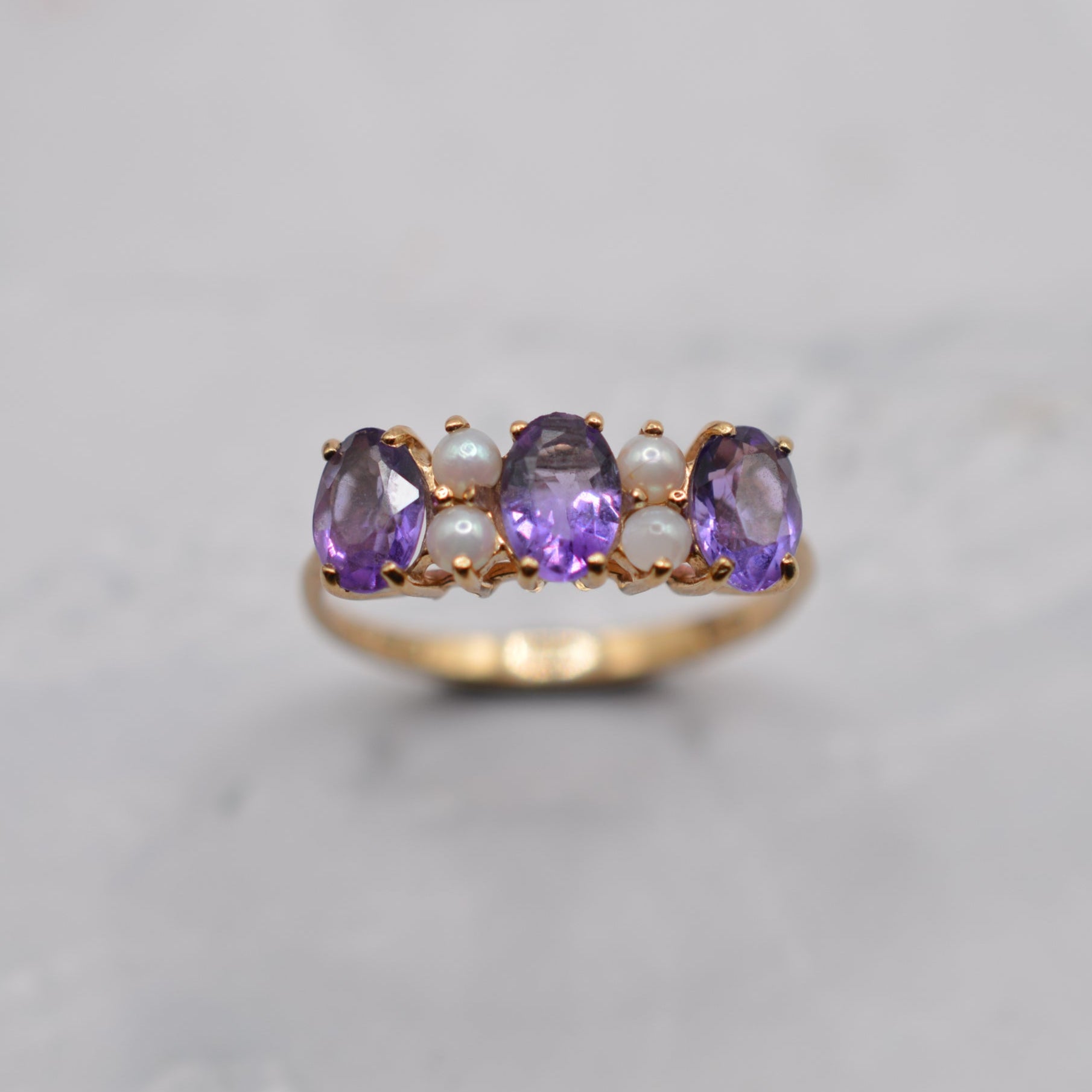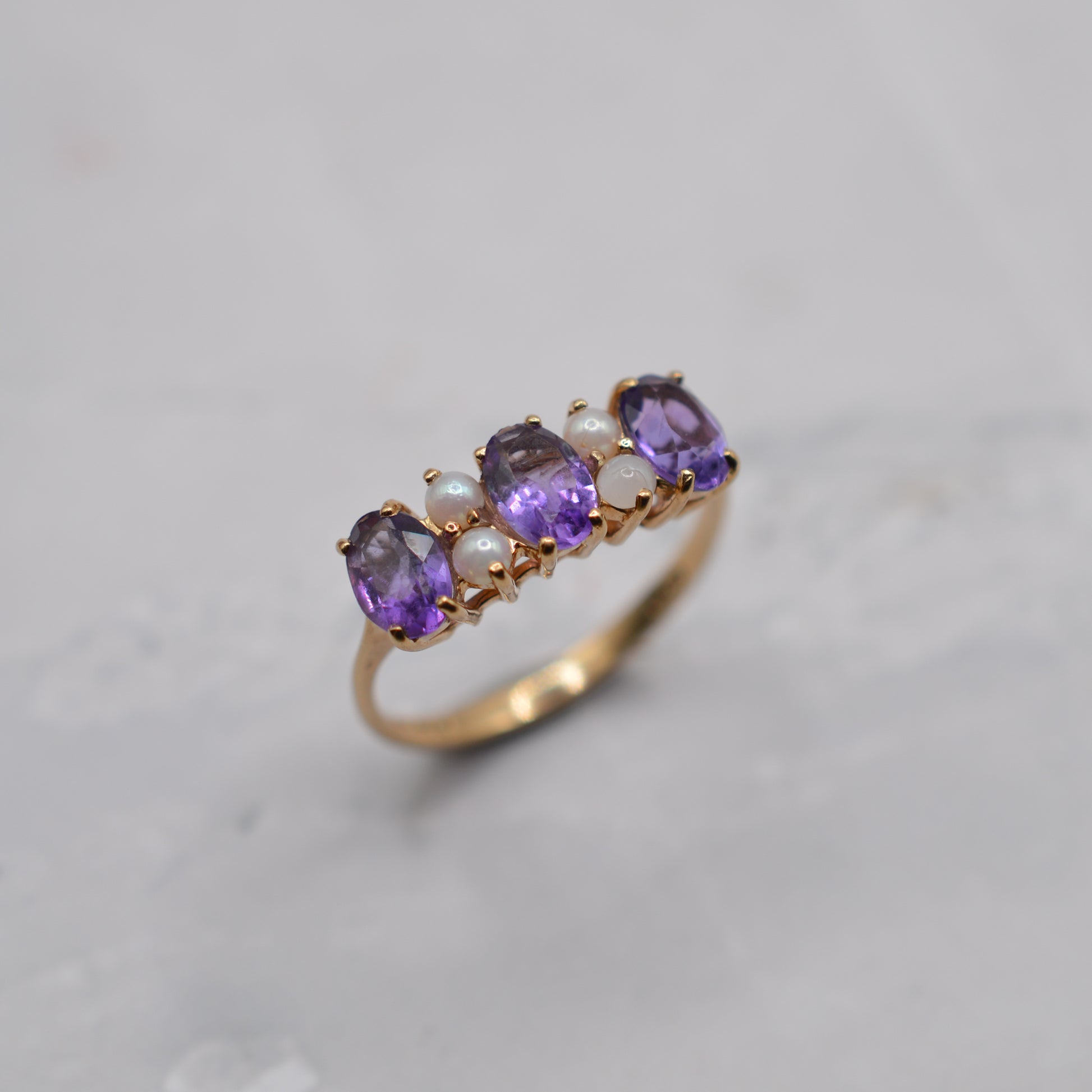 A beautifully elegant 9ct gold amethyst and pearl ring from the 1980s. This lovely vintage piece features a seven-stone design, set with three oval-cut amethysts in a rich, warm shade of purple, interspersed with four white pearls -- amethysts and pearls as ever making a graceful combination!