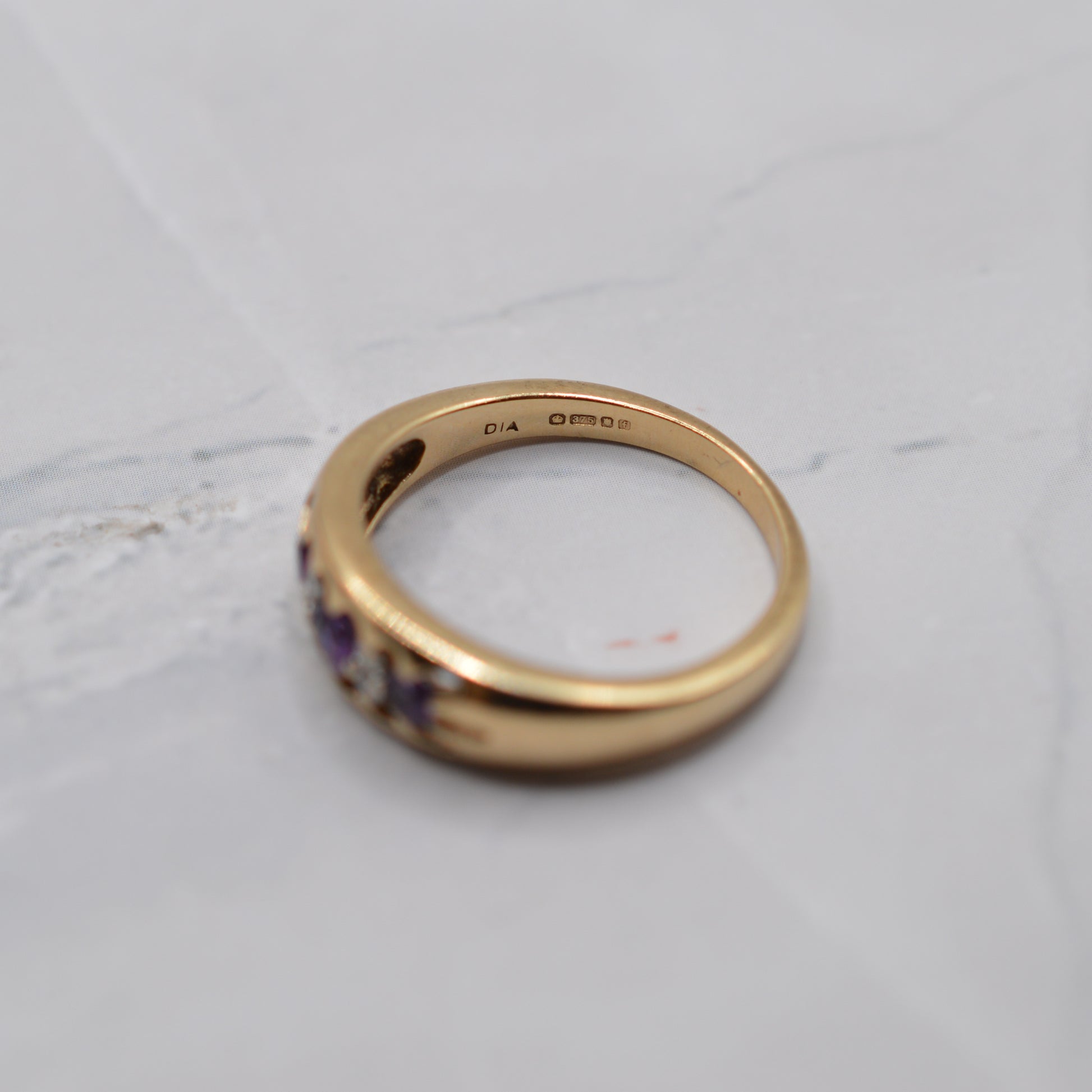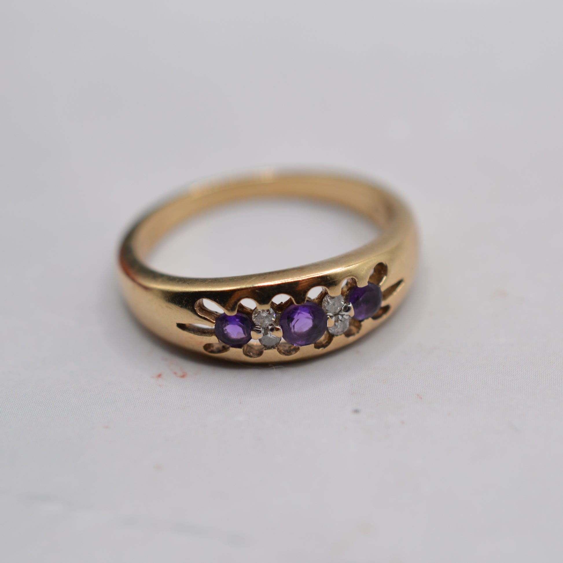 A suuuper pretty 9ct gold amethyst and diamond gypsy ring! This lovely Y2K piece features three round-cut amethysts, interspersed with four little sparkling diamonds that add a little twinkle. The stones are set in a traditional claw fashion reminiscent of Victorian design and the setting measures approx. 6mm at its widest point, making it a lovely everyday ring that mixes contemporary and antique style.
