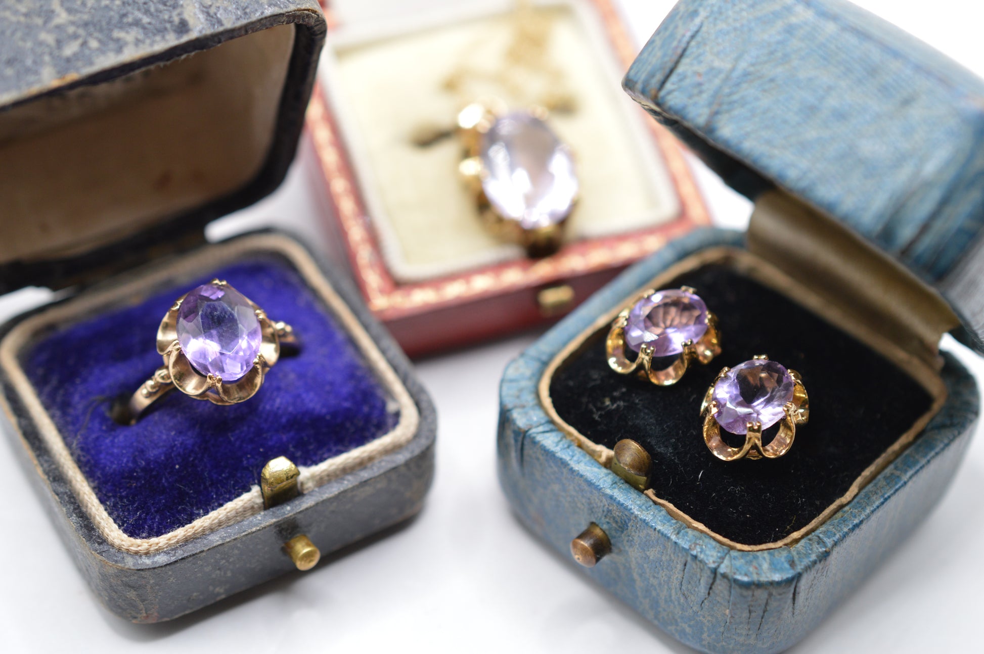 An absolutely gorgeous trio of vintage 9ct gold amethyst jewellery! This little collection is the perfect way to start (or expand) your vintage collection: each piece features a pretty oval-cut amethyst in shades of lilac purple, claw-set in fabulous buttercup-style gold settings that give them a rich, floral look.