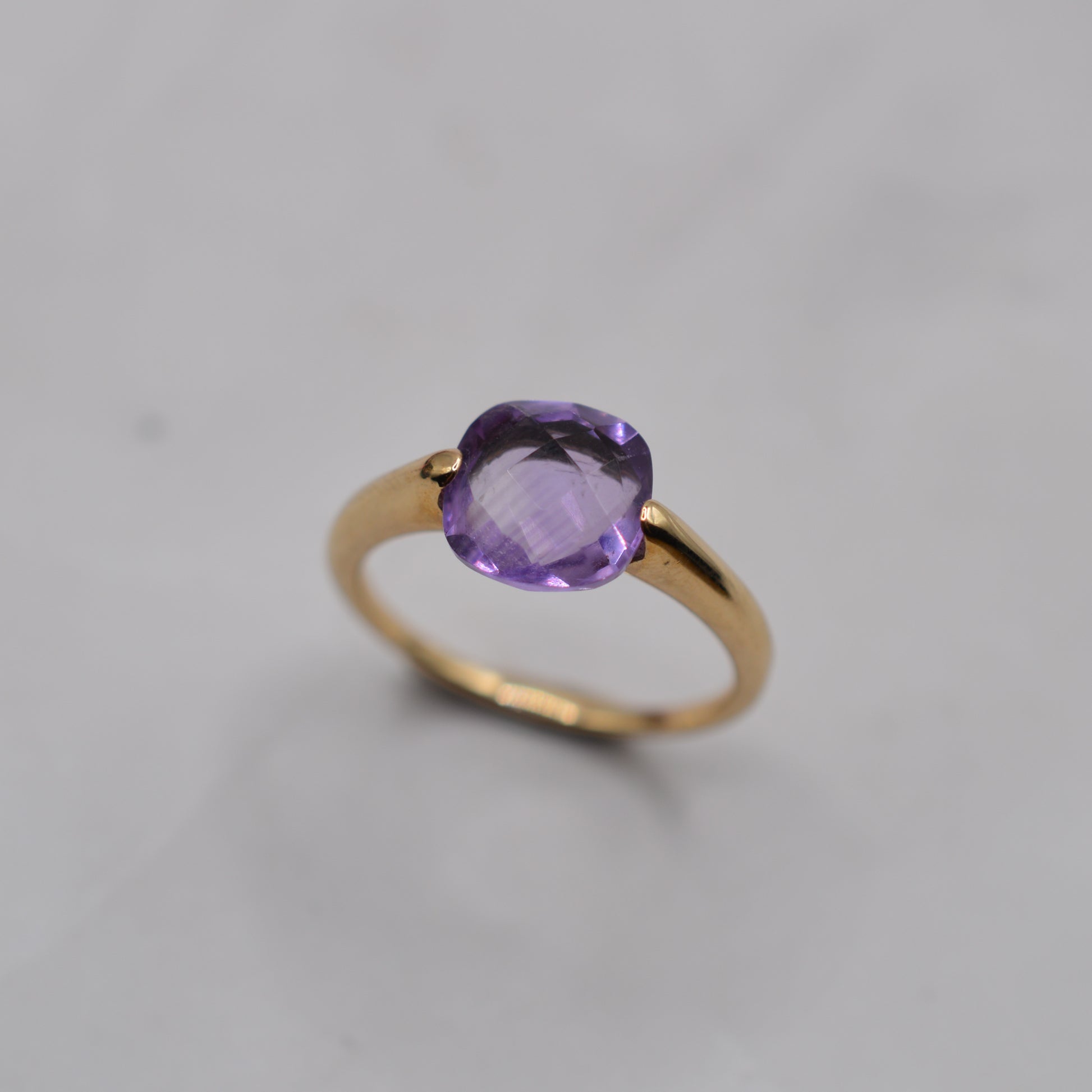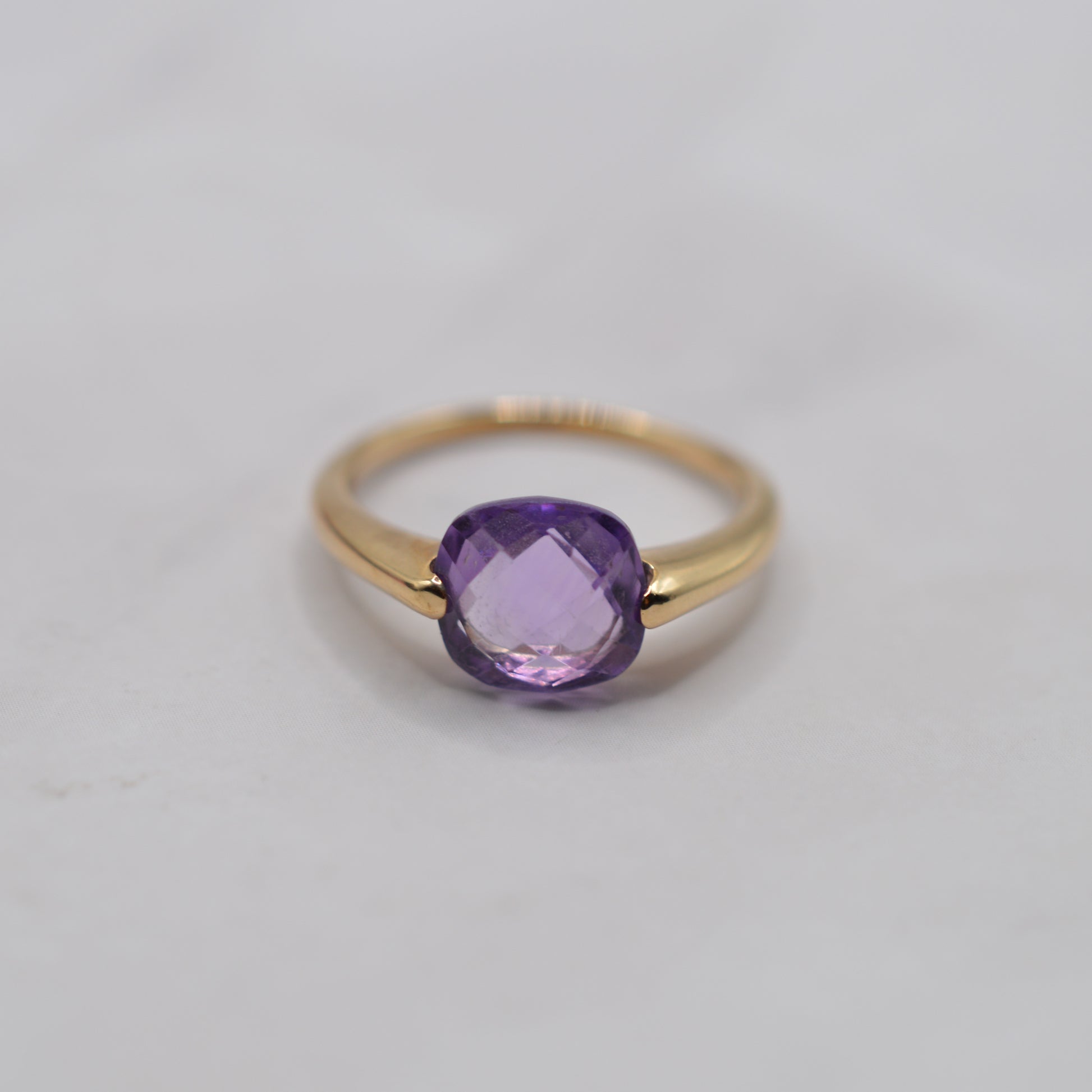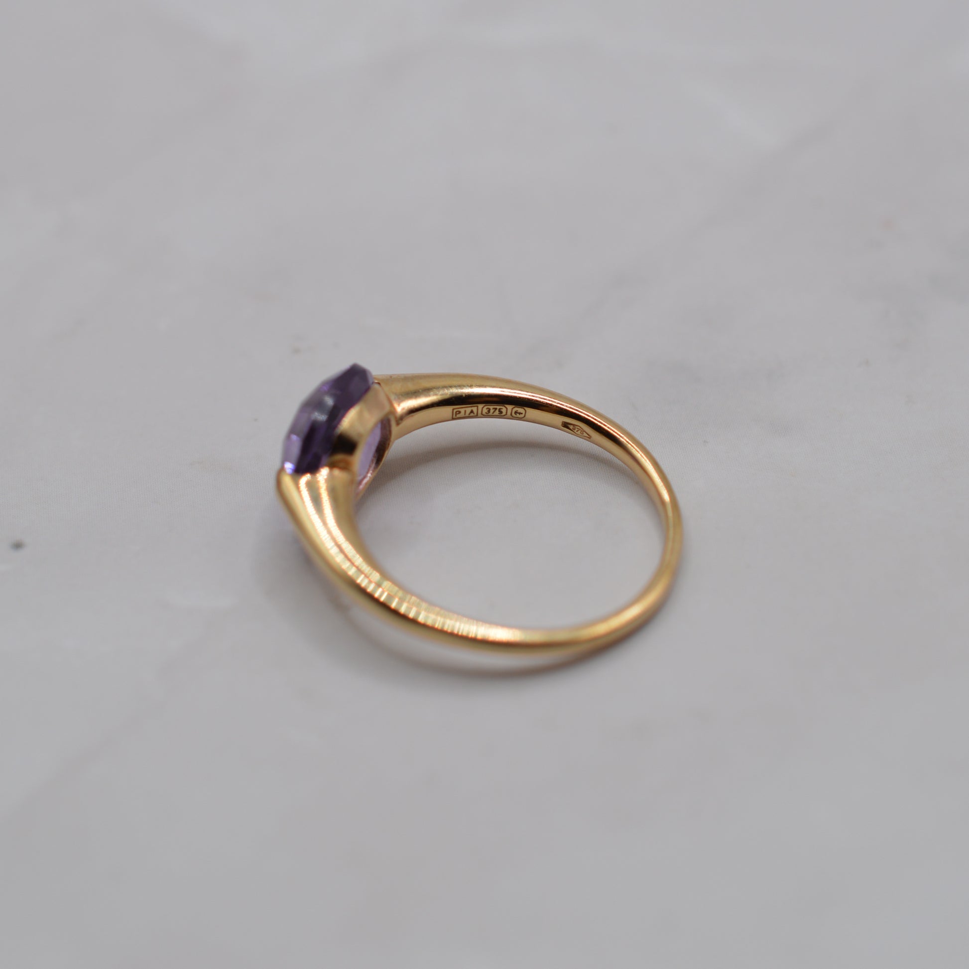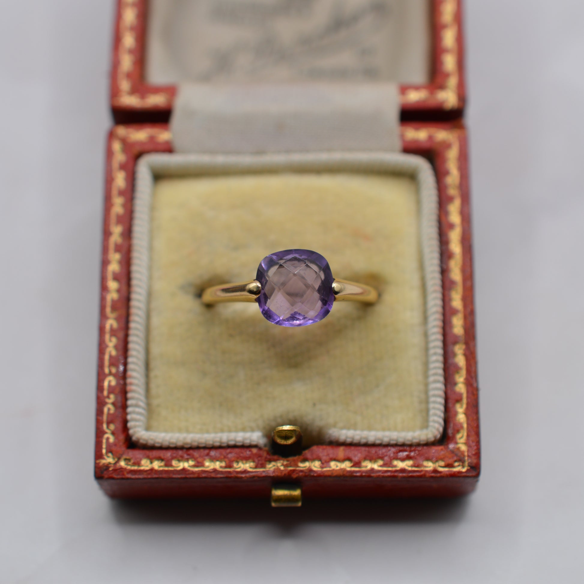 An elegant 9ct gold amethyst solitaire ring! This beautiful piece features a cushion-cut amethyst with striking checkerboard facets, giving the stone gorgeous sparkle and clarity. The gem is tension-set into a sleek polished gold band, creating a minimalist yet luxurious design that really lets the amethyst pop. A beautiful ring perfect for amethyst lovers and those who enjoy clean, modern lines.