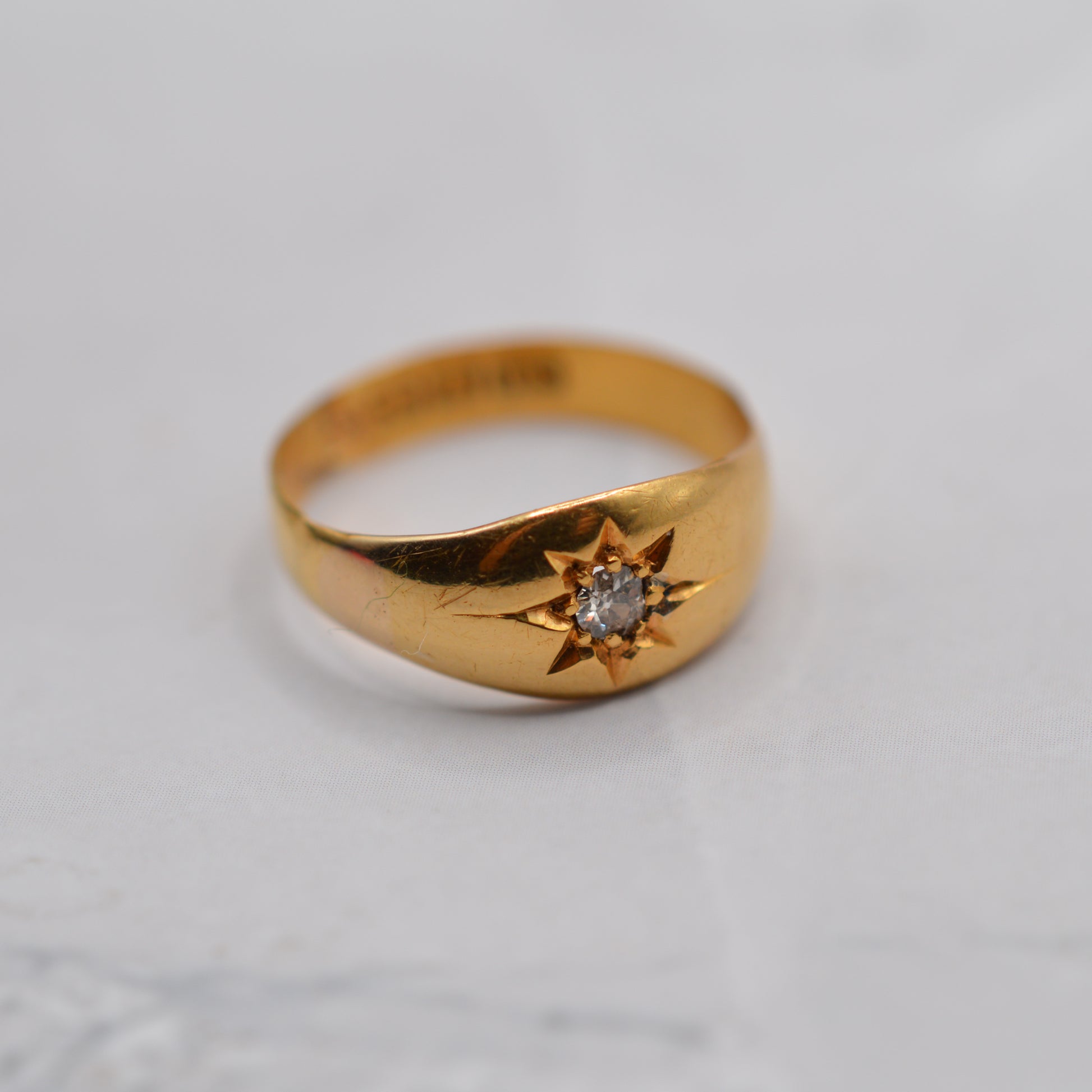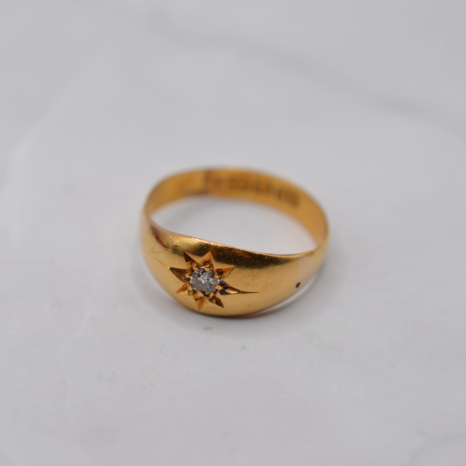 A truly stunning antique 22ct gold gypsy ring, set with a bright old-cut diamond in a classic starburst setting. This late Victorian piece is crafted from beautifully rich, buttery-yellow 22ct gold, while the diamond adds a little sparkle as a centrepiece. A perfect choice whether you're looking for a treasured heirloom, antique engagement ring, chunky stacker or a luxurious self-treat!