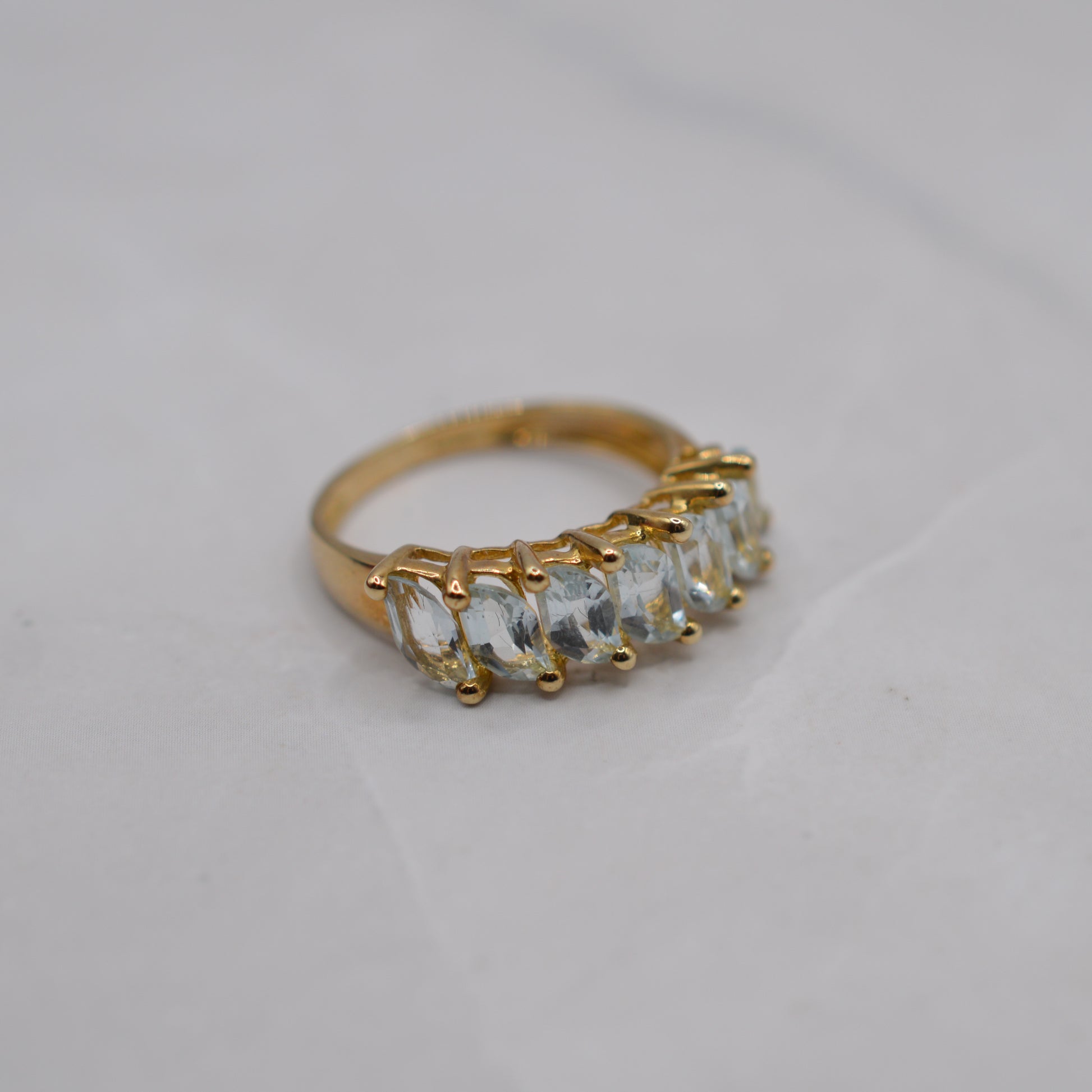 A beeeautiful Y2K-era 9ct gold aquamarine half-eternity ring. This gorgeous piece features seven claw-set, oval-cut aquamarines in a crisp ice blue, each sparkling beautifully in the light. The stones are arranged in a curved row across the finger, creating a modern twist on the half-eternity design with that has substantial presence. Such a fantastic March birthstone piece and a fabulous statement dress ring that's sure to grab attention!