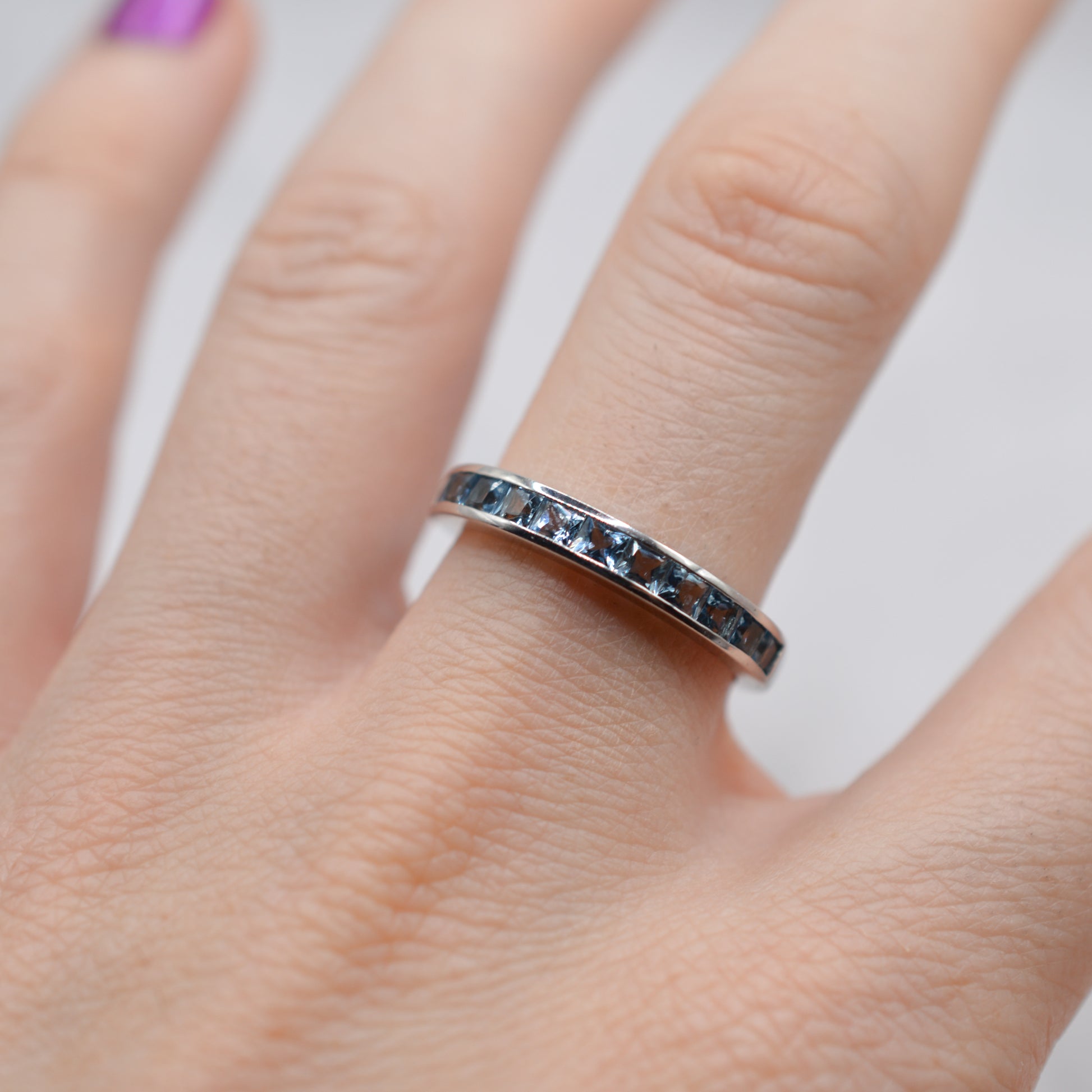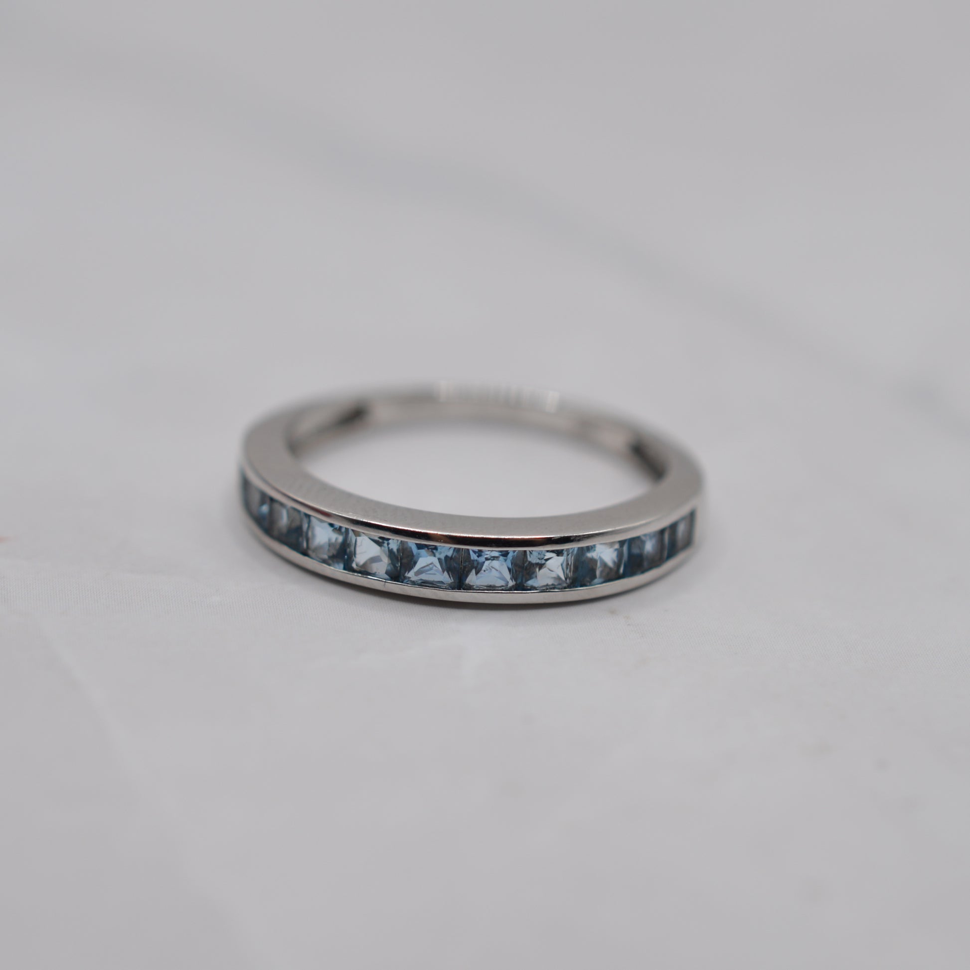 A beautiful 9ct white gold aquamarine half-eternity ring. This elegant piece features a row of princess-cut aquamarines in a soft shade of ice-blue, all channel-set into a shiny white gold band. The stones are well-matched, sparkly, and give the ring a lovely clean, contemporary feel, perfect worn alone or stacked with other bands.