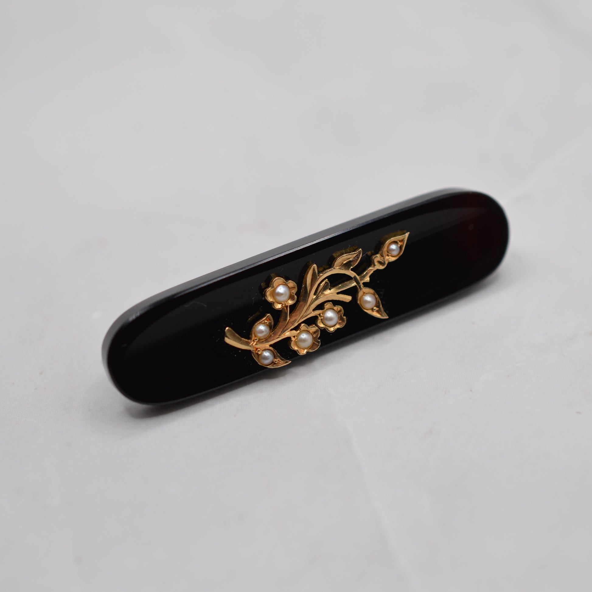 A beautiful mid-century mourning-style brooch, featuring a sleek, elongated black panel accented with an elegant floral and foliate design set with delicate split pearls. The black panel appears to be a hardstone or early synthetic material (e.g. bakellite), with the applied floral motif contrasting beautifully. The design is very reminiscent of Victorian mourning jewellery, although is likely to have been made later (c.1950s).