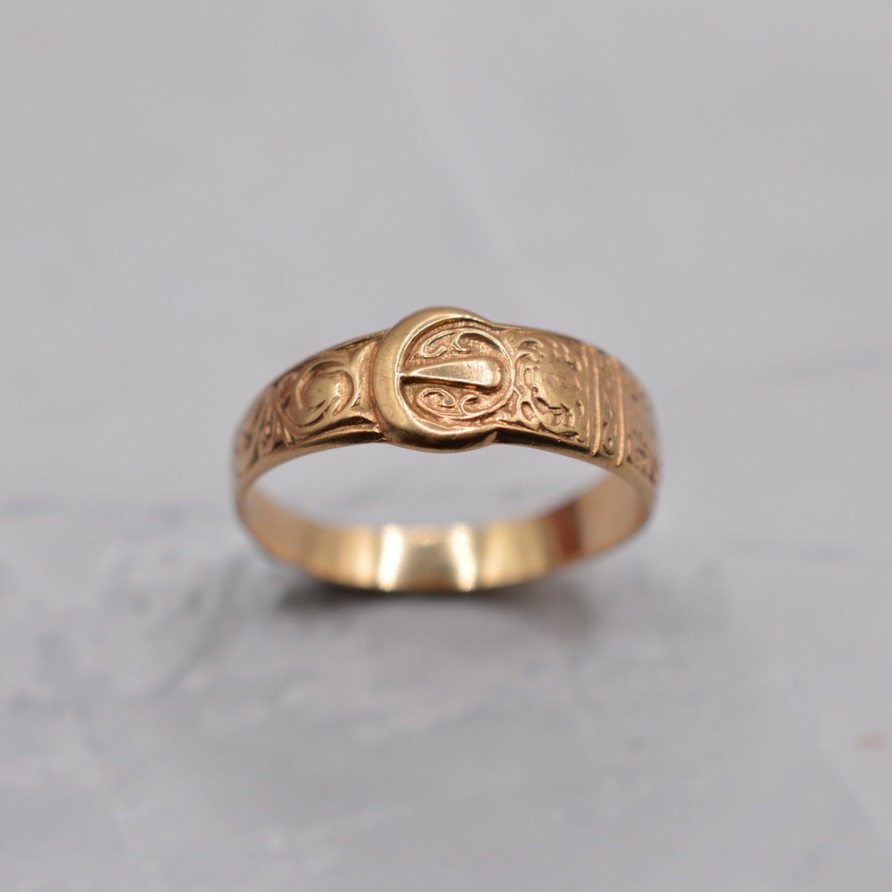 A rather pretty 9ct gold buckle ring from the 1980s. This classic design features an overlapping belt and buckle motif with delicate swirl and foliate engravings along the belt area; the ring also has an asymmetrical band, with one side of the buckle slightly thicker than the other. Such a perfect piece for everyday wear that adds a little boho/western/cowgirl charm!