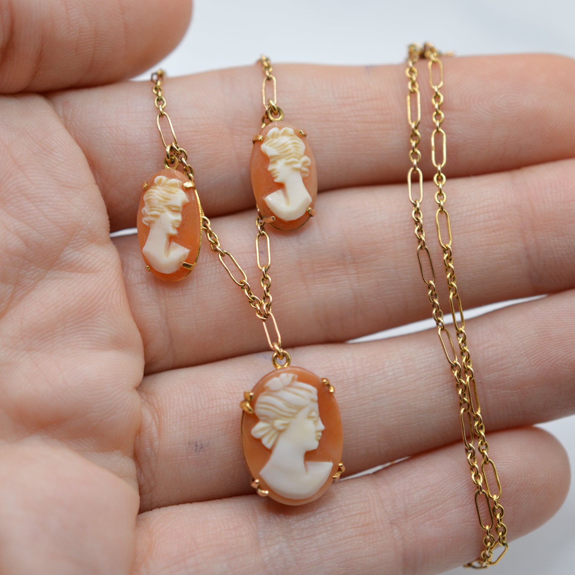 An utterly beautiful and elegant 9ct gold triple cameo necklace. This rare 1980s piece features a classic Figaro chain with three oval carved cameos -- one larger central cameo and two smaller matching cameos on either side -- depicting a lady’s profile. The necklace hangs beautifully, with the central cameo falling lower to add symmetry and depth. It has been beautifully made, with lovely carvings and a Victorian-inspired design. A perfect piece for cameo lovers and a stunning addition to any vintage jewellery collection!