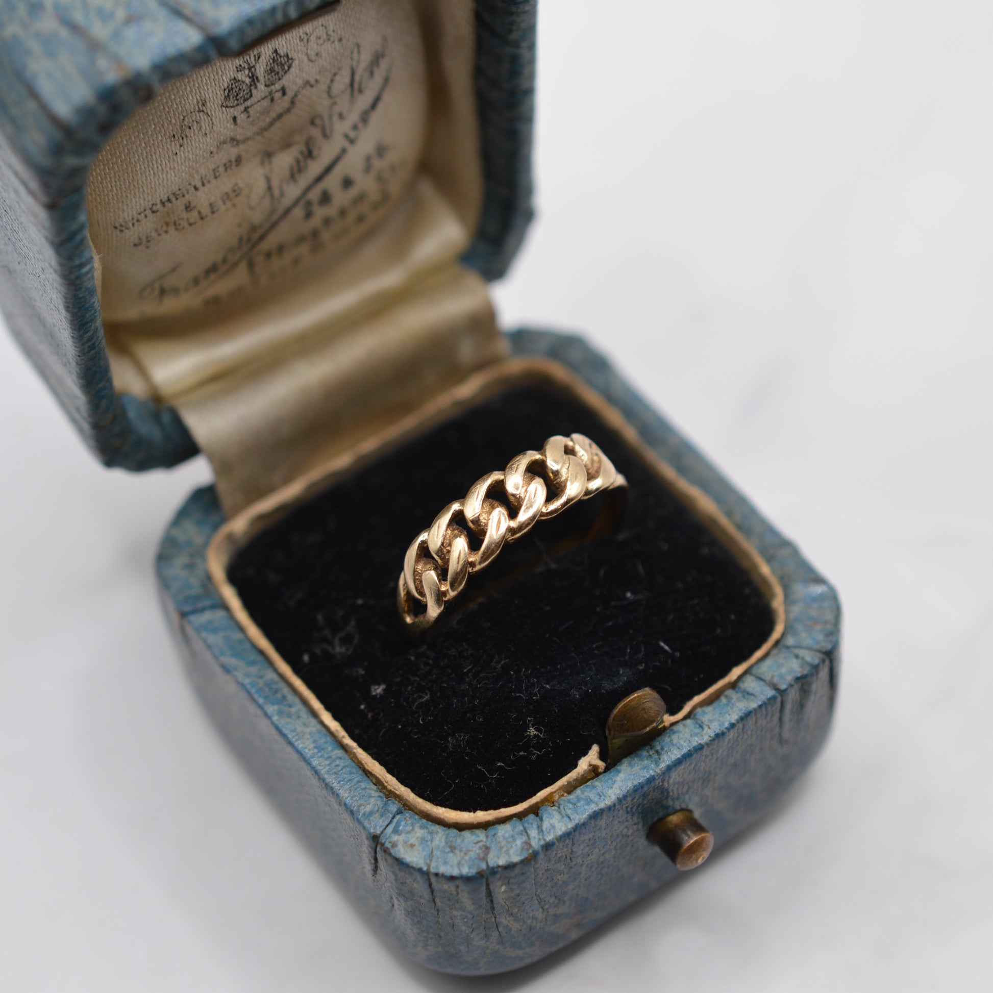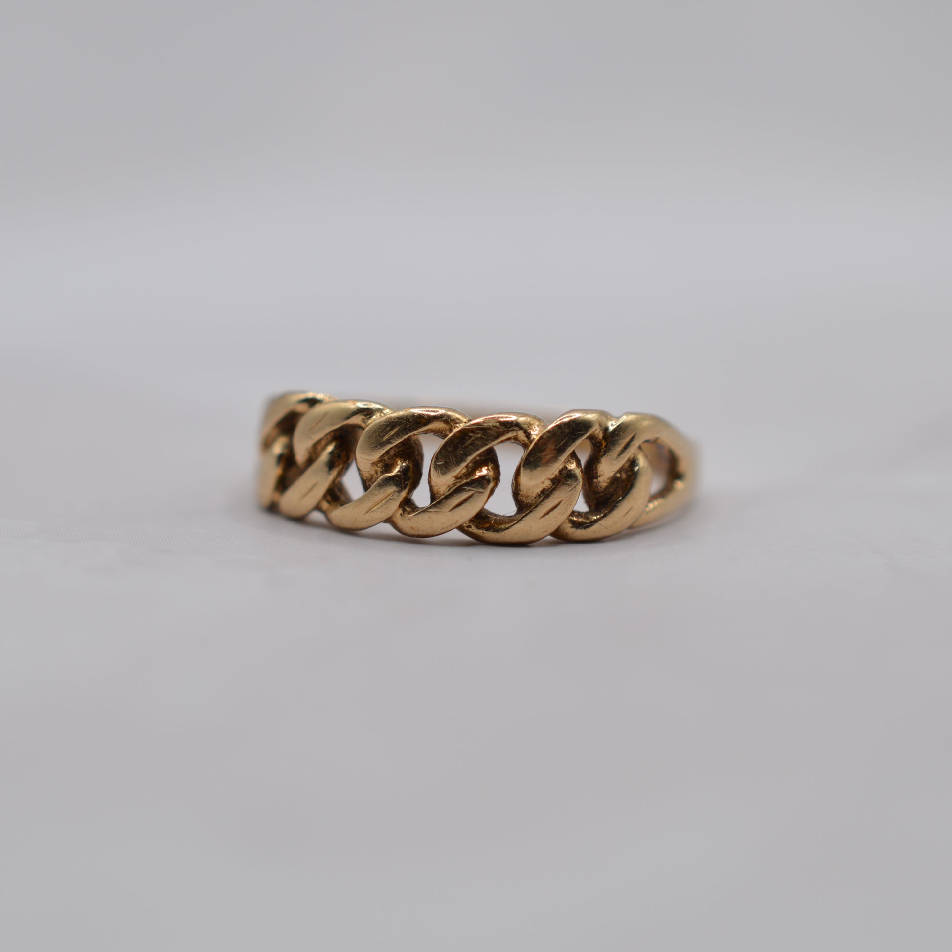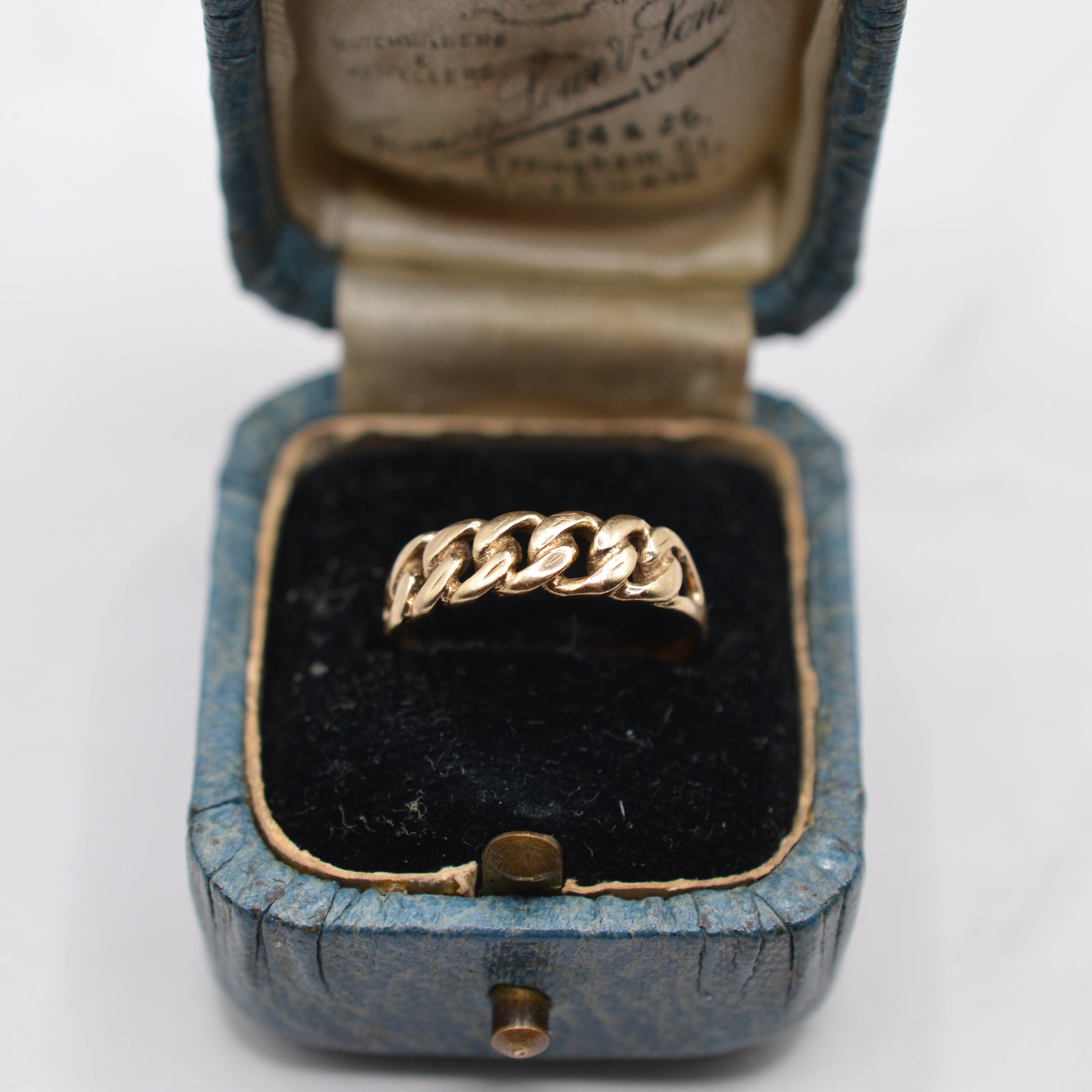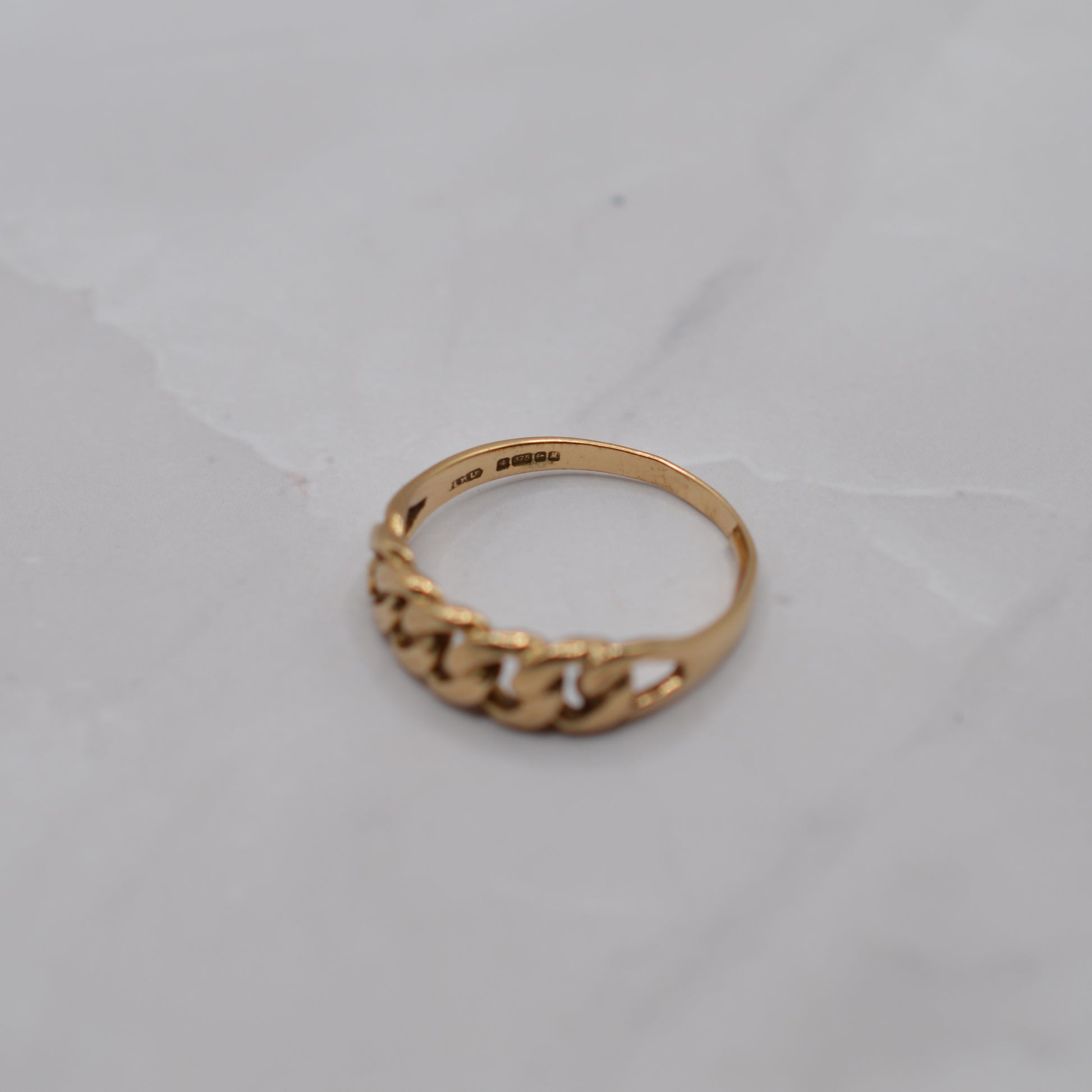 A super gorgeous 1980s 9ct gold chain ring! This lovely piece features a chunky row of interlinked chain-style links across the top of the band, with split shoulders leading to a smooth solid band at the back. A versatile and eye-catching design that's perfect worn either solo or as part of a stack.