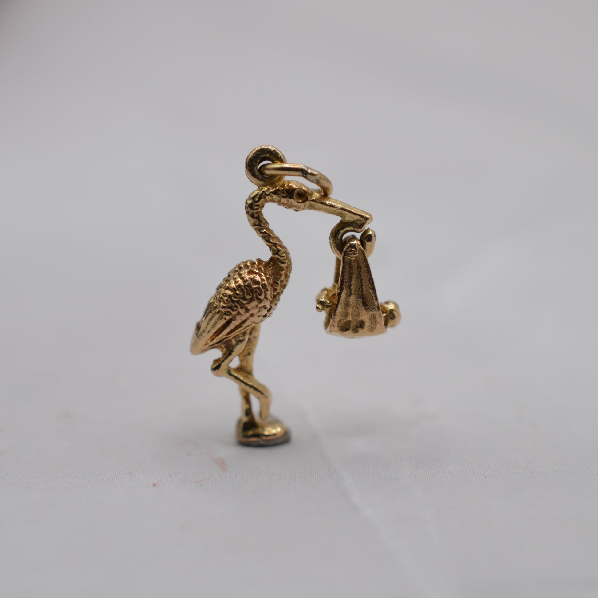 A rather special and unusual vintage 9ct gold charm featuring a stork delivering a baby. This beautiful 1970s piece is full of character and detail, with the stork finely engraved in textured gold and the baby bundle articulated, swinging beneath the beak. A lovely weighty charm in solid gold, it would make a thoughtful baby shower gift or a keepsake to commemorate a birth. Perfect for a charm bracelet or worn as a pendant.