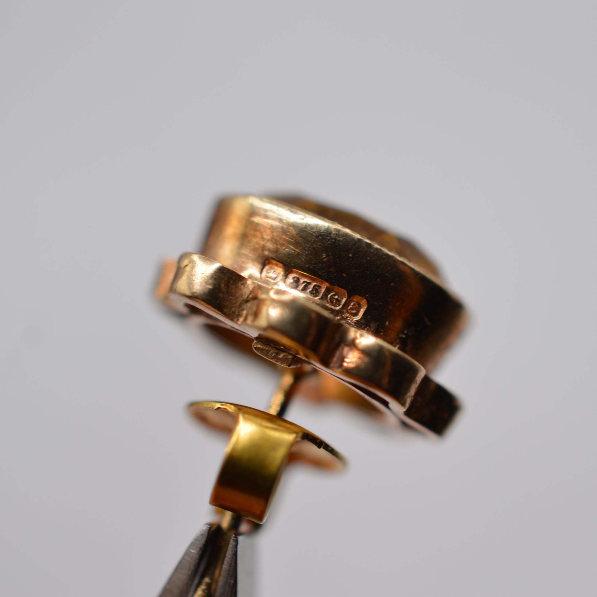 A very pretty pair of vintage 9ct gold citrine stud earrings from the 1970s. Each earring features an oval-cut citrine in a rich sunset-orange shade, bezel-set and framed by a decorative scallop-edged border. The citrines measure approx. 10mm x 8mm, with the overall stud size around 12mm x 10mm. Such a gorgeous, colourful pair of studs that will add a bit of sunshine to any collection!