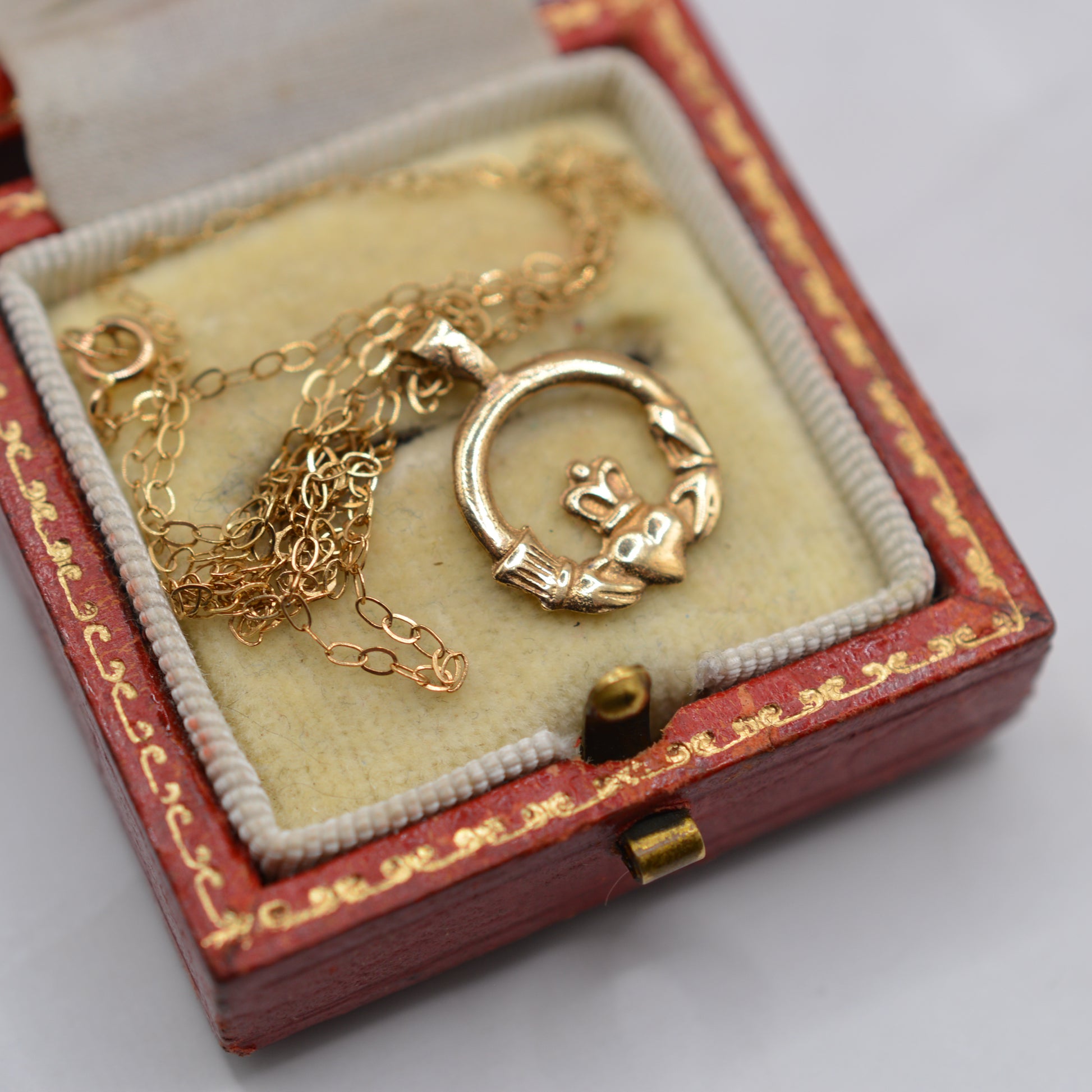 An adorable little preloved 9ct gold Claddagh heart pendant necklace. This dainty round pendant features the traditional Irish Claddagh design, with a heart held in two hands and topped with a crown, symbolising love, loyalty and friendship. It is Irish-made (hallmarked in Dublin) and the pendant measures approx. 12mm across and hangs from an 18" (46cm) round-link chain, making it a perfect minimalist necklace or layering piece.