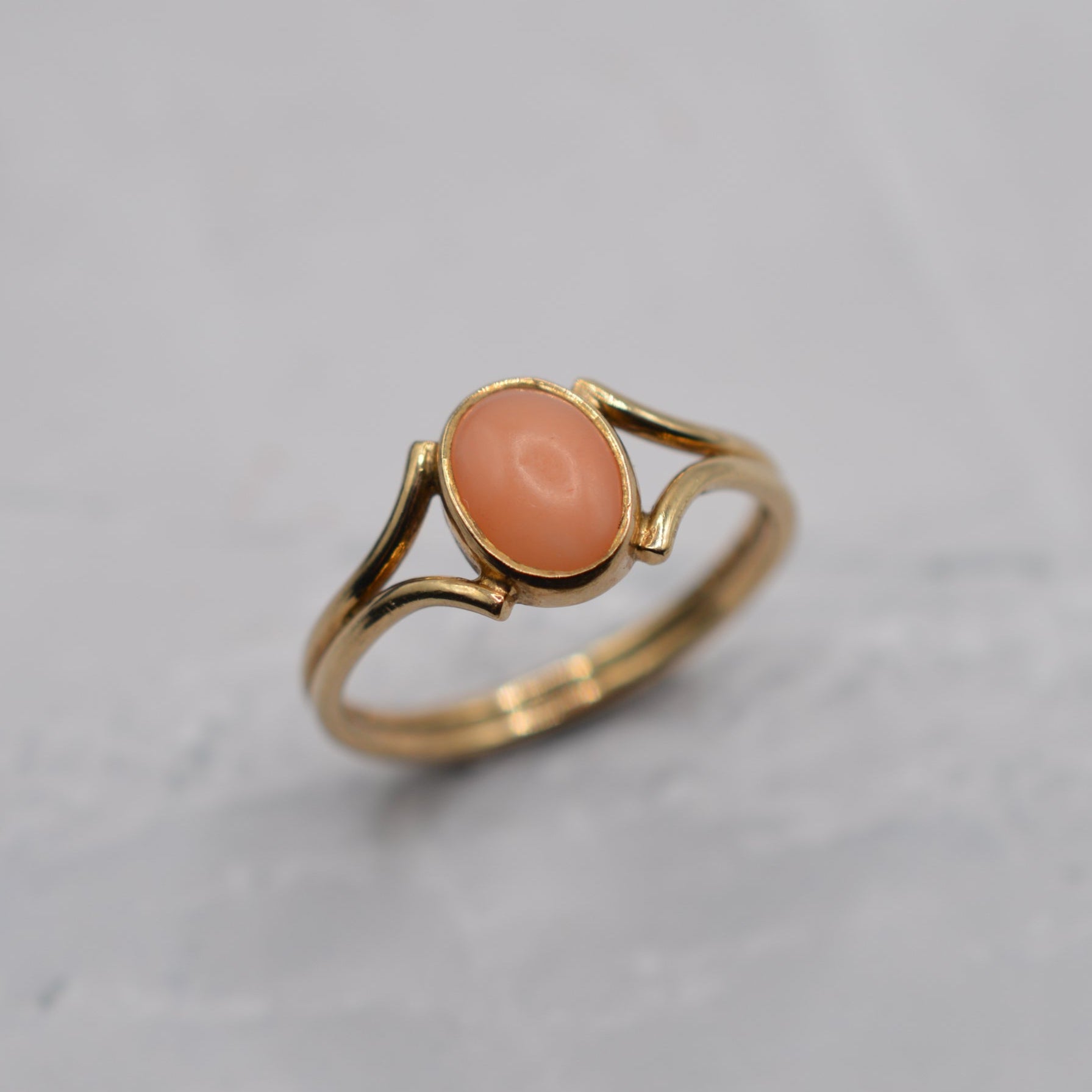 A super sweet vintage 9ct gold coral ring! This 1970s piece features a soft peach-coloured coral cabochon, bezel-set in a simple and elegant mount with split shoulders. This is a charming piece that is perfect for adding a touch of retro style to any collection.
