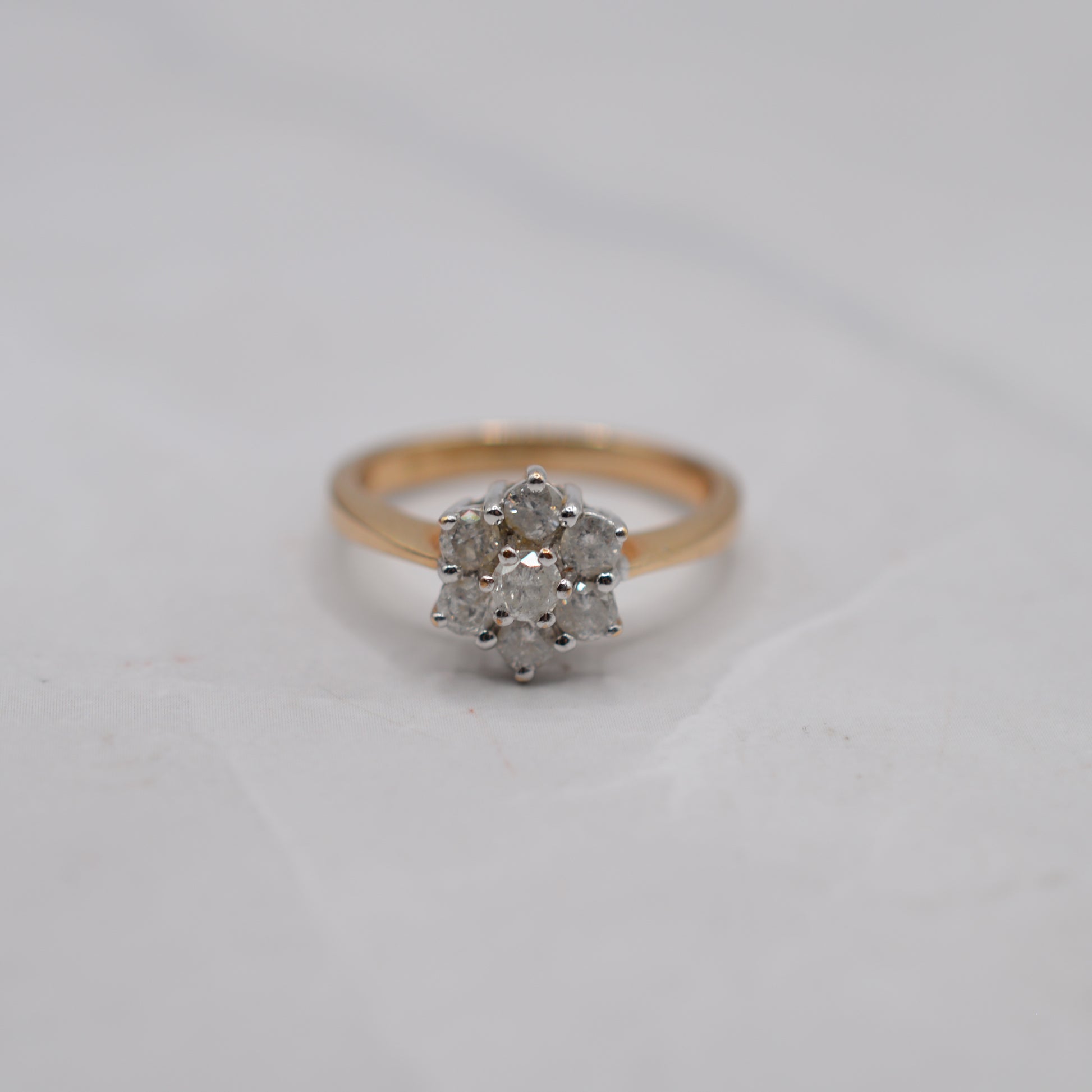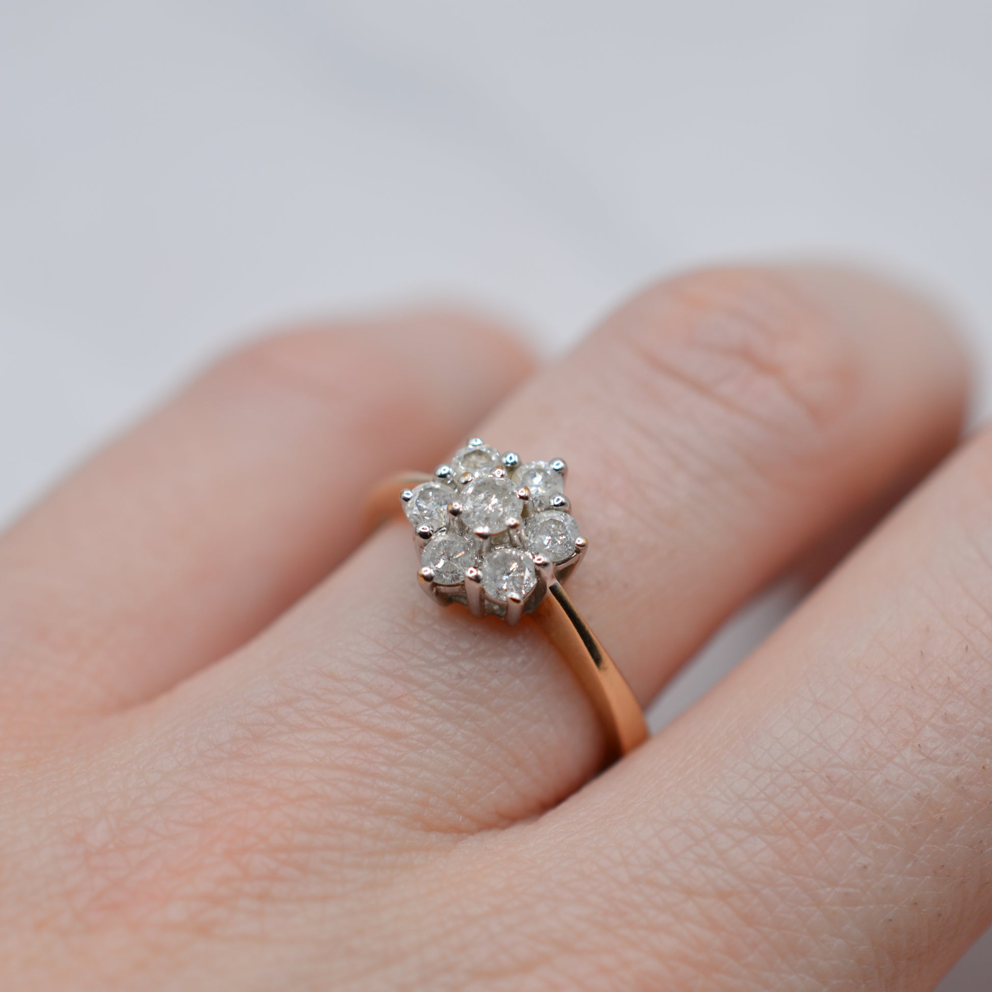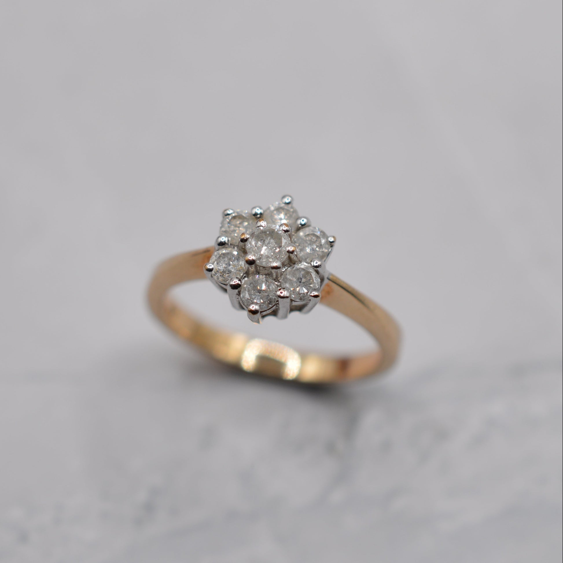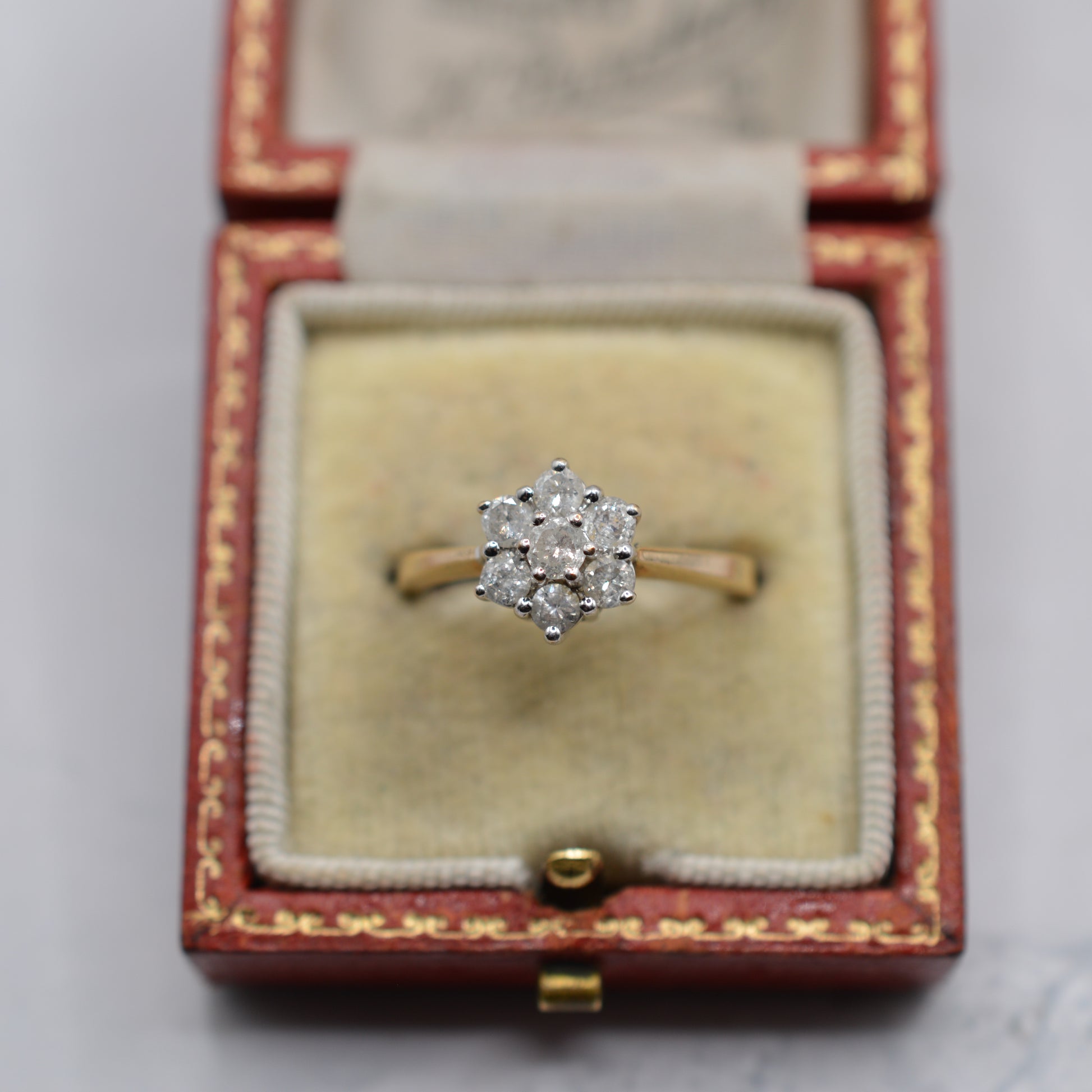 A marvellous 9ct gold diamond cluster ring with an impressive total diamond weight of 0.50 carats. This beautiful piece features a classic floral cluster design, with a slightly larger central diamond framed by six further brilliant-cut diamonds. The diamonds offer lovely brightness and sparkle, arranged in a cluster measuring approx. 10mm in diameter; the cluster is also set in white gold to enhance the brilliance of the diamonds, while the band is made of buttery yellow gold. An absolutely beautiful ring that would make a perfect self-indulgent treat, a gorgeous engagement ring or a special occasion piece or gift.