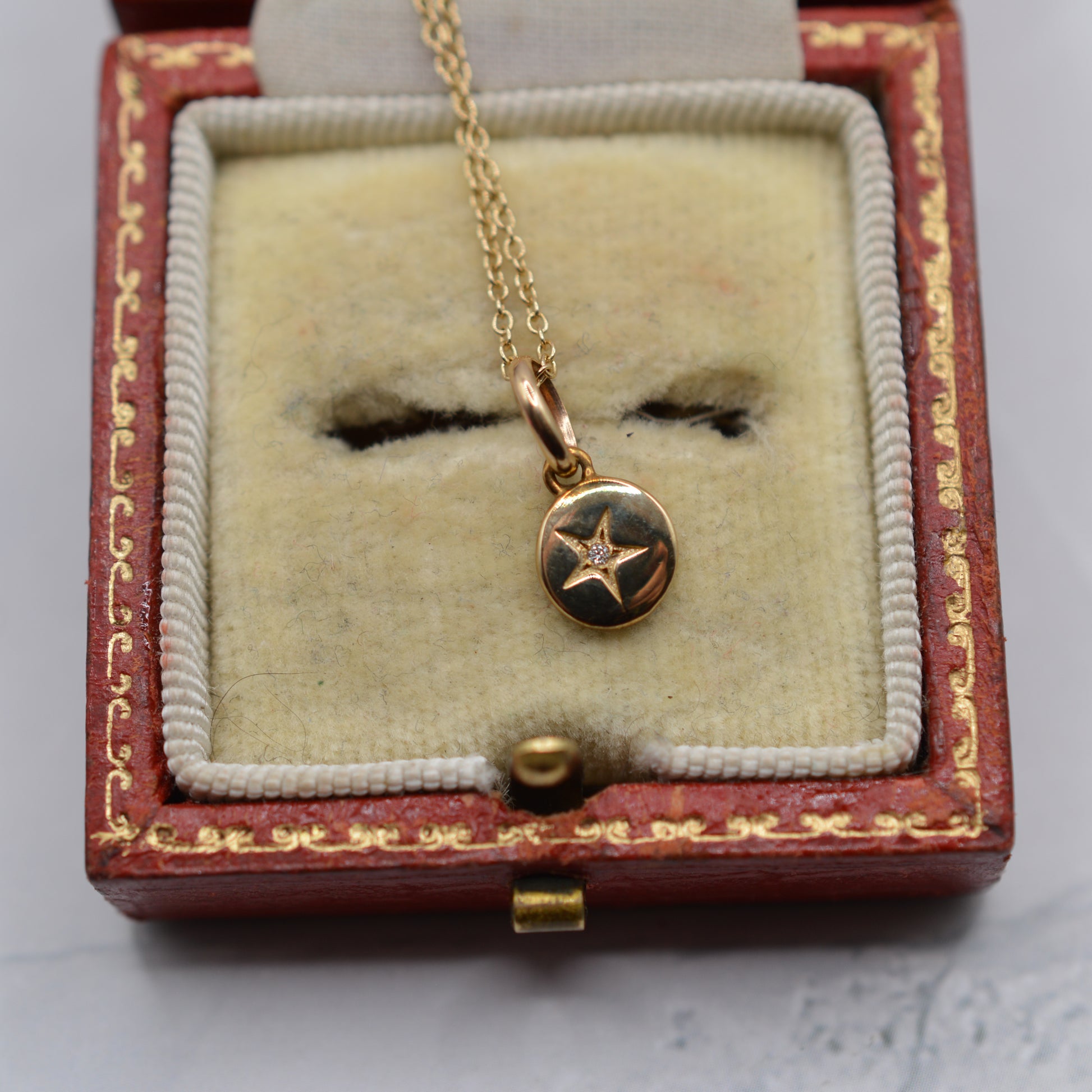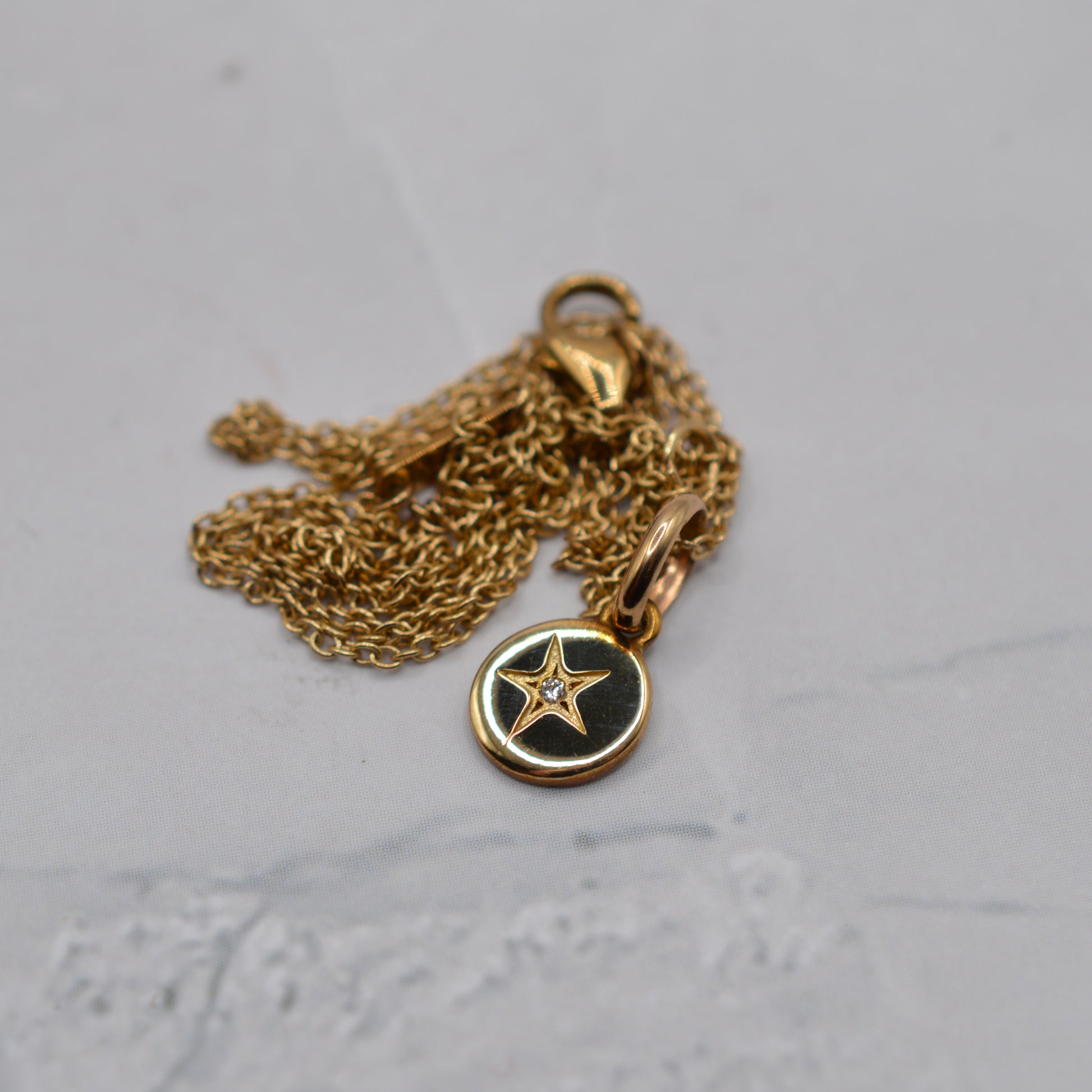 A charming 1990s 9ct gold pendant necklace from the marvellous Liberty London. This dainty piece features a small round pendant (approx. 6mm diameter) with a little star-set diamond, suspended from an 18” gold chain. The design is delicate and minimalist, making it perfect for everyday wear or it looks equally lovely layered with other gold necklaces.