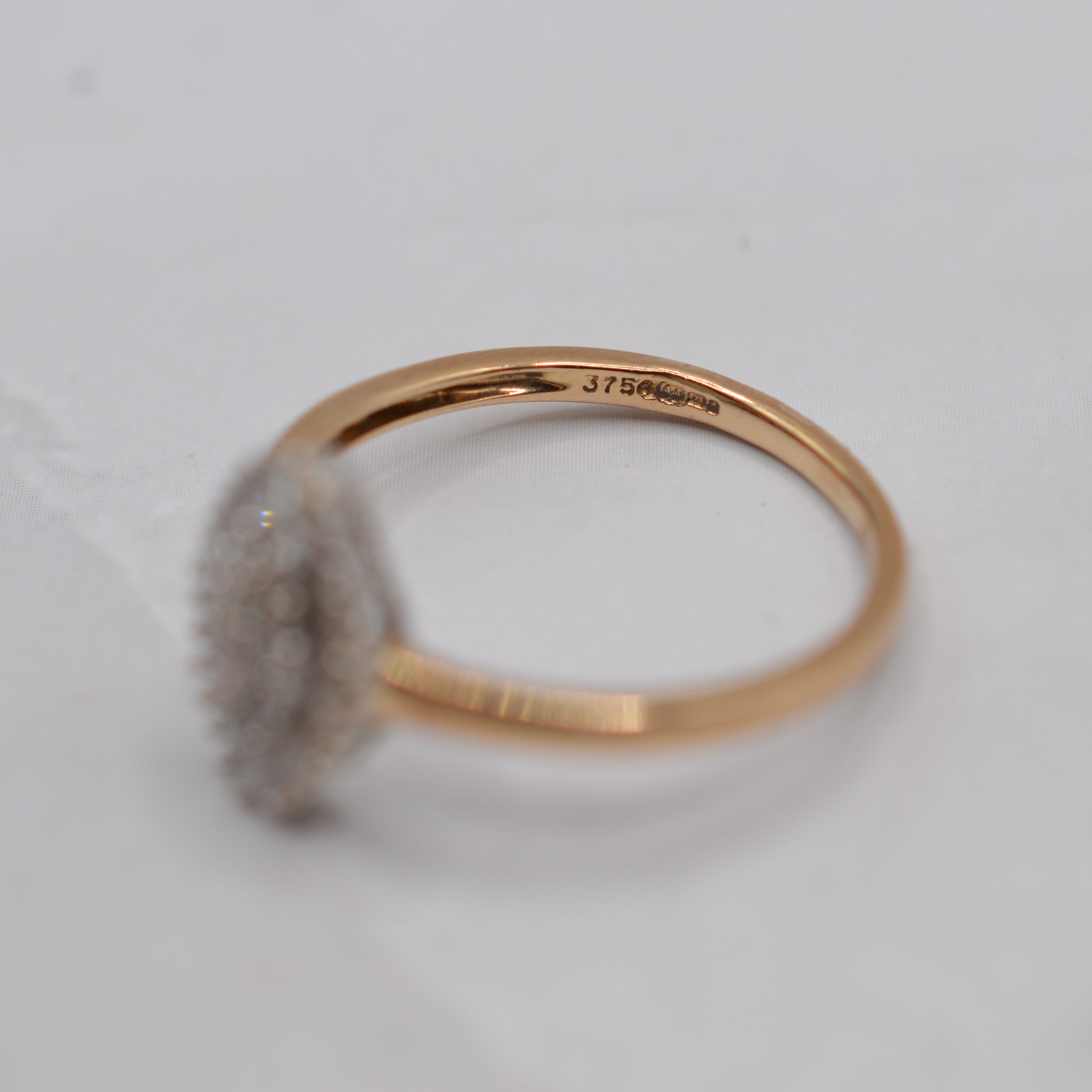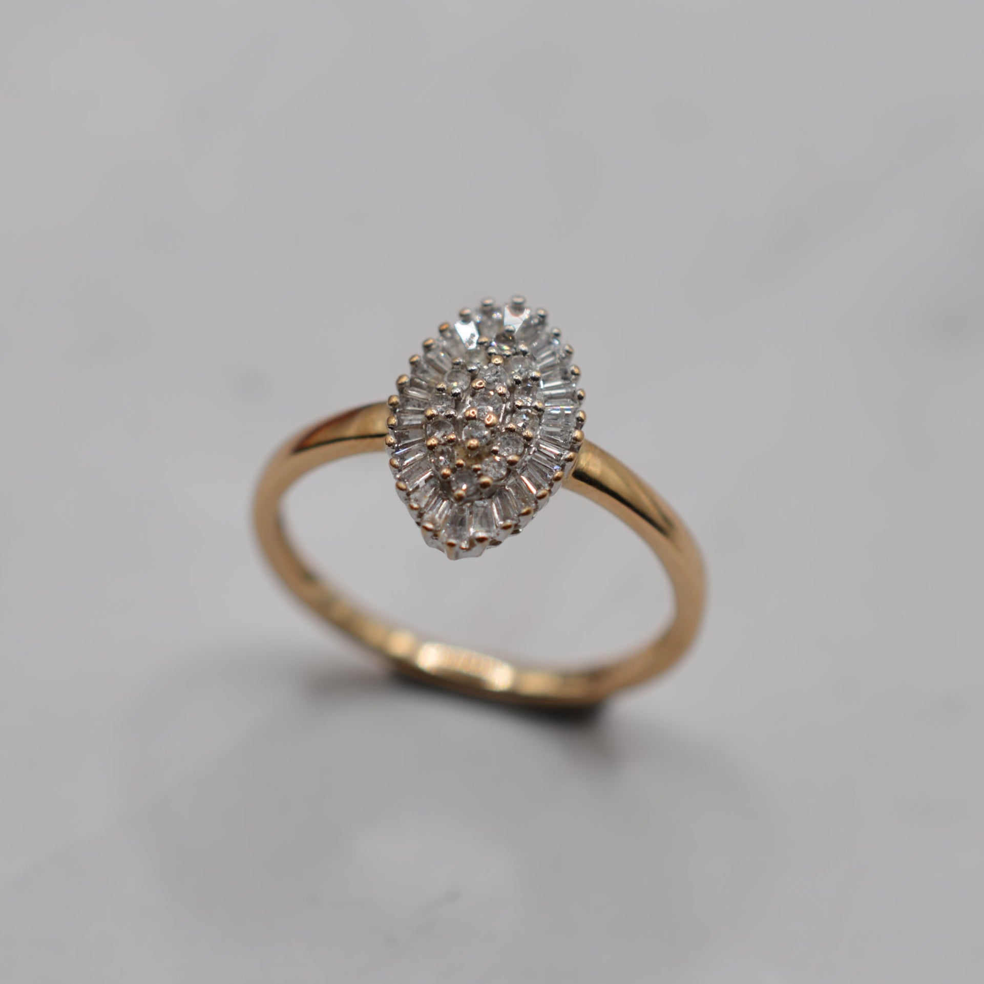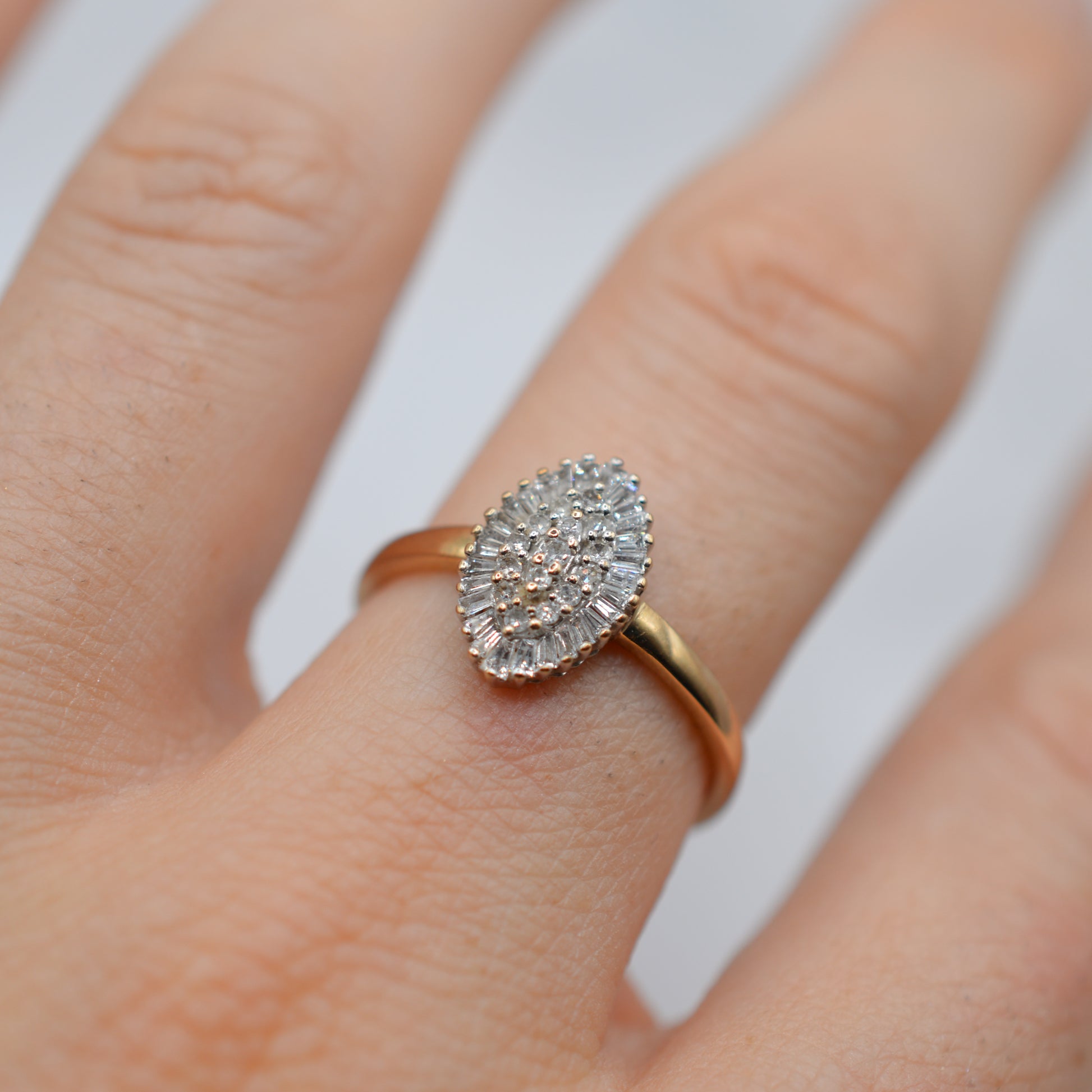 A rather beautiful 9ct gold diamond navette cluster ring with a touch of Art Deco elegance. This sparkling piece features a marquise-shaped cluster, with three central round diamonds framed by a border of further round diamonds, followed by a final border of baguette-cut diamonds. Together, they total approx. 0.25ct of diamonds, giving the ring a gorgeous shimmer. A stunning design that is perfect as a luxurious treat for yourself or makes a wonderful gift - perhaps an engagement or anniversary ring!