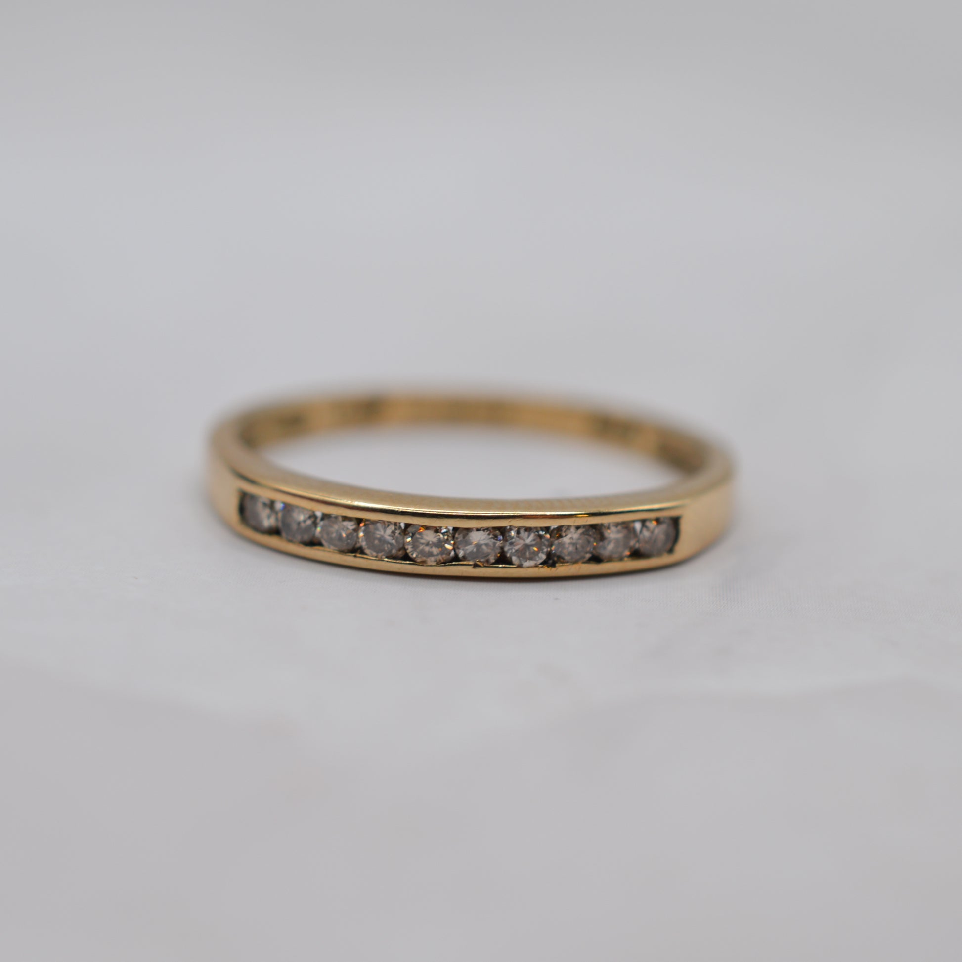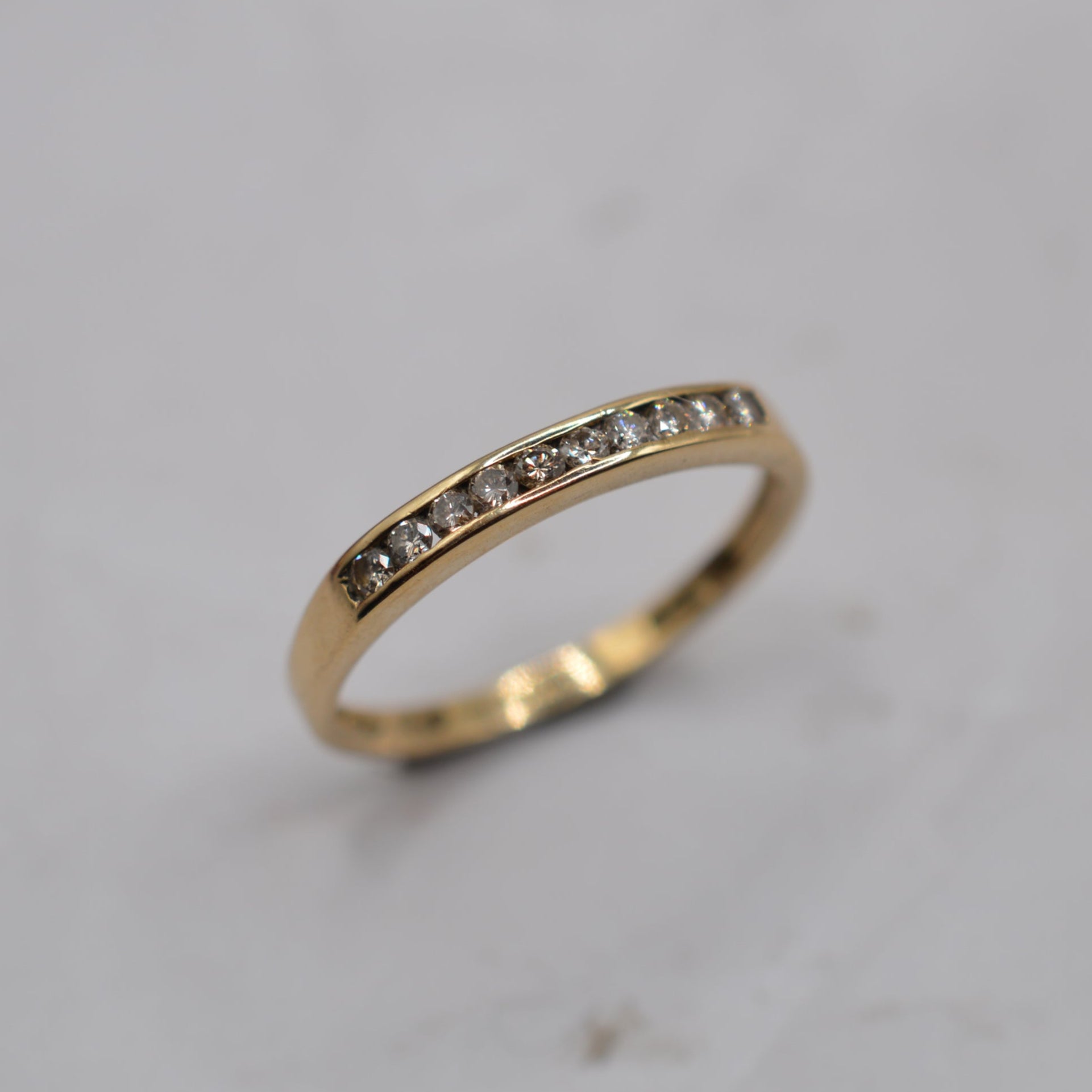 A sparkly and timeless 9ct gold diamond half-eternity ring. This classic design features a row of ten channel-set diamonds across the top of the shiny yellow gold band, with a total diamond weight of 0.25ct. A gorgeous minimalist ring on its own or perfect for stacking, with lovely sparkle from every angle.