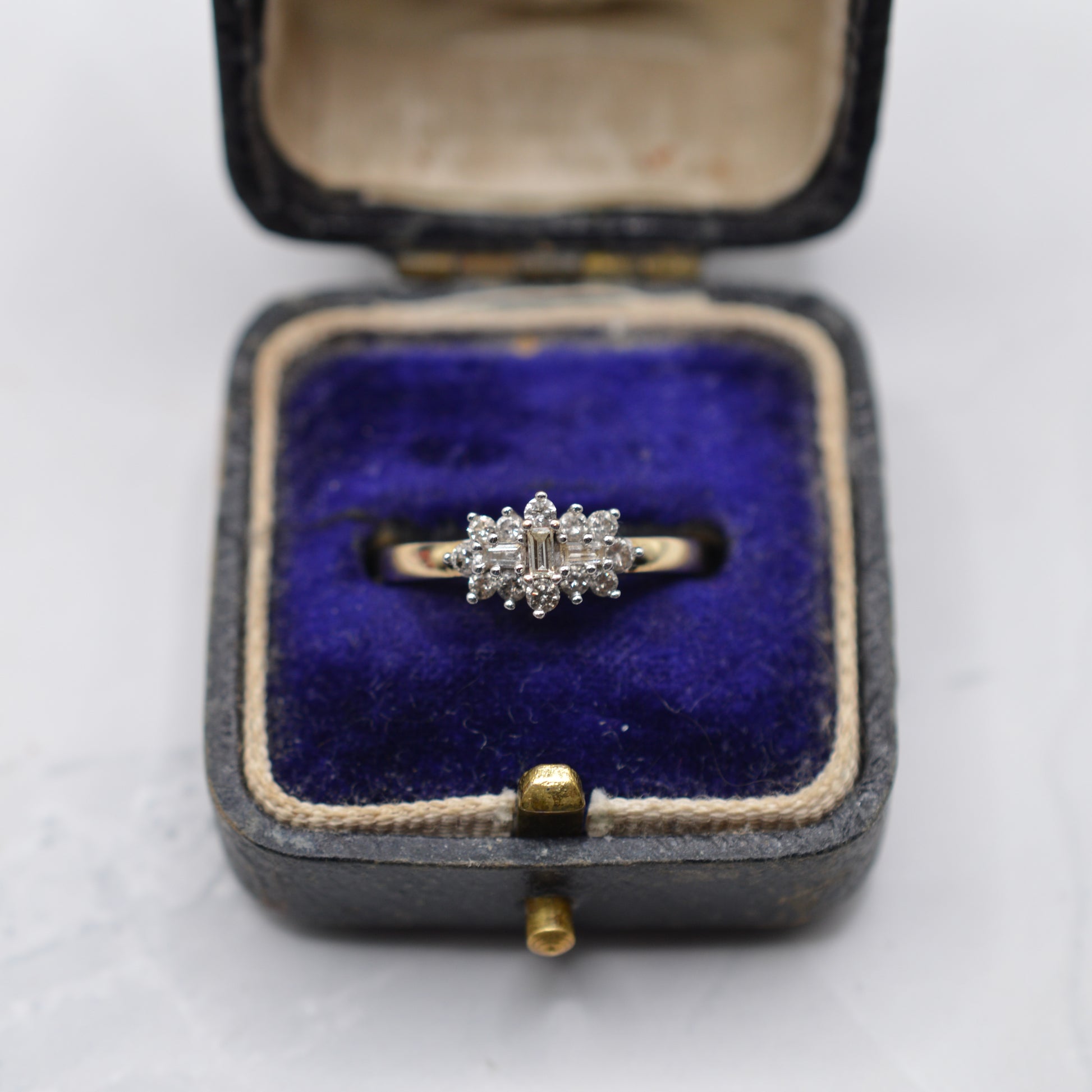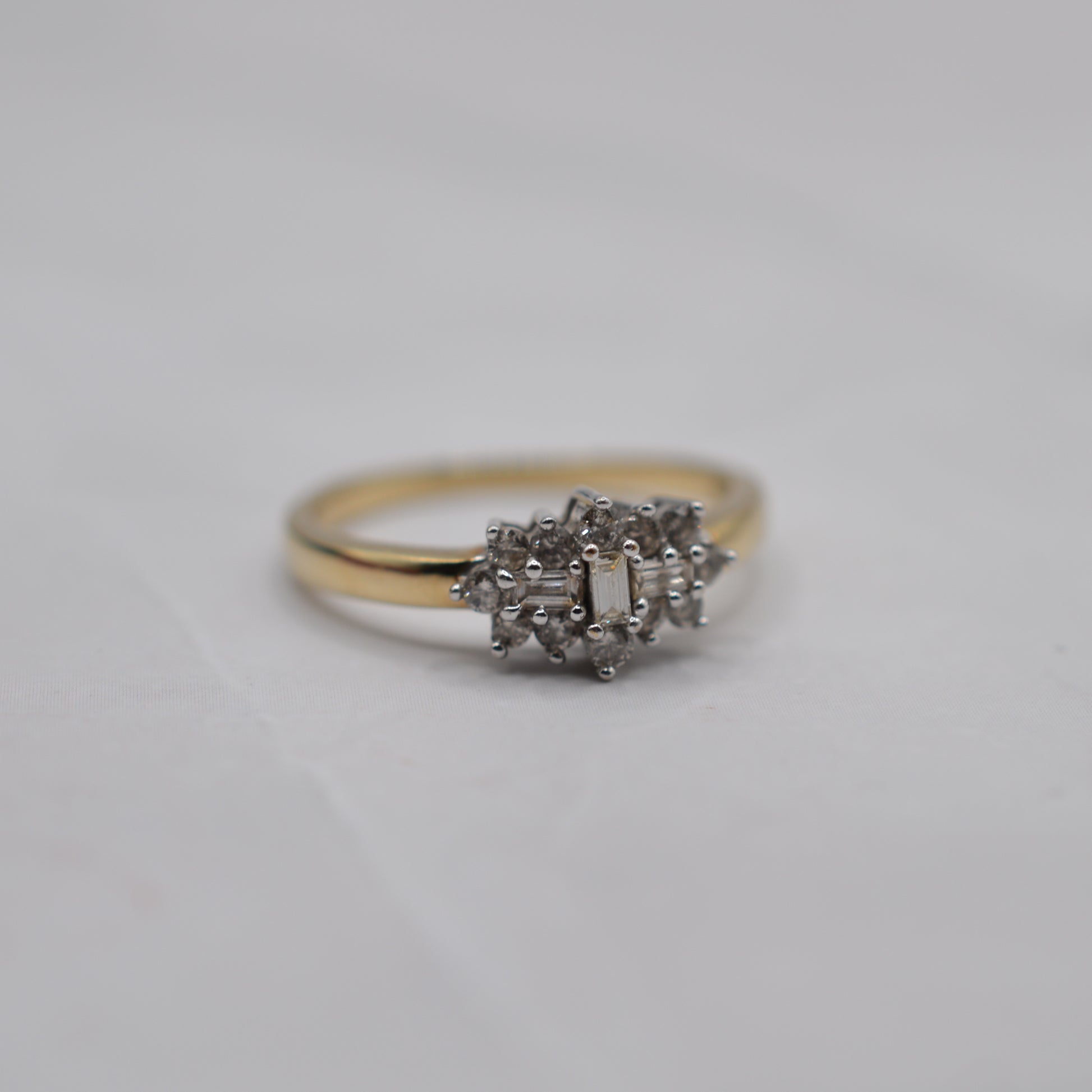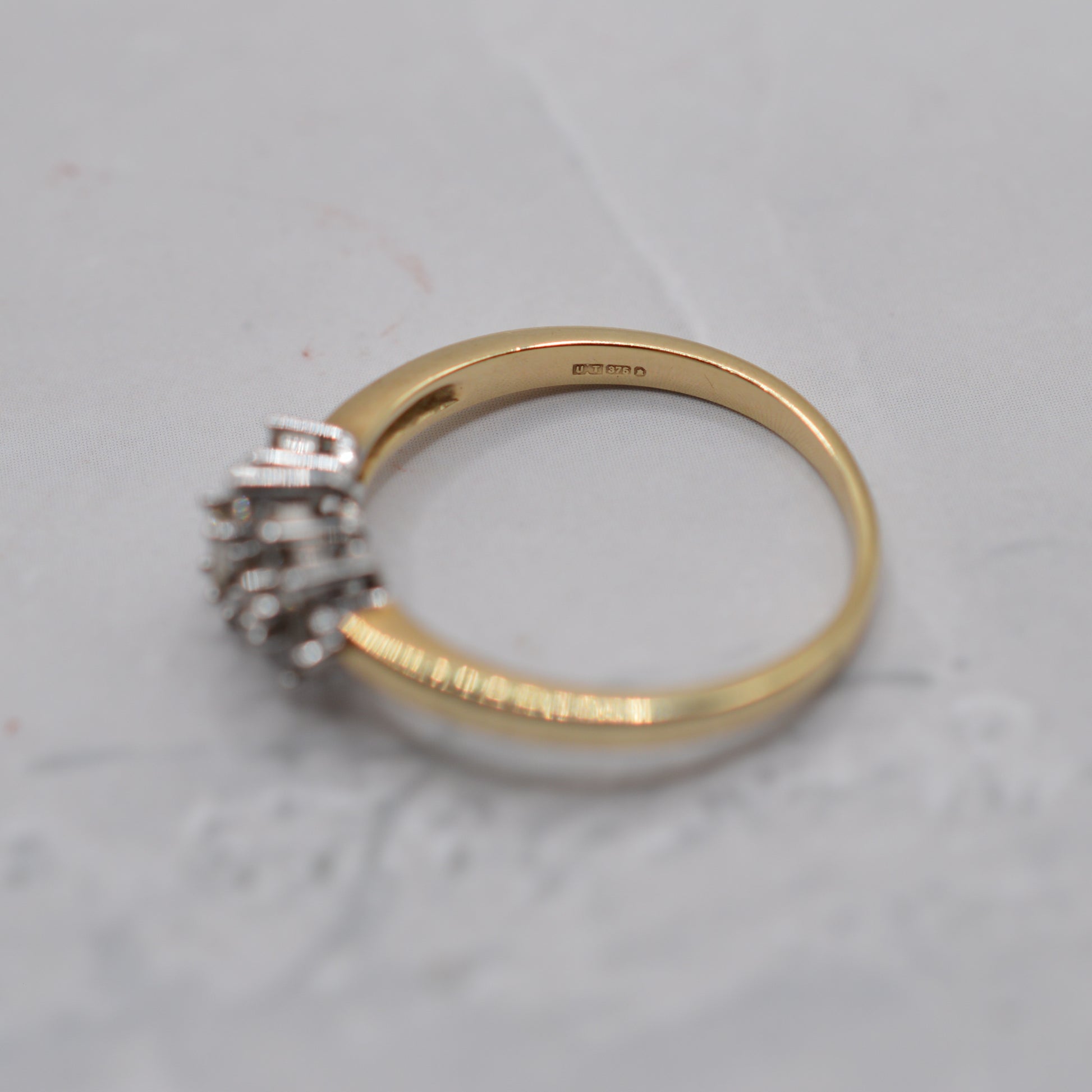 A very pretty and slightly unusual 9ct gold diamond cluster ring! This elegant piece features a gorgeous central arrangement of three baguette-cut diamonds (two set horizontally around a vertical), framed by a halo of sparkling brilliant-cut round diamonds. The mix of cuts gives the ring a subtle Art Deco-inspired feel, full of sparkle and symmetry.