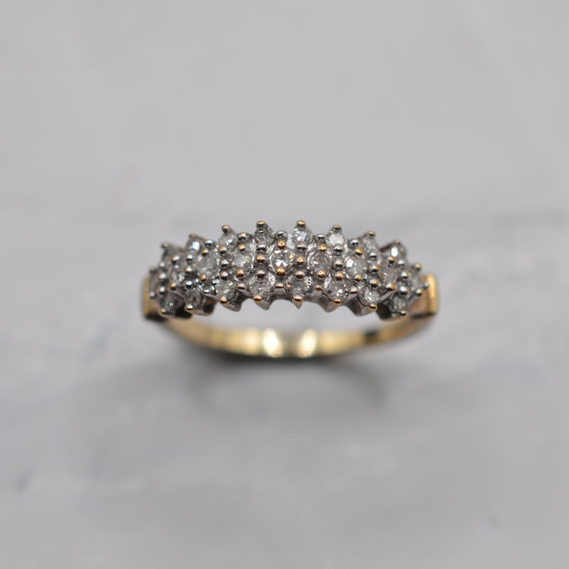 A very pretty 9ct gold diamond triple-row ring. This sparkling piece features three rows of twinkling diamonds, lined in a half-eternity arrangement and weighing 0.25ct in diamond weight. A sweet, versatile piece that looks lovely worn alone or stacked with other rings.