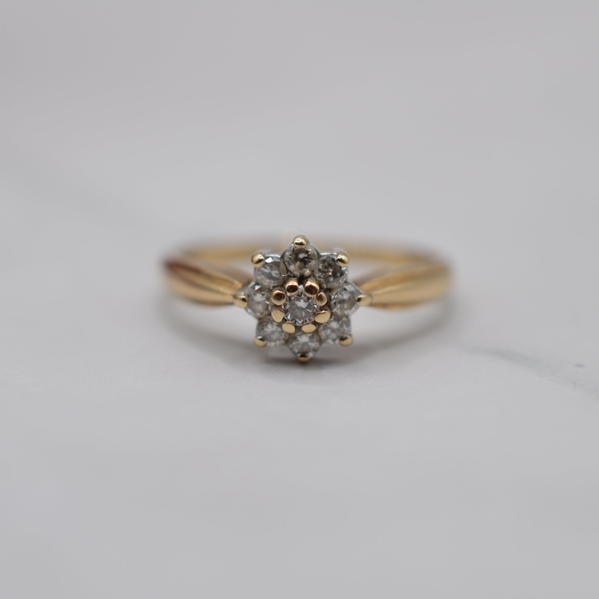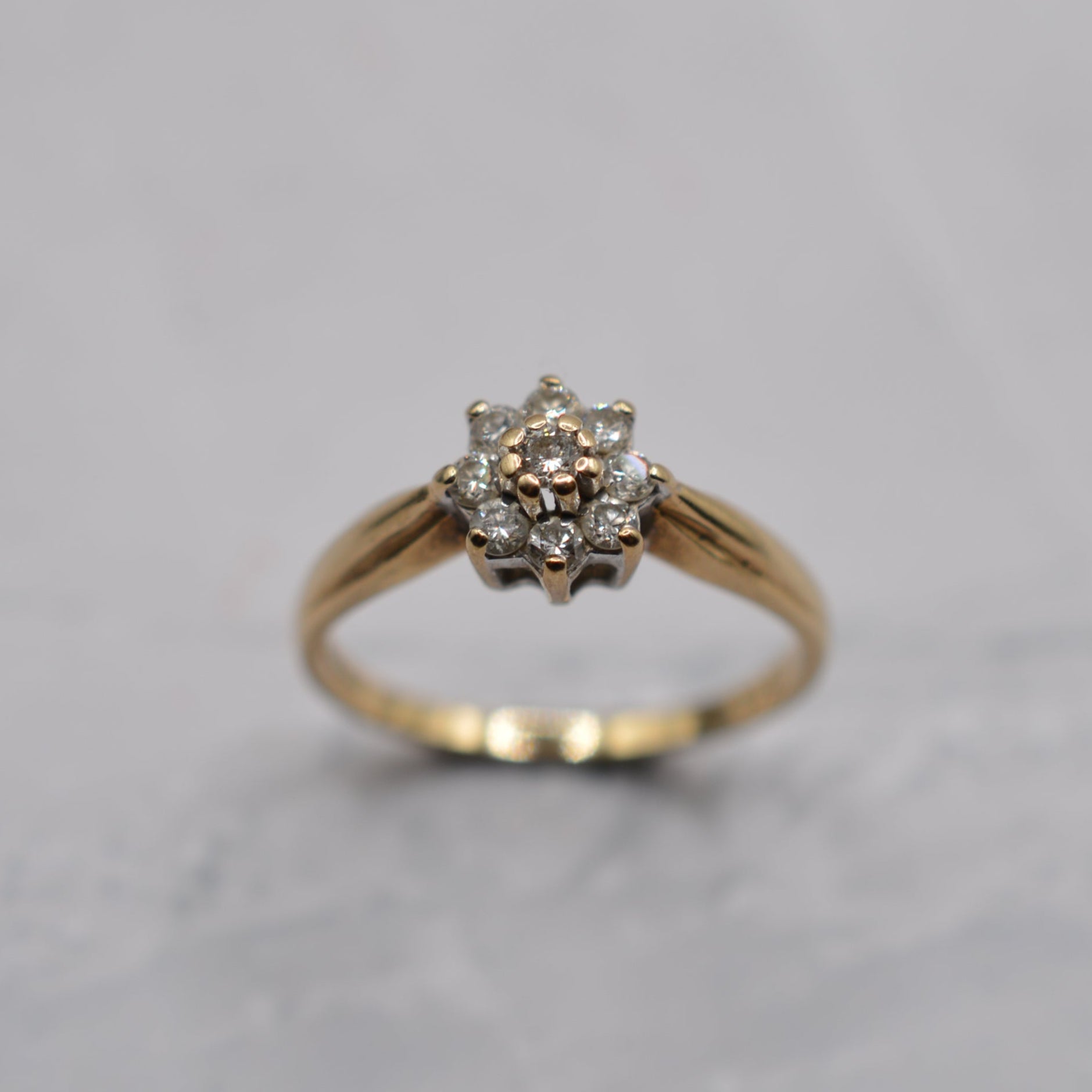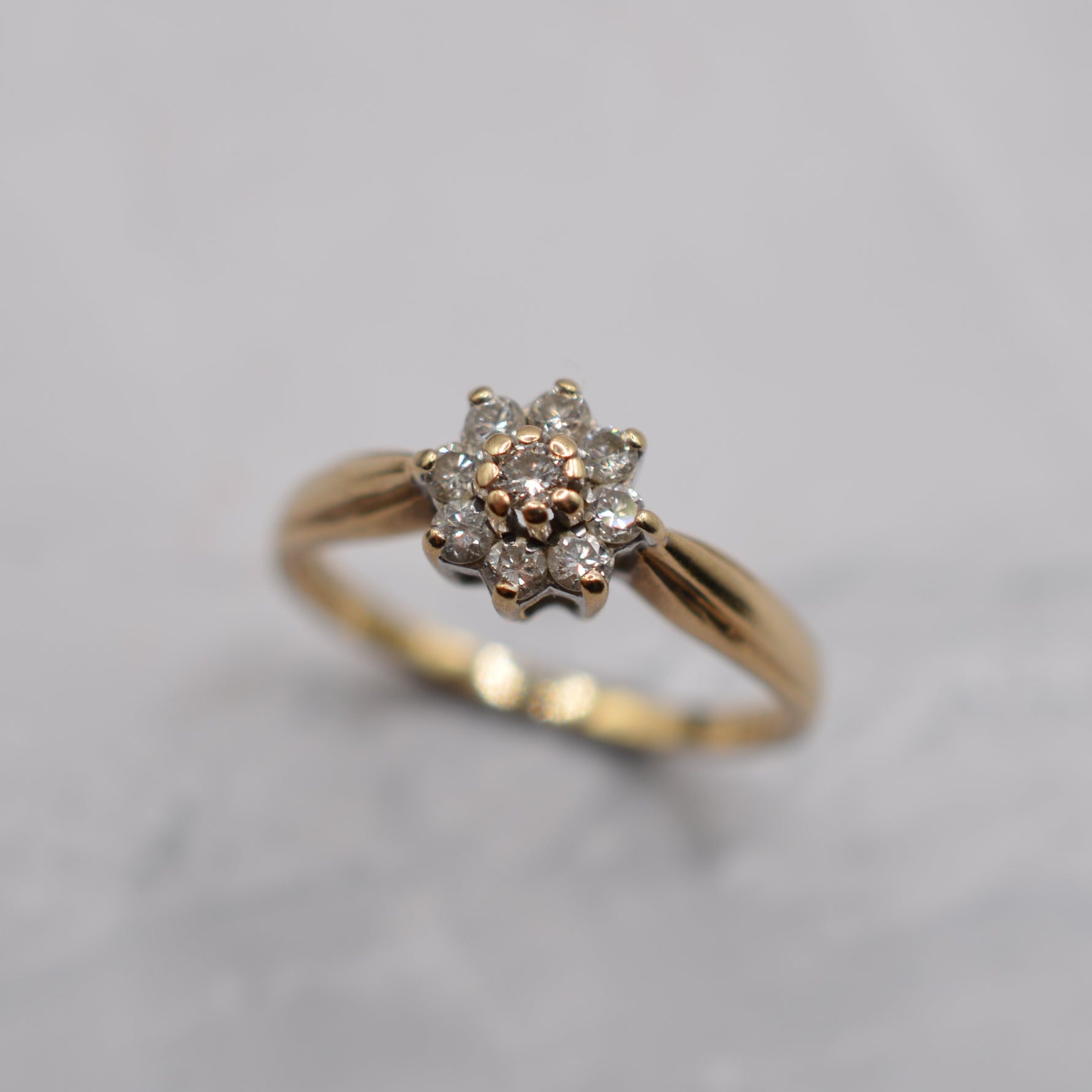 A rather sweet 9ct gold diamond floral cluster ring. This adorable design features a central diamond surrounded by six further stones in a classic flower-style cluster. The diamonds total approx. 0.25ct, with lovely sparkle that give this cute ring a bright little dazzle at every angle.