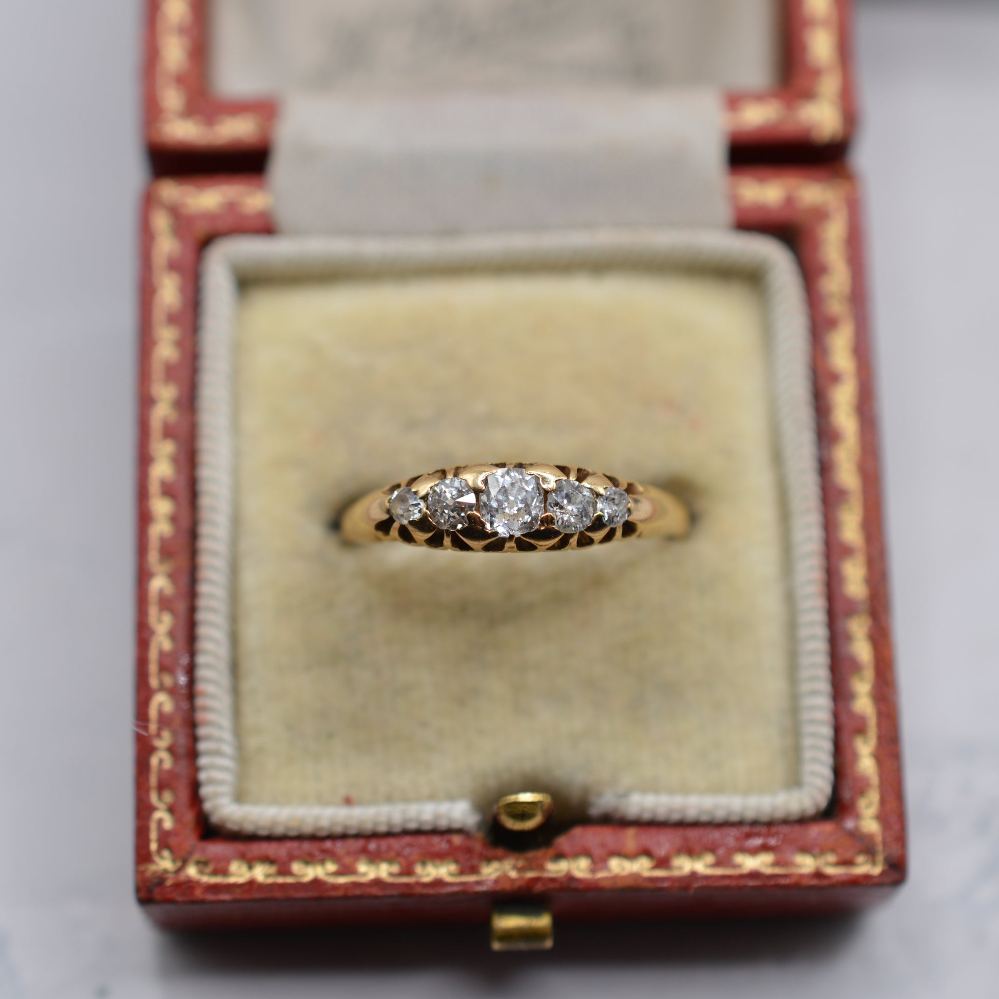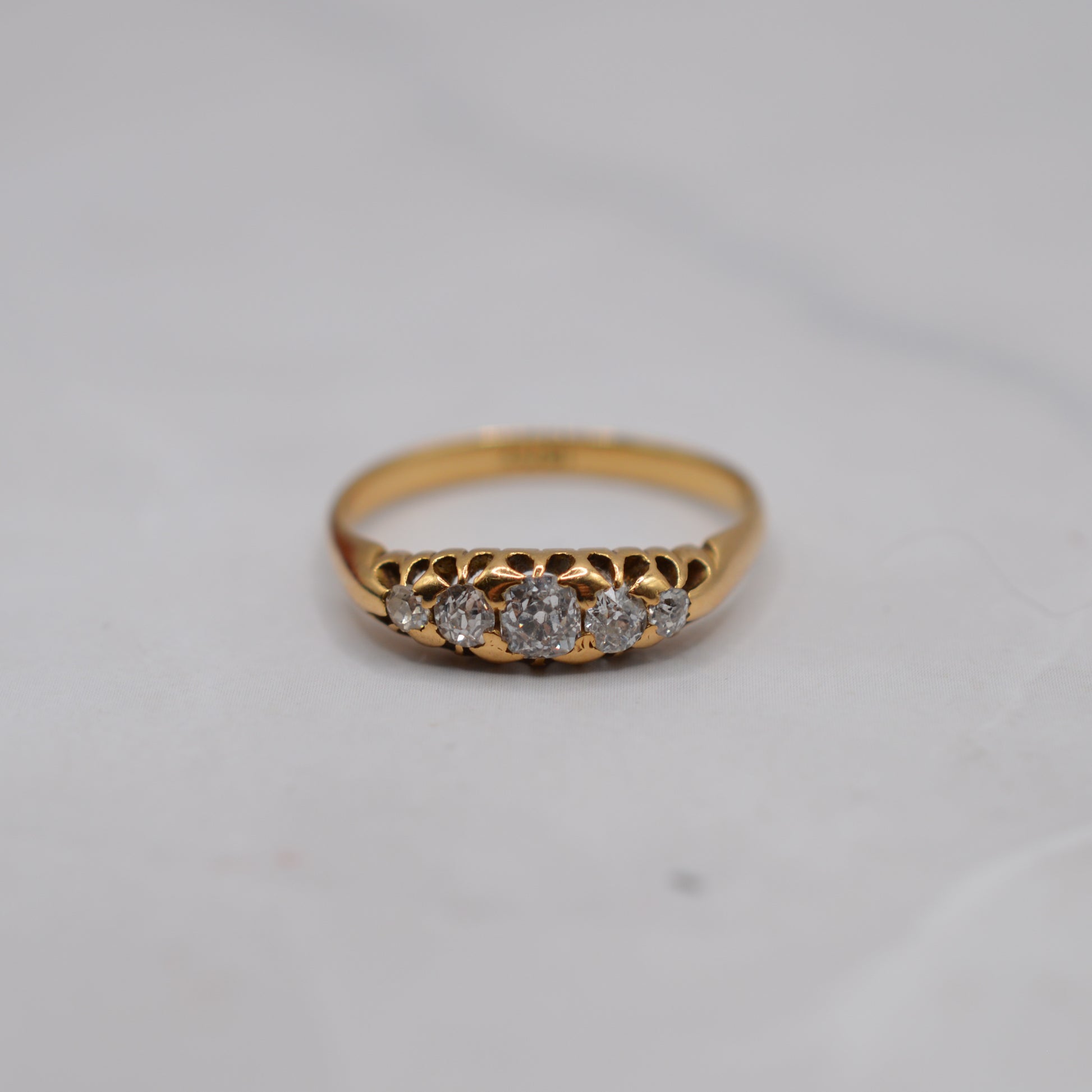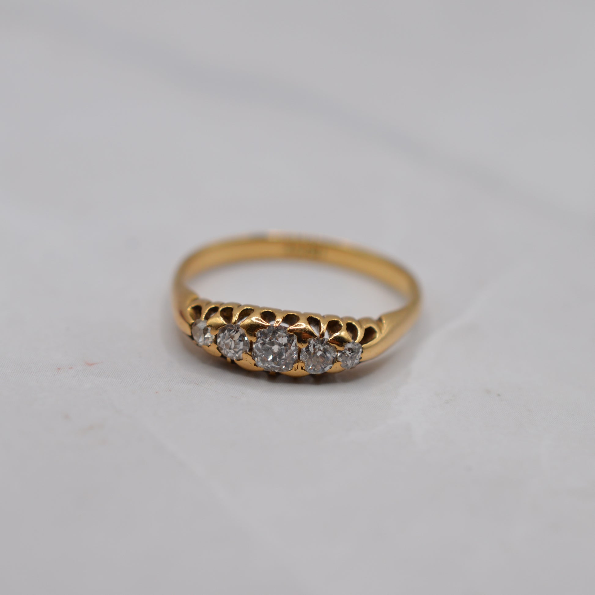 An utterly beautiful antique 18ct gold diamond five-stone ring. This early twentieth-century treasure features five old mine-cut diamonds arranged in a boat-style setting, with the largest stone sitting at the centre. The diamonds are bright and lively, together totalling approximately 0.40-0.50ct. A truly fabulous antique diamond ring that would make a wonderful self-treat, a gorgeous engagement ring or a classic heirloom piece.